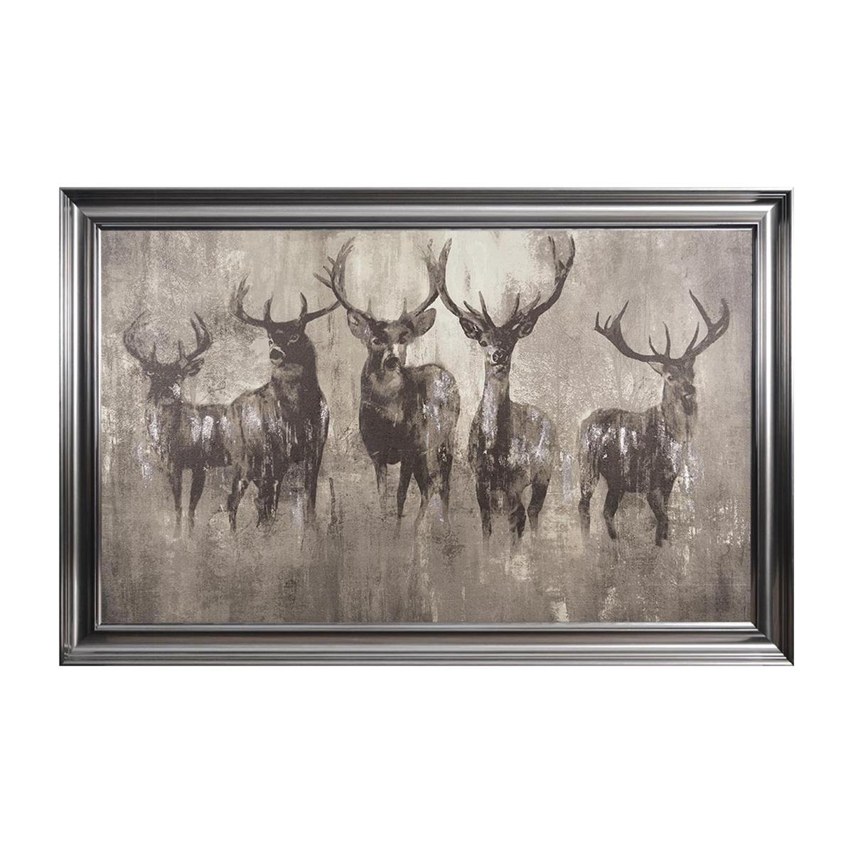 Viewed across a misty landscape, five beautiful stags stand proudly against an evening sky. Painterly brushstrokes give this piece a wonderful realism and naturalistic quality. Why you'll love it. Five majestic stags dominate this stunning piece of framed art. Naturalistic style with a painterly feel. Subtle and sophisticated colour palette. Presented in a metallic frame. Creative and beautifully crafted wall art. Handmade to order in the UK. This piece of framed art is part of the Furniture Village accessories collection. What you need to know. Indoor use only. Do not use wire or string to hang. Hanging instructions supplied with artwork. Dimensions. Height: 74 cm (30 in). Width: 114 cm (45 in).