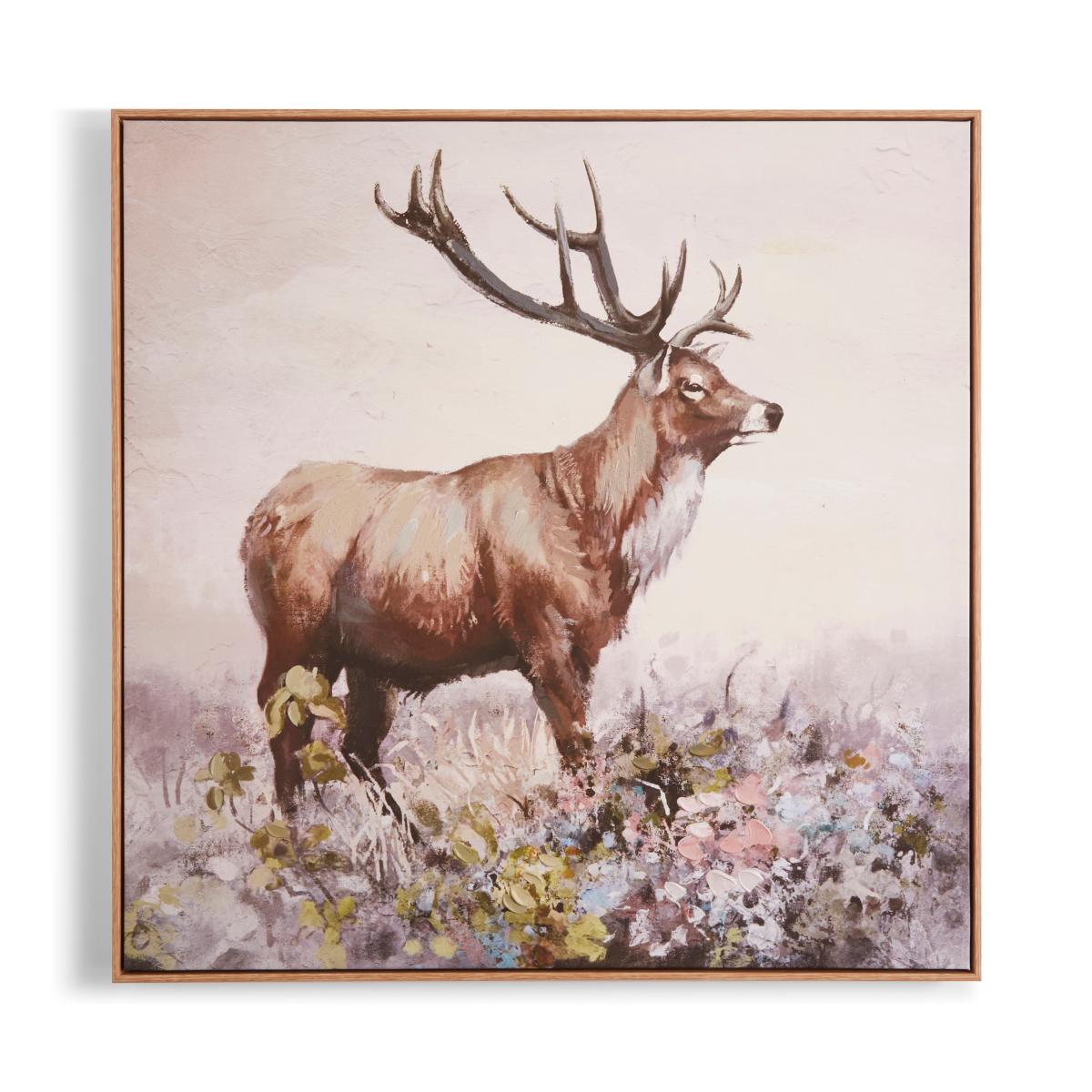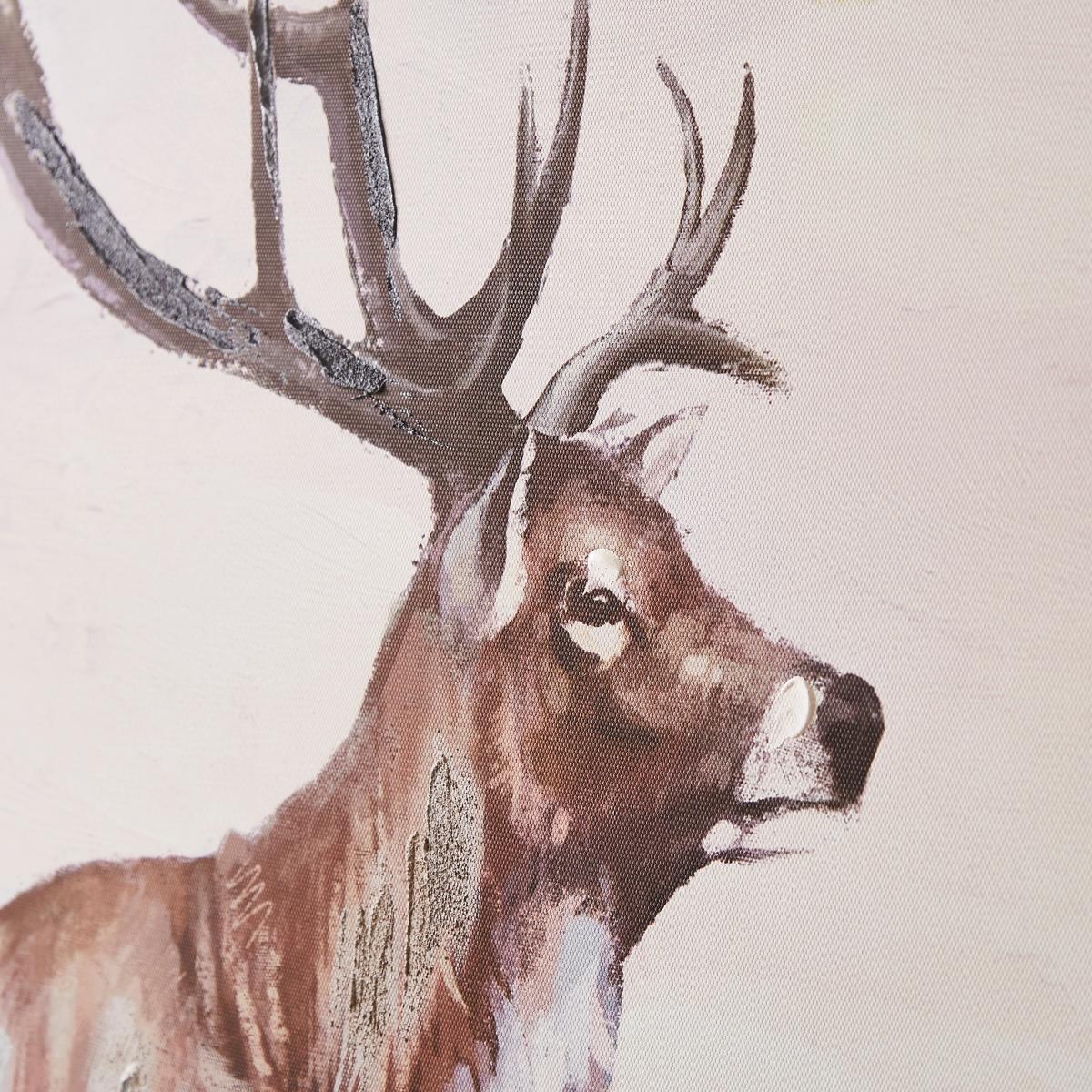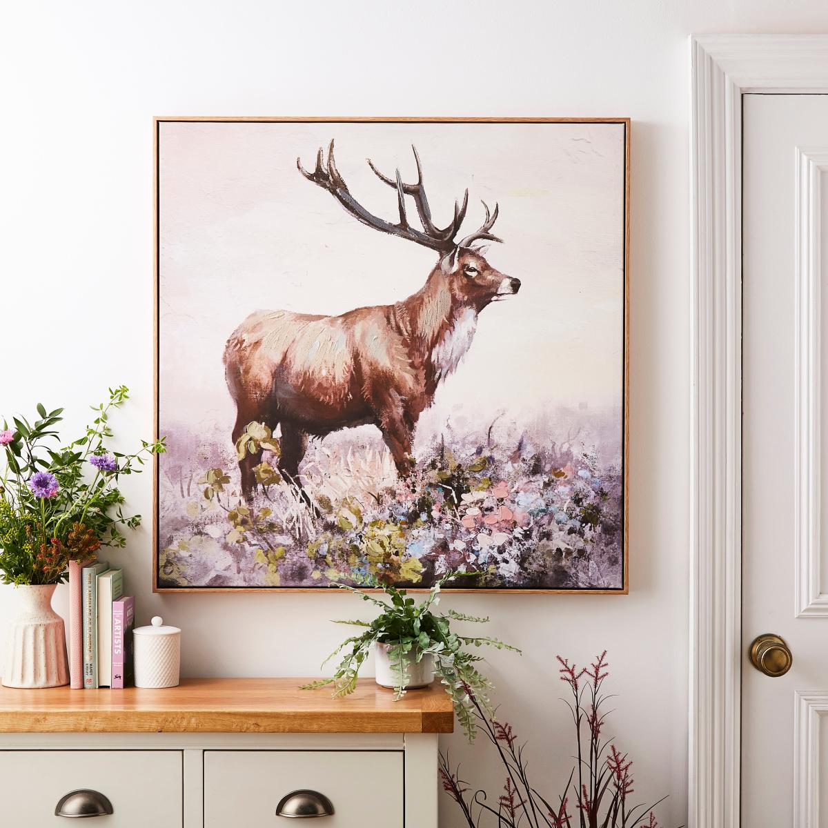 I love this stag print for its understated elegance and natural tone. It works particularly well in rustic, Scandinavian, or contemporary interiors where neutral palettes and organic textures are celebrated. The canvas's warm, earthy hues make it versatile for living rooms, bedrooms, or even hallways, adding a touch of nature without overwhelming the space. Practical styling tips include pairing it with soft textiles, like linen or wool, and keeping surrounding accessories simple to let the artwork shine. It also lends itself well to display in a gallery wall alongside botanical prints or framed photographs for a cohesive, nature-inspired look.