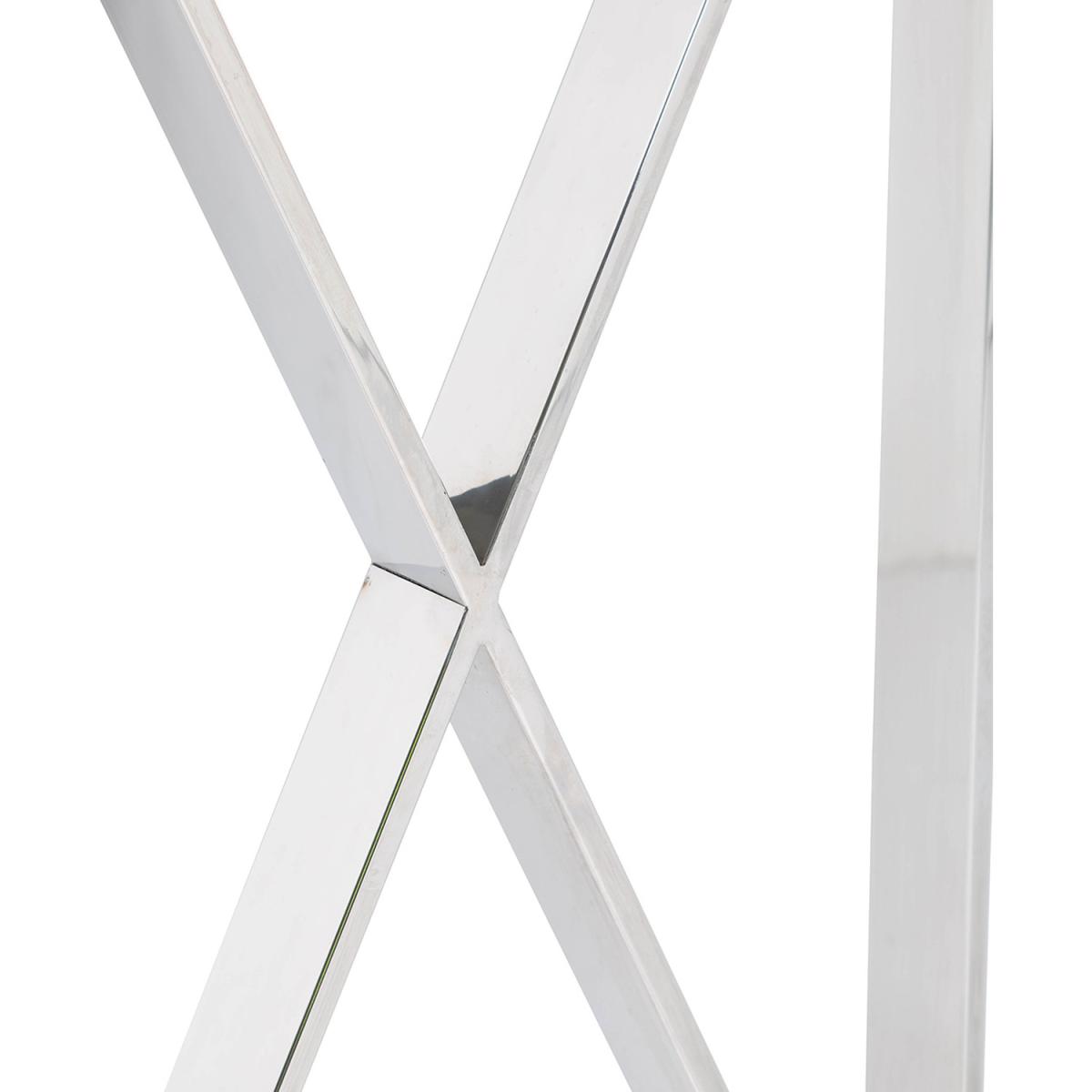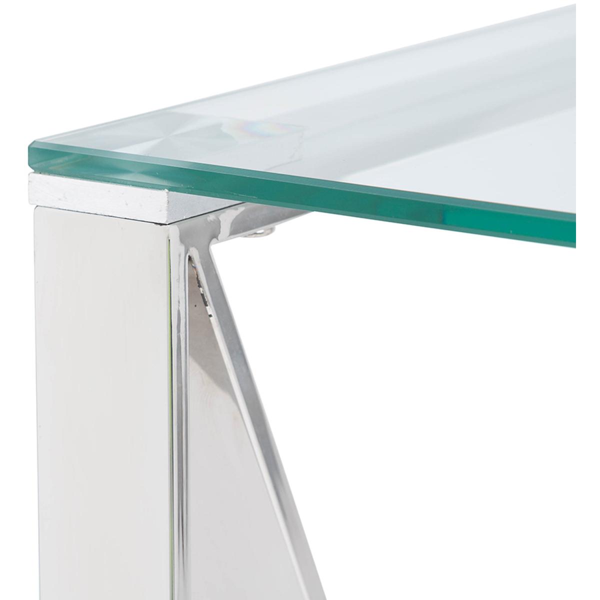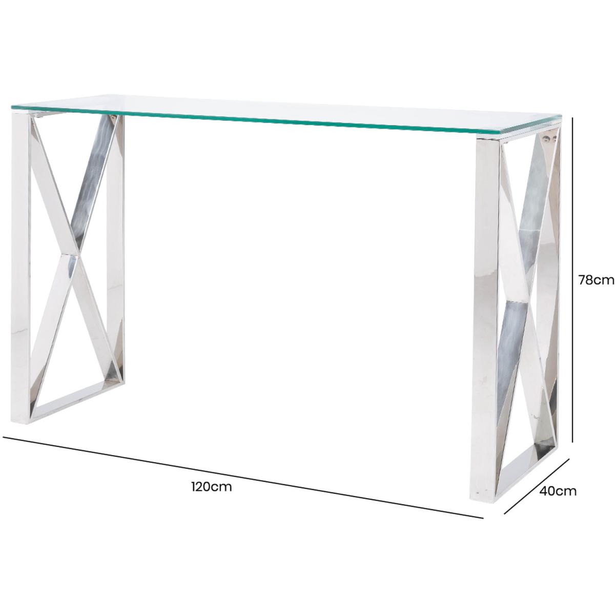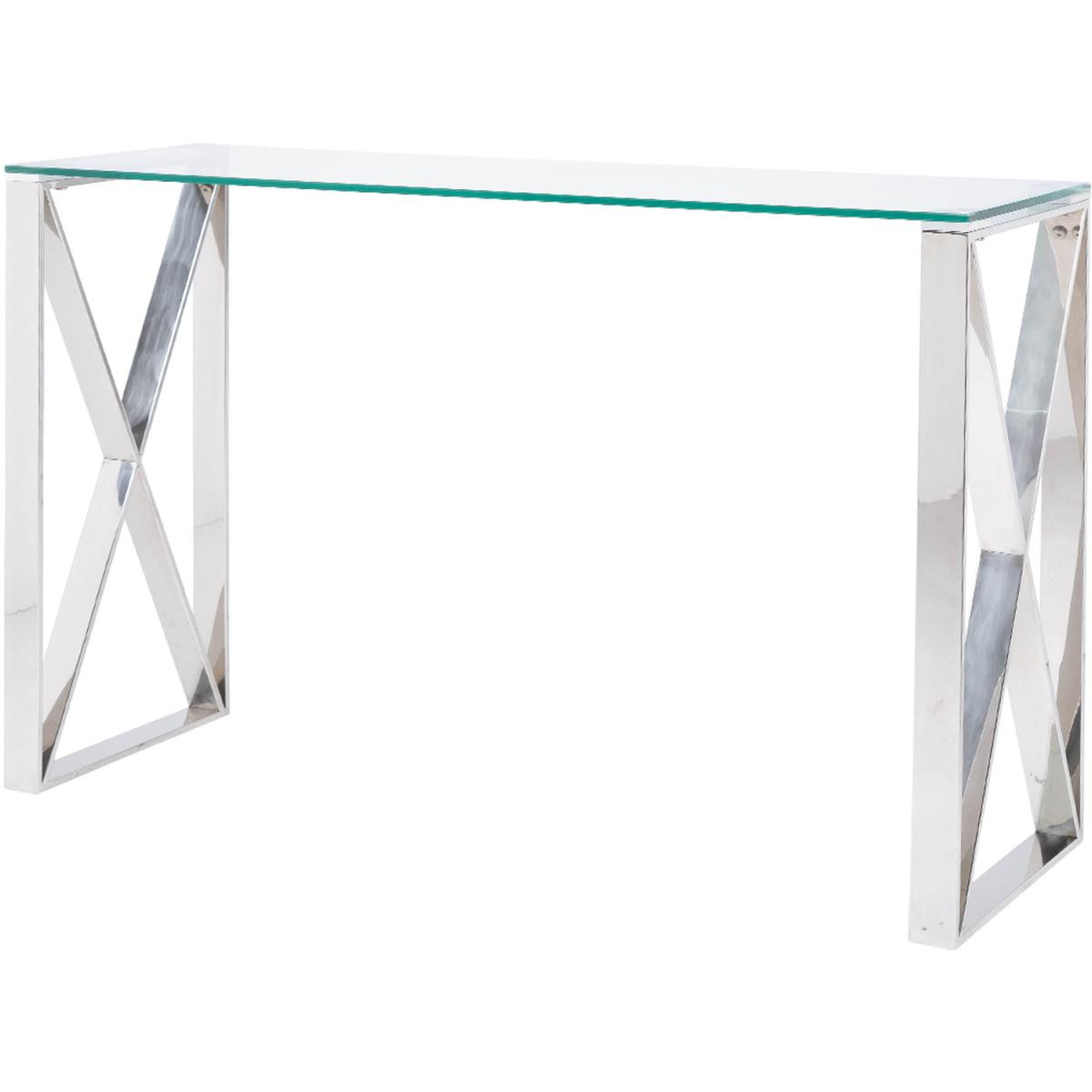 Fill your living space stylishly with this Zenith rectangular clear glass and stainless steel console table. This simple, yet elegant, console table features a clear glass top and sturdy stainless steel X shaped design on the ends of the base. This versatile piece would work equally well as a writing desk, work station or dressing table