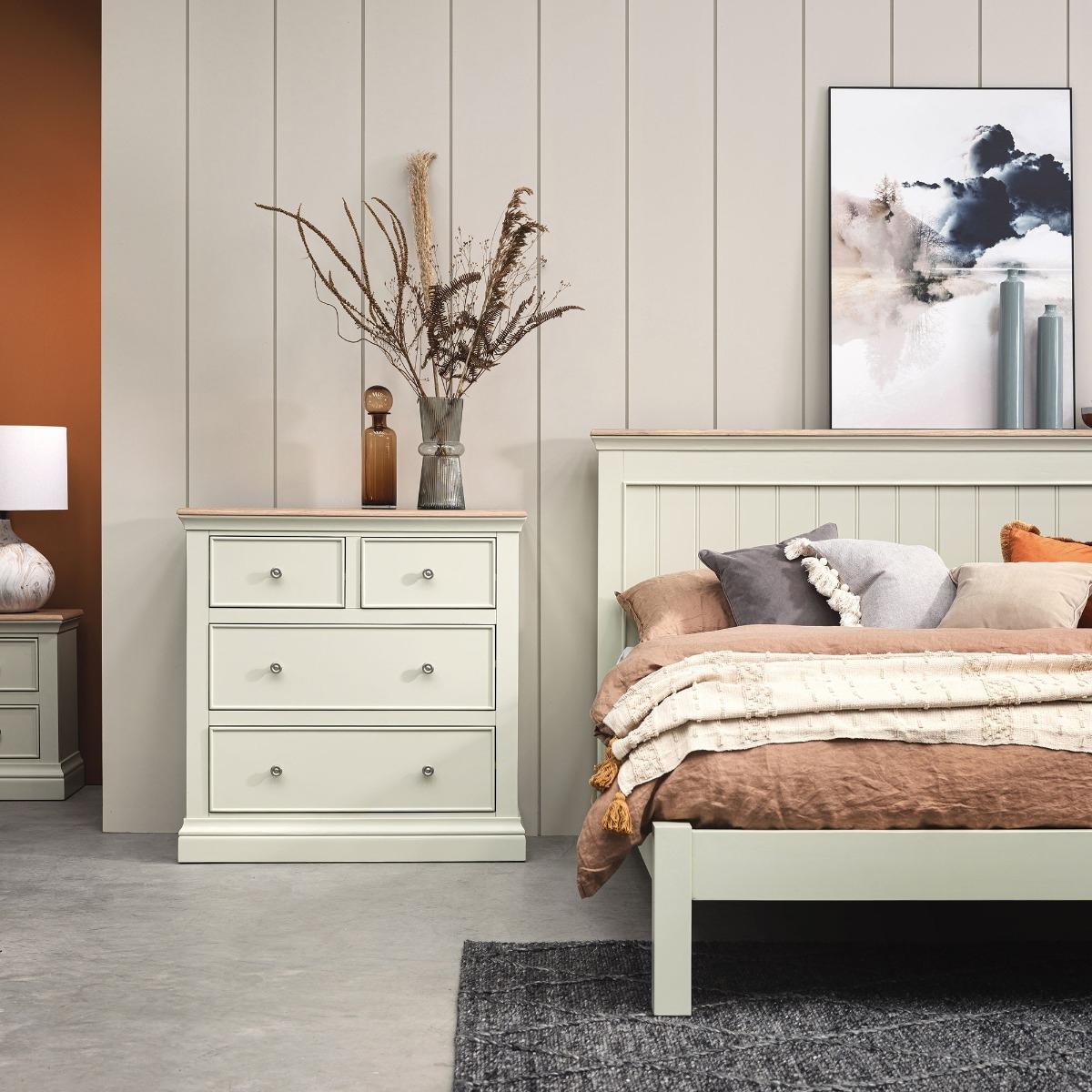 I love this piece for its versatile neutral oak finish, which makes it easy to incorporate into a range of interiors, from Scandi-inspired schemes to classic or country styles. Its clean lines and compact 2+2 drawer layout provide practical storage without feeling bulky, making it ideal for bedrooms, hallways or even living spaces. Styling tips include pairing it with soft textiles and understated accessories for a relaxed look, or contrasting it with textured fabrics and metallic accents for a more polished vibe. It works particularly well when teamed with other wood tones or in monochrome schemes, helping to keep the space feel light and welcoming.