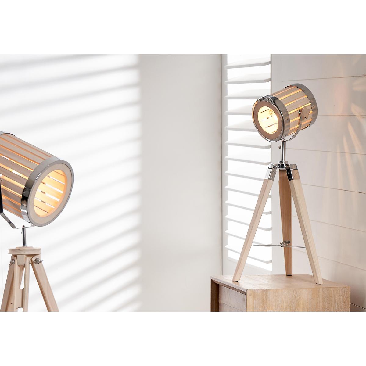 Beautifully crafted and unique in style, this marine-inspired tripod table lamp is eye-catching and versatile. Perfect in a living room or even as a table lamp in a coastal-themed bedroom. Why you'll love it. Wonderfully detailed tripod table lamp is a real talking point. Charming nautical style. Natural wood and metal finish. Slatted marine lamp head casts a lovely diffused light. This table lamp is part of the Furniture Village home accessories collection. What you need to know. Base is made of whitewashed pine. Shade is made of iron with a nickel finish. Requires 1 x SES/E14 Golf Ball 9W LED, not supplied. Supplied with a 1.9 m cable. Inline switch. Please always use the correct light bulb for this table lamp to avoid overheating. Dimensions. Height: 67 cm (27 in). Depth: 30 cm (12 in). Width: 30 cm (12 in).