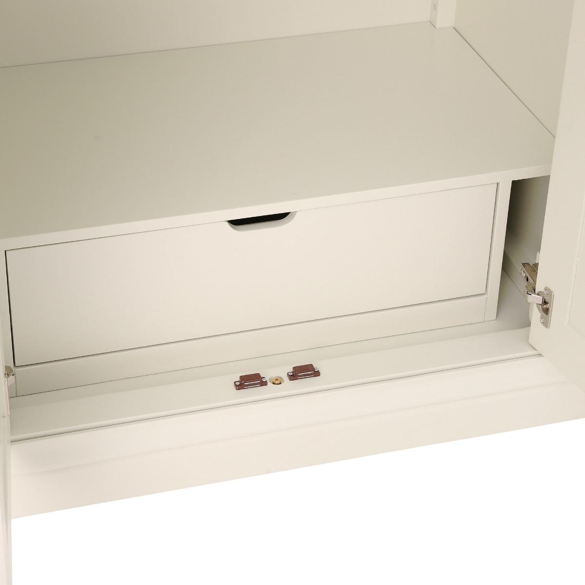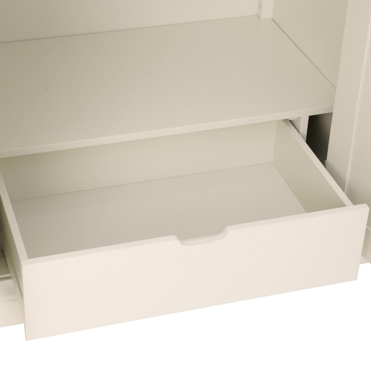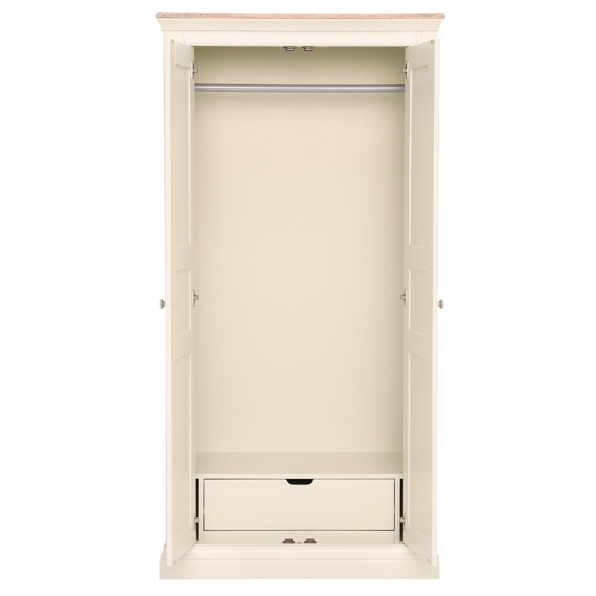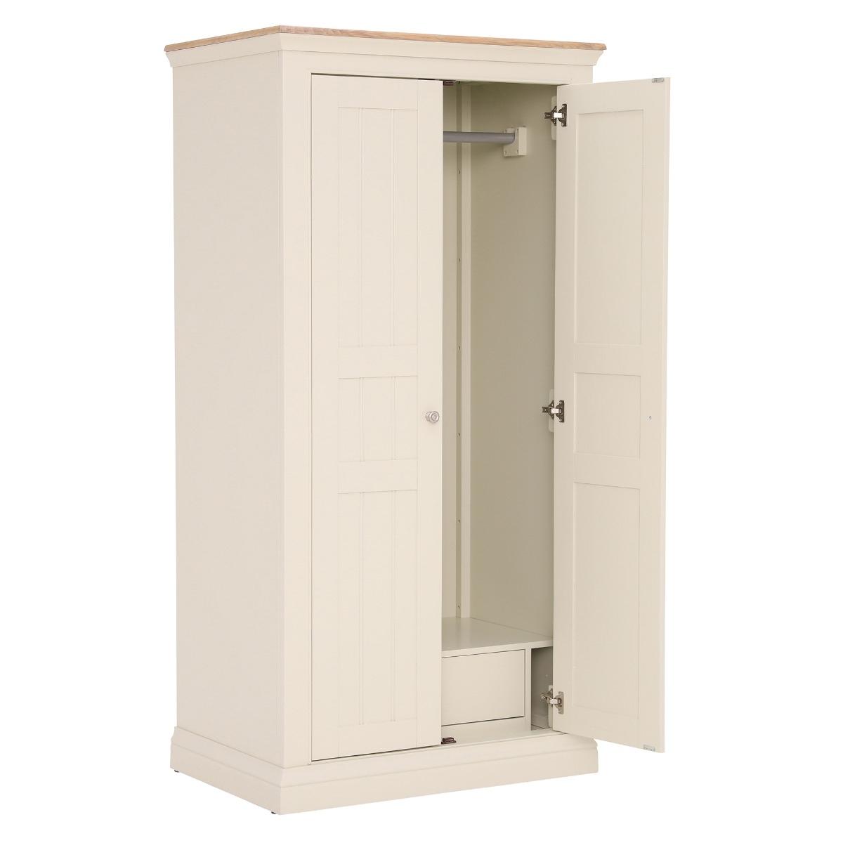 Design. A classic wardrobe with clean and simple lines. The Staithes Wardrobe is part of a comprehensive range constructed from oak and acacia wood for a timeless design. Rounded silver handles to the front of each door, add a modern feel to the ecru painted wood and boxy shape of this piece. Fitted with a single hanging rail and sliding drawer to the base, Staithes will provide an abundance of space to store your belongings.