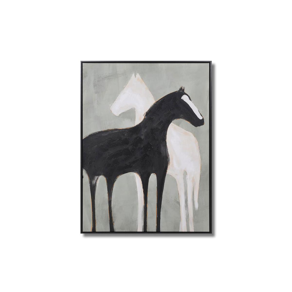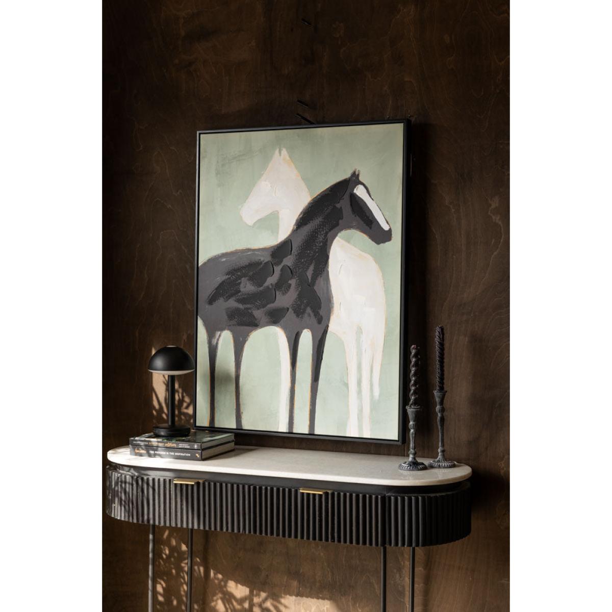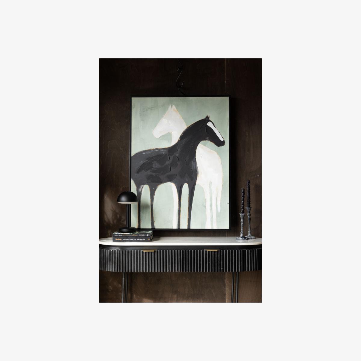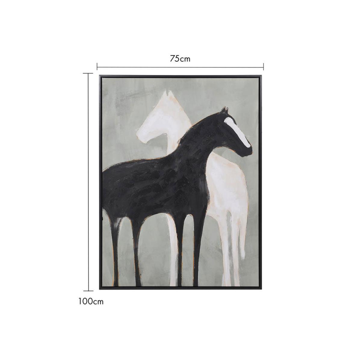 <!--td --> The beauty of this piece of wall art is its simplicity - we love the striking contrast of the black and white horses against not only each other, but also the green background and slim black frame. The textured finish adds a tactility to this that feels perfect in a piece that represents living creatures – it invites you to reach out and touch in a way you might feel moved to stroke a real horse. There’s a Lowry-esque look and feel to this that makes a virtue of a spare, more pared-back approach to art, while the closeness of the horses conveys an understated warmth and feeling of togetherness. Style this against a dark, block colour wall or as part of a gallery, or alternatively, rest on a sideboard or console table to create the perfect backdrop for trinket trays, favourite plants and family photographs. A beautiful piece that’s as engaging as it is versatile, experiment to find the best place for it in your home and enjoy for years to come. - Stallion Shadow Canvas Art Print - Material: Pine frame, Canvas - Measures: H100cm x W75cm