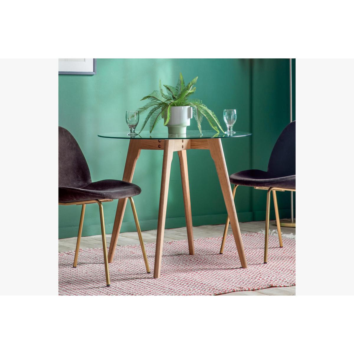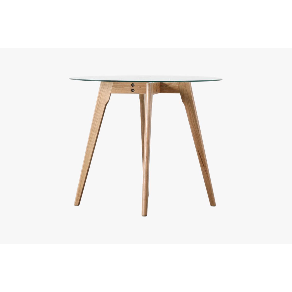 I’m a fan of this round oak table for its clean, angular legs and lightweight glass top - together they balance natural warmth with a streamlined silhouette. The tempered glass is practical for everyday use and makes the piece feel less bulky in smaller spaces. It suits Scandi-inspired, modern-industrial or contemporary cottage schemes. To style, mix muted-tone chairs around it, lay a simple linen runner down the middle and place a low, centred vase of foliage. A natural jute rug underneath will define the dining zone and soften sound.