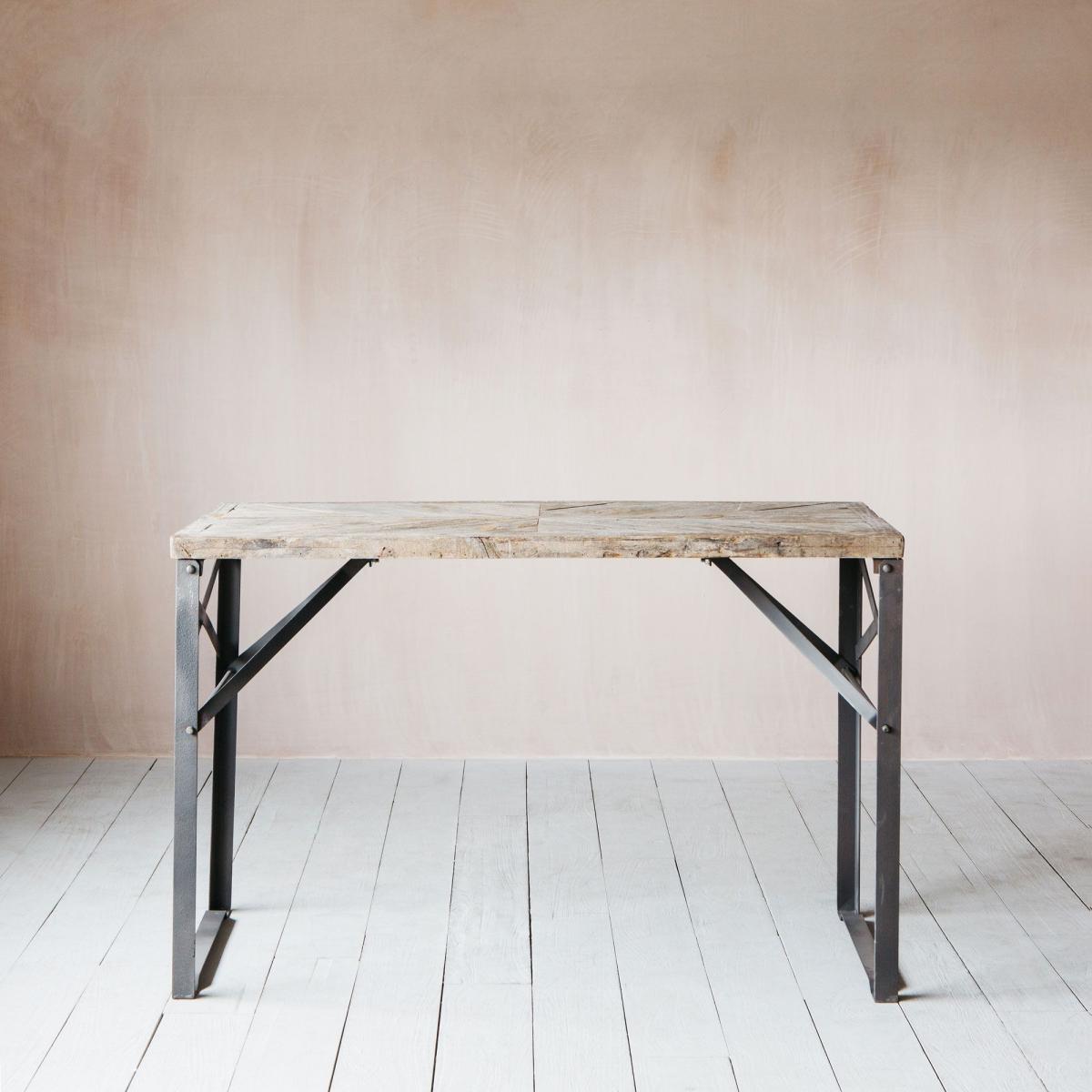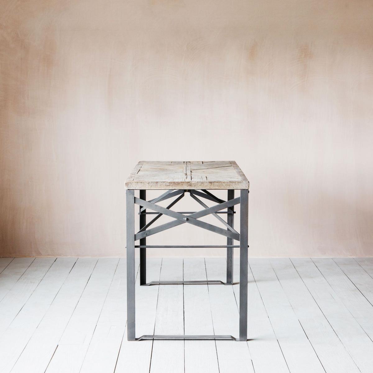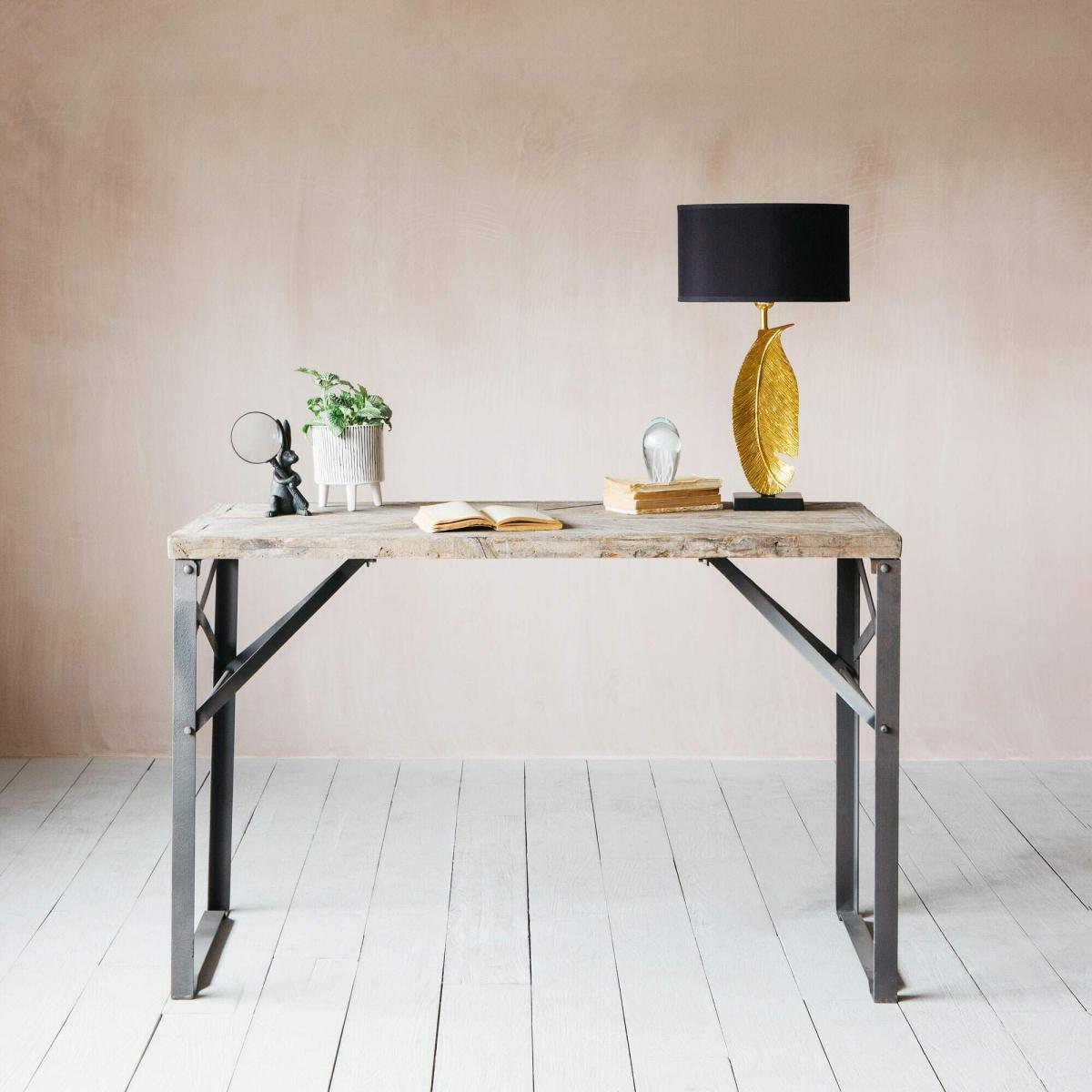 Sitting atop a burnished iron frame, the pine wood top of this desk is raw-edged and distressed for a rugged sea-worn look in any coastal inspired home.