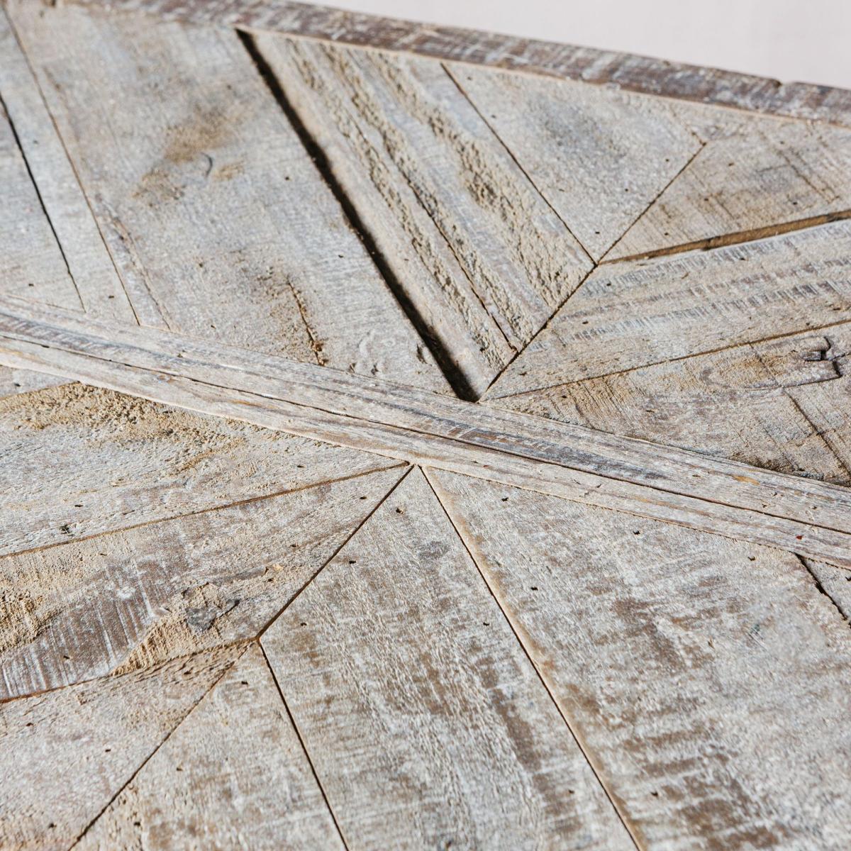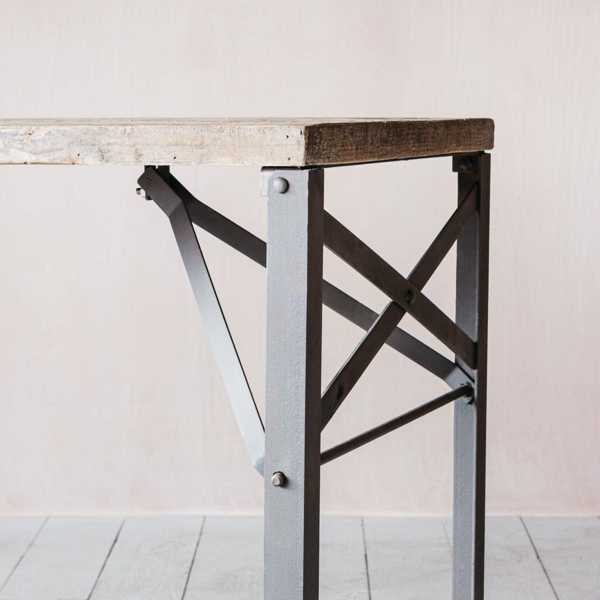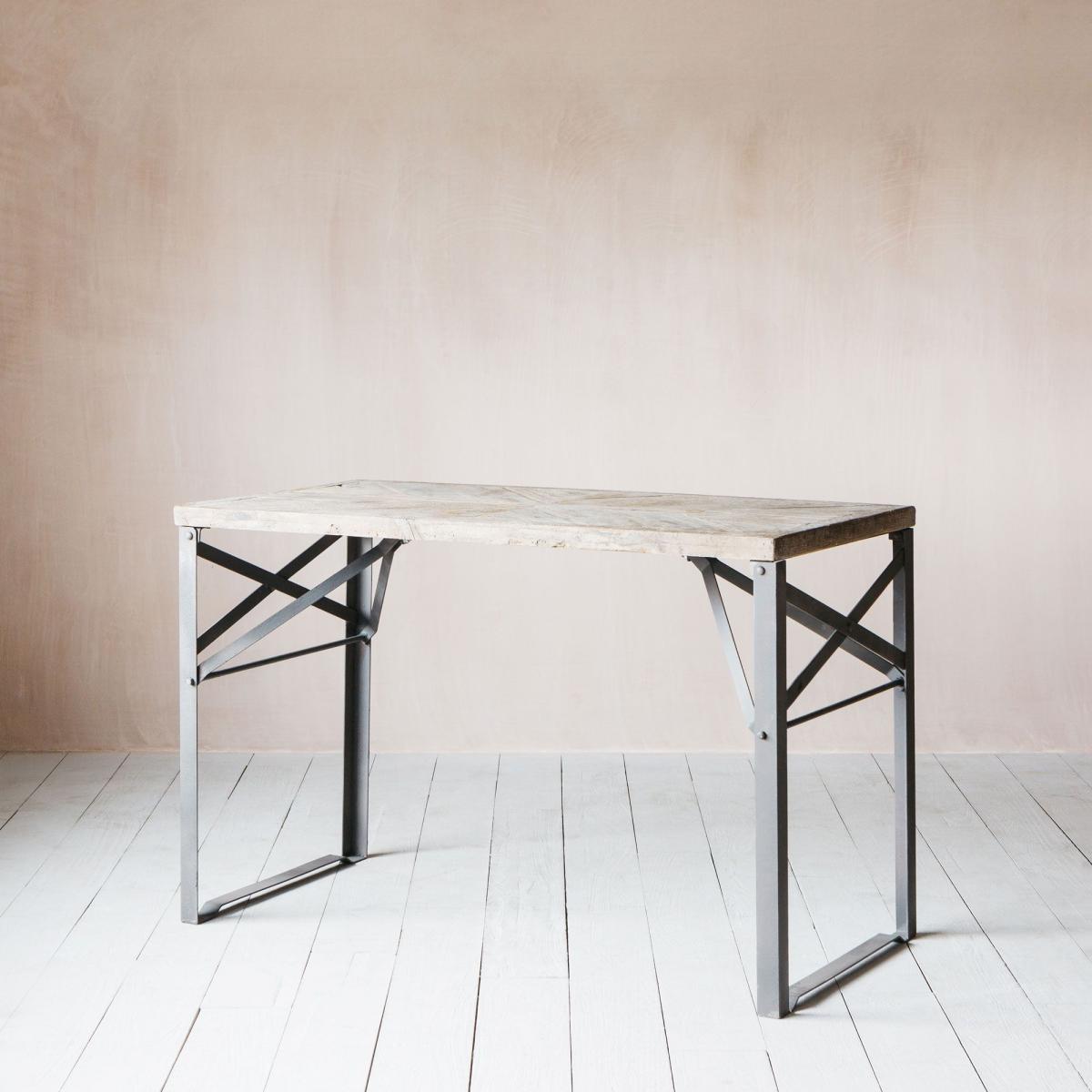 Sitting atop a burnished iron frame, the pine wood top of this desk is raw-edged and distressed for a rugged sea-worn look in any coastal inspired home.