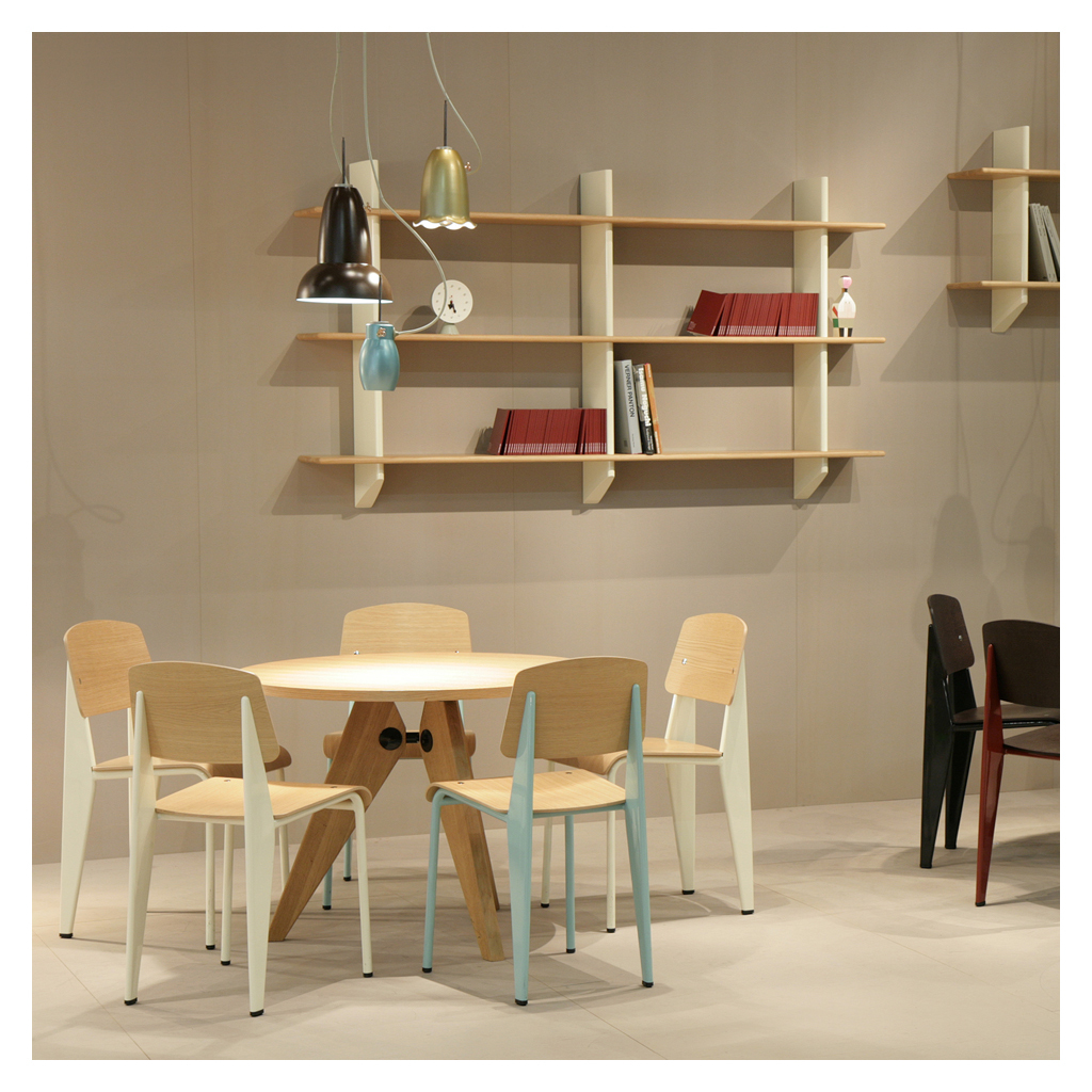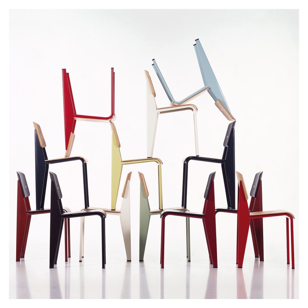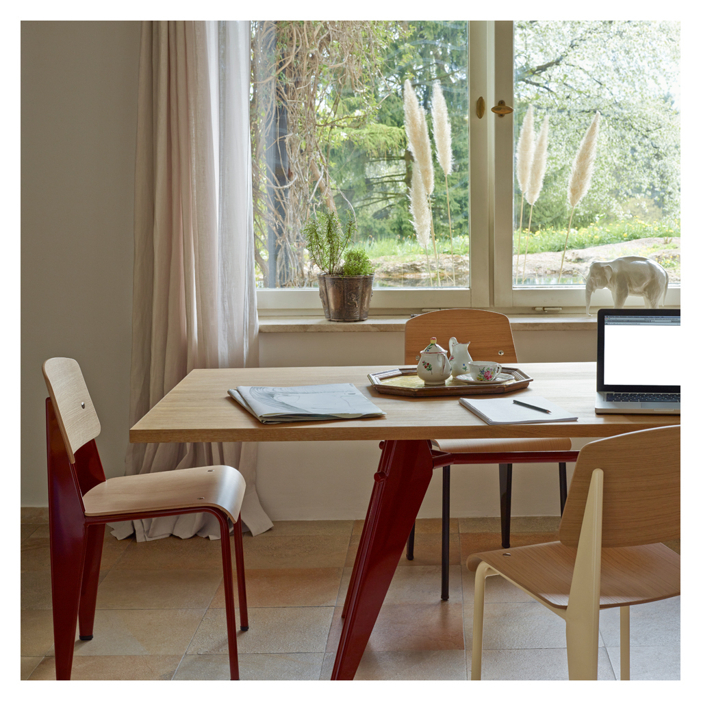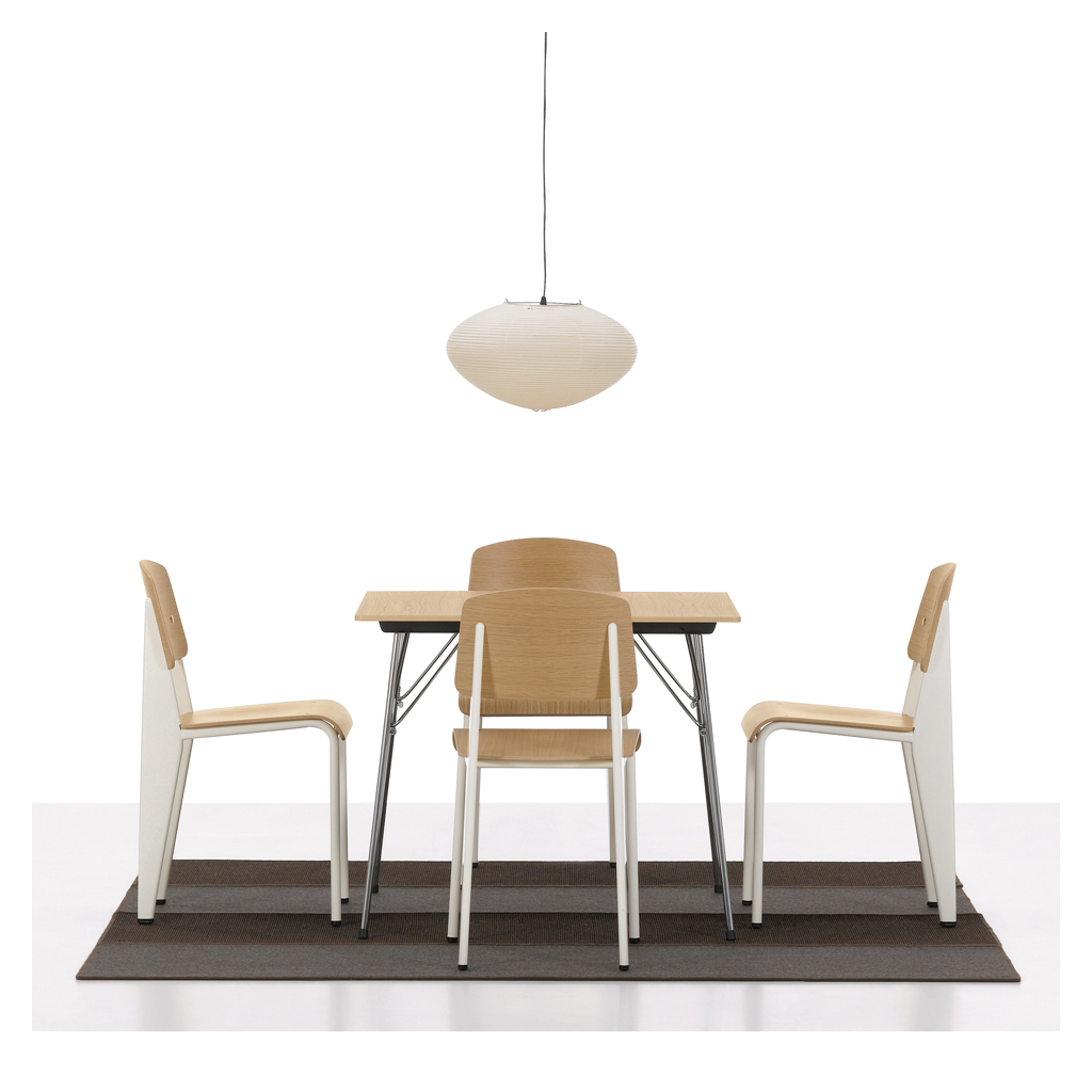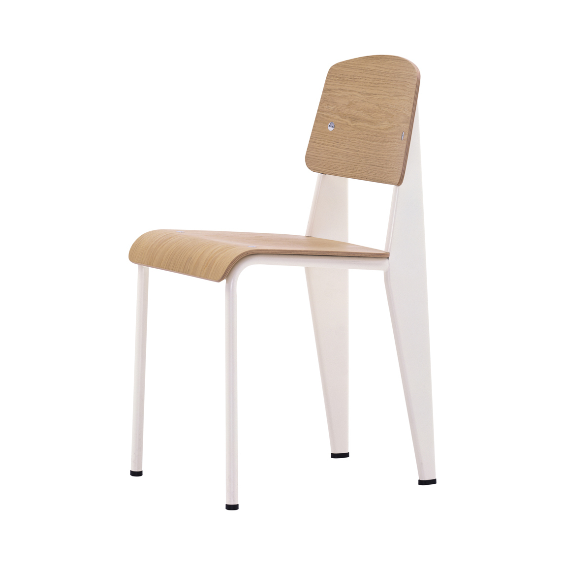 Manufactured by Vitra, this Standard Chair in an ecru powder-coated steel and oak finish by Jean Prouvé is a French design classic that showcases perfect, minimalist style with its optimum weight distribution and masterful balance. An engineer, architect and designer all at once, Jean Prouvé called himself 'le Constructeur' or 'The Factory man' and was driven by systematic design and industrial processes. Designed in 1934, the Standard Chair reflects his simple insight that seating designs take the most strain on the back legs; solving this weight distribution issue, Prouvé created lightweight tubular powder-coated steel front supports and stronger, more voluminous hollow steel back legs that transfer the sitter's weight into the floor. Finished with an ergonomic oak wood seat and backrest, the Standard Chair in ecru epitomises comfortable, clean-lined design that endures through the years.