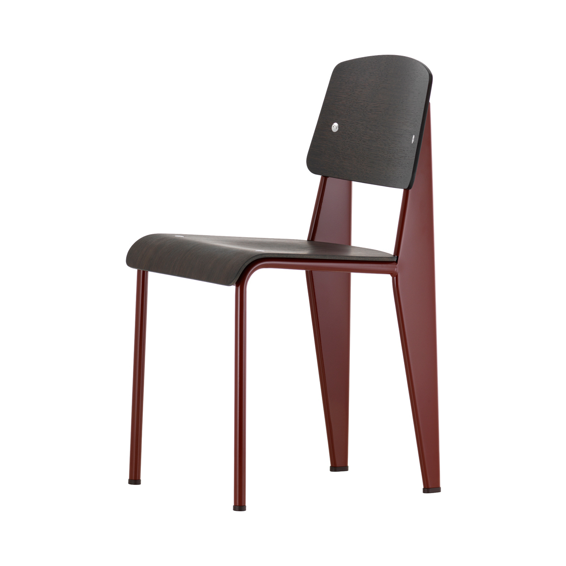 Manufactured by Vitra, this Standard Chair in a Japanese red powder-coated steel and dark oak finish by Jean Prouvé is a French design classic that showcases perfect, minimalist style with its optimum weight distribution and masterful balance. An engineer, architect and designer all at once, Jean Prouvé called himself 'le Constructeur' or 'The Factory man' and was driven by systematic design and industrial processes. Designed in 1934, the Standard Chair reflects his simple insight that seating designs take the most strain on the back legs; solving this weight distribution issue, Prouvé created lightweight tubular powder-coated steel front supports and stronger, more voluminous hollow steel back legs that transfer the sitter's weight into the floor. Finished with an ergonomic dark oak wood seat and backrest, the Standard Chair in rich Japanese red epitomises comfortable, clean-lined design that endures through the years.