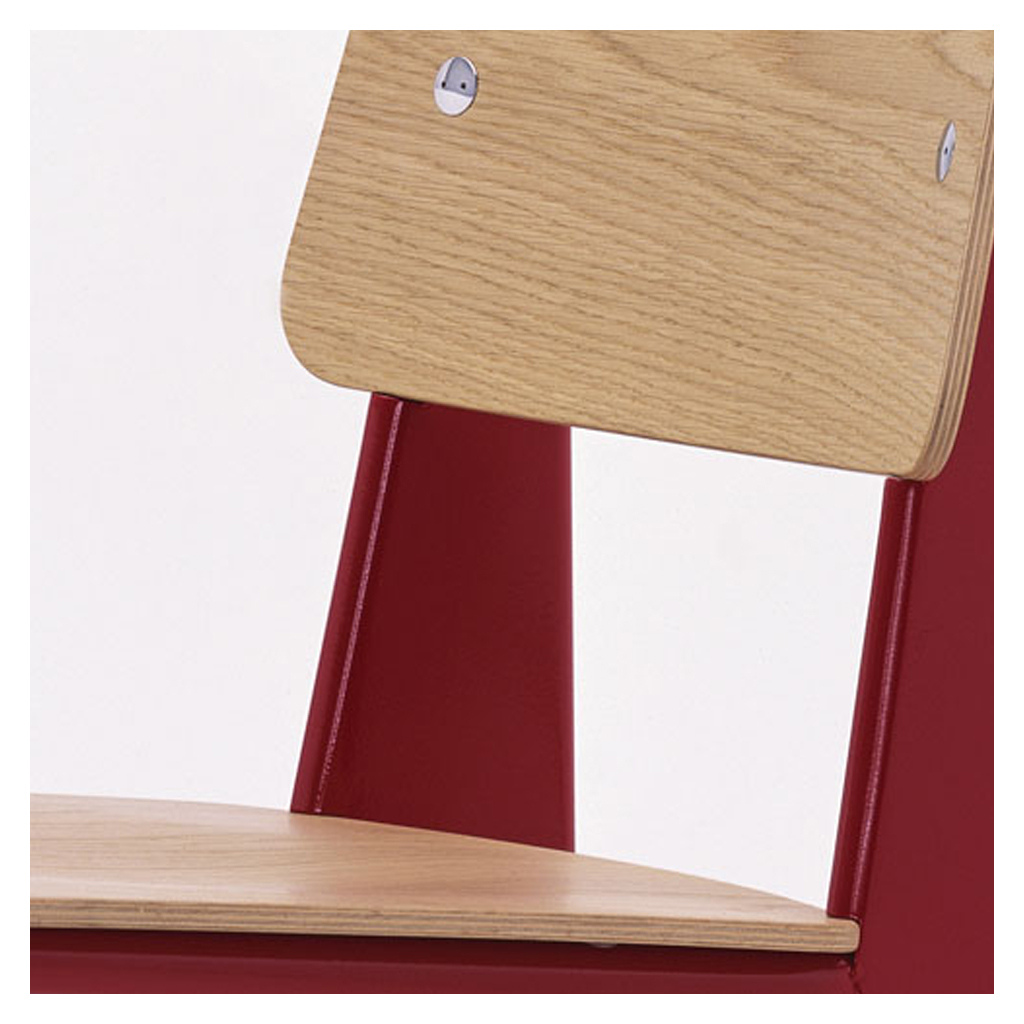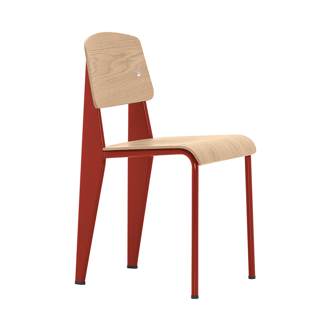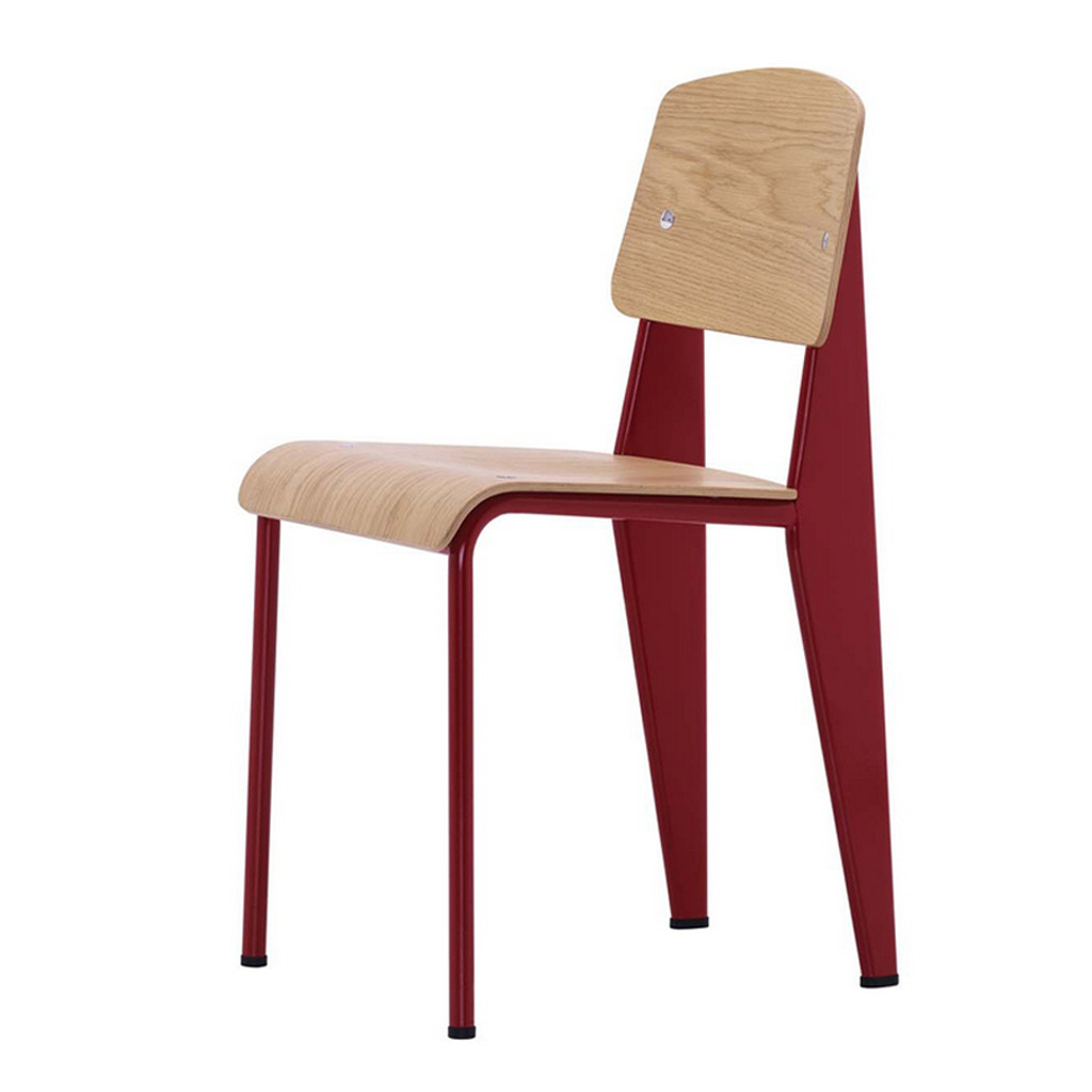 Manufactured by Vitra, this Standard Chair in a red painted steel and oak finish by Jean Prouvé is a French design classic that showcases perfect, minimalist style with its optimum weight distribution and masterful balance. An engineer, architect and designer all at once, Jean Prouvé called himself ‘le Constructeur’ or ‘The Factory man’ and was driven by systematic design and industrial processes. Designed in 1934, the Standard Chair reflects his simple insight that seating designs take the most strain on the back legs; solving this weight distribution issue, Prouvé created lightweight tubular powder-coated steel front supports and stronger, more voluminous hollow steel back legs that transfer the sitter’s weight into the floor. Finished with an ergonomic oak wood seat and backrest, the Standard Chair in an vibrant red hue epitomises comfortable, clean-lined design that endures through the years.