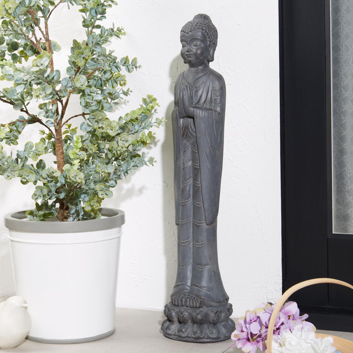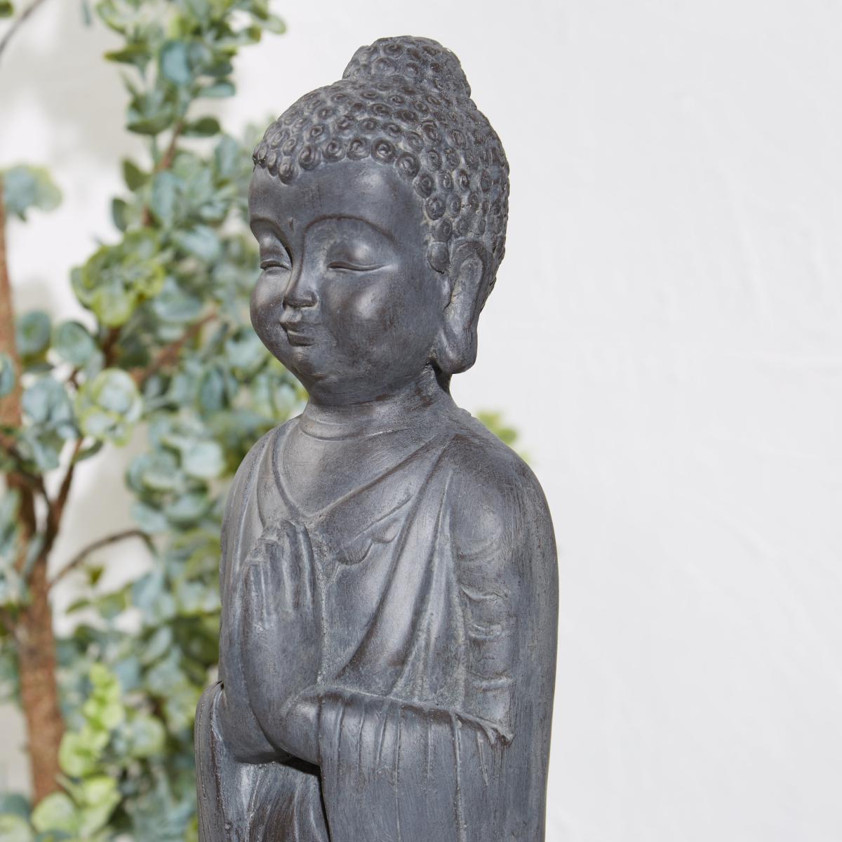 I love this grey standing Buddha as a focal point for both indoor and outdoor spaces. Its neutral tone makes it versatile, working well in contemporary, minimalist, or even more traditional settings when paired thoughtfully. It’s particularly effective in garden corners or indoor shelves that benefit from a sense of calm and serenity. To style it effectively, consider surrounding it with greenery or natural textures, like pebbles or wooden accents, to enhance its tranquil vibe. Remember to position it at eye level when indoors for maximum impact and to avoid placing it near high-traffic areas to preserve its sense of calm.