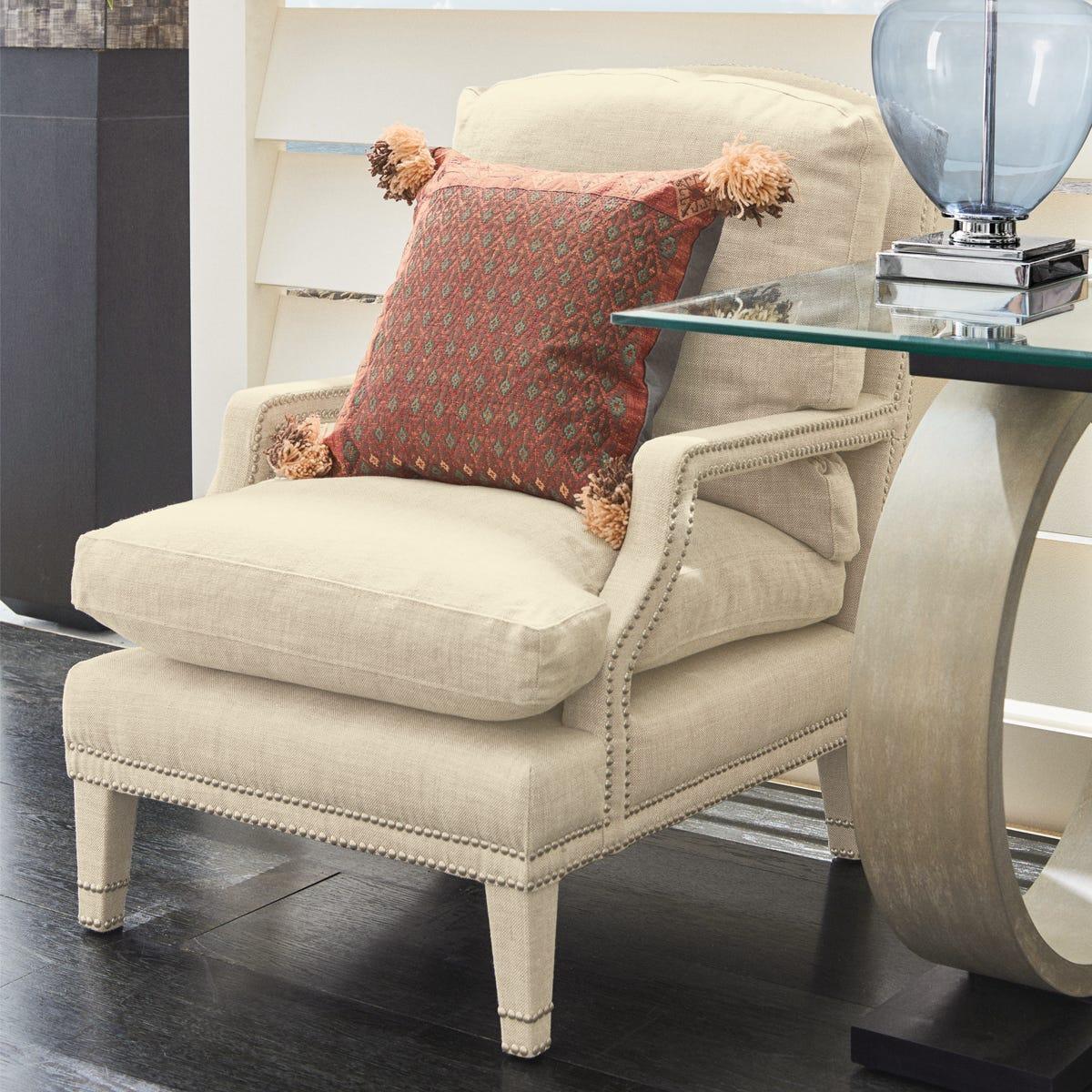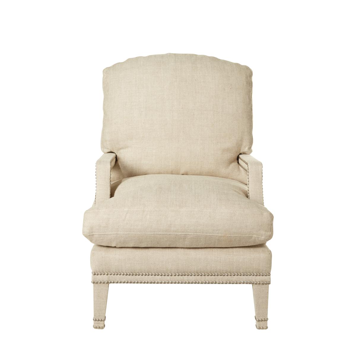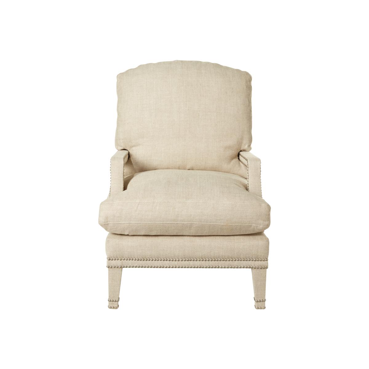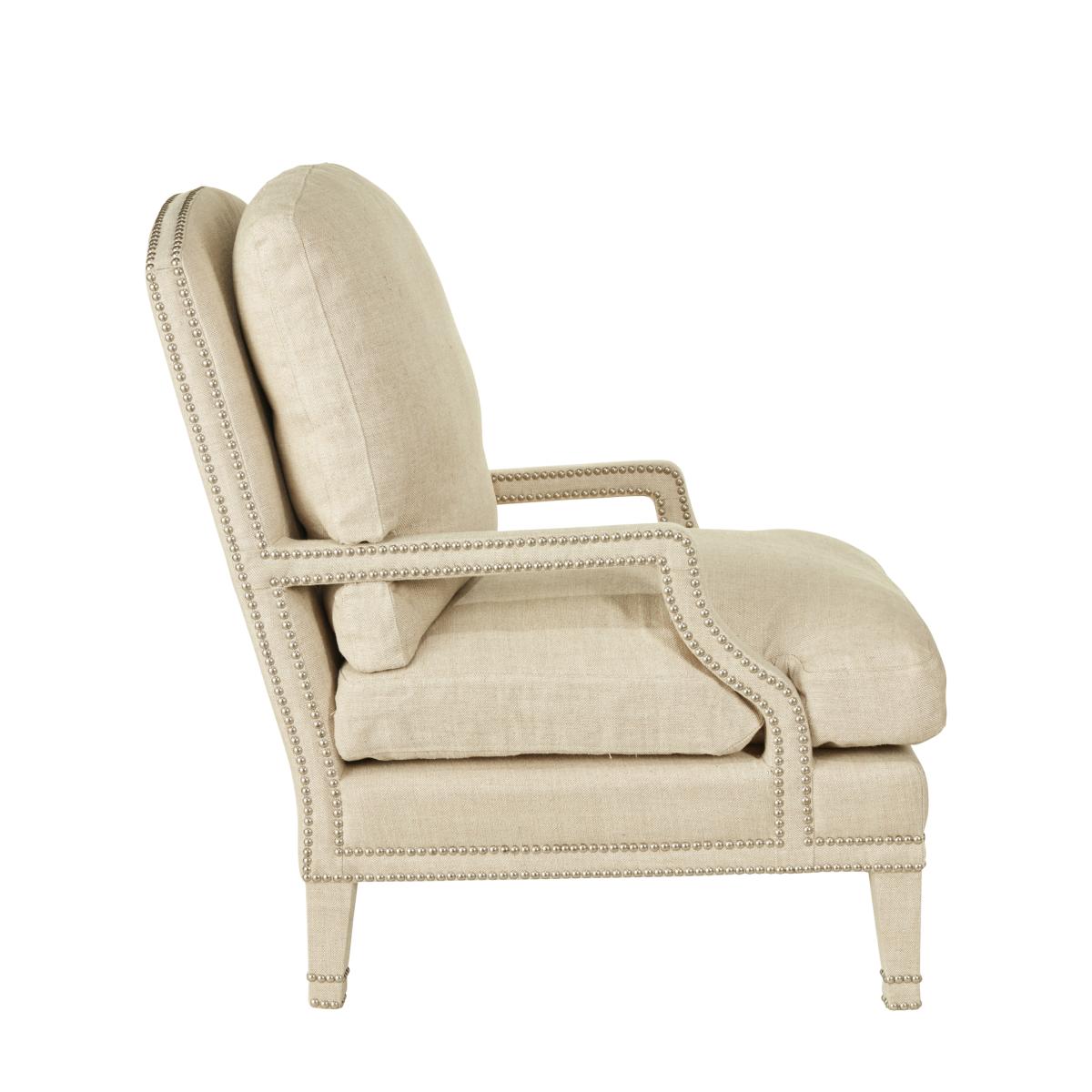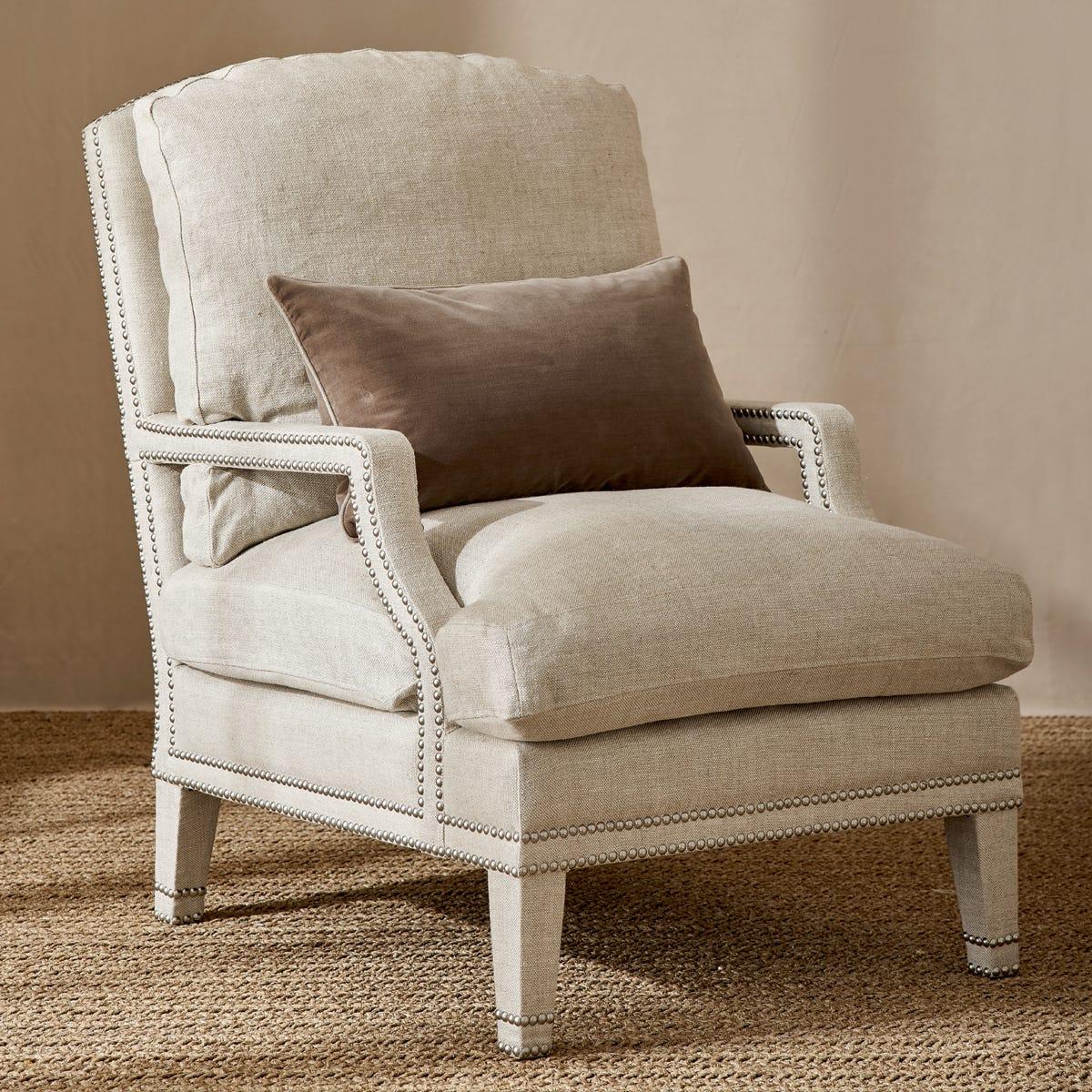Our Stanhope Armchair was designed by Annabel Astor, who wanted to create a stylish armchair that was classic and comfortable but with a contemporary twist. Upholstered in 100% linen, the frame is finished with smart double-stud edging, created using hundreds of polished silver iron studs. A generously stuffed seat and back cushion maximise comfort, making this an ideal armchair choice for a reading nook or a bedroom. Stanhope Armchair - Natural