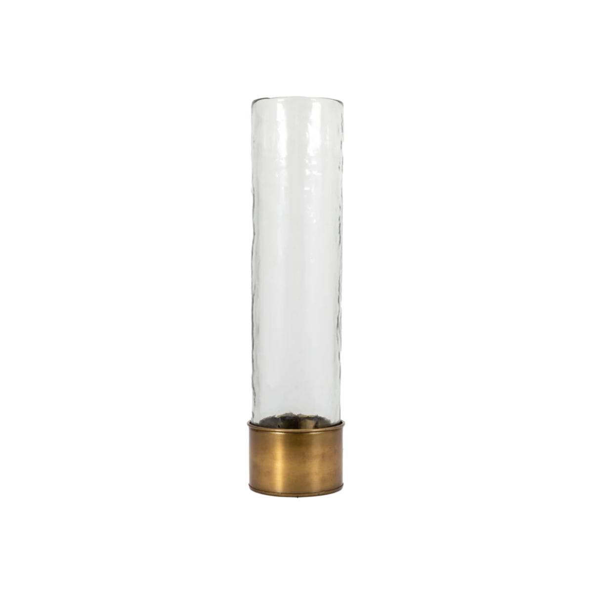 With beautiful handmade dappled glass designed to catch the light, this vase has a simple uncomplicated shape and bronze base. Available in 2 further sizes that look great grouped together as a trio. Width 100mm Depth 100mm Height 450mm Colour - Antique bronze Material - Glass / Iron