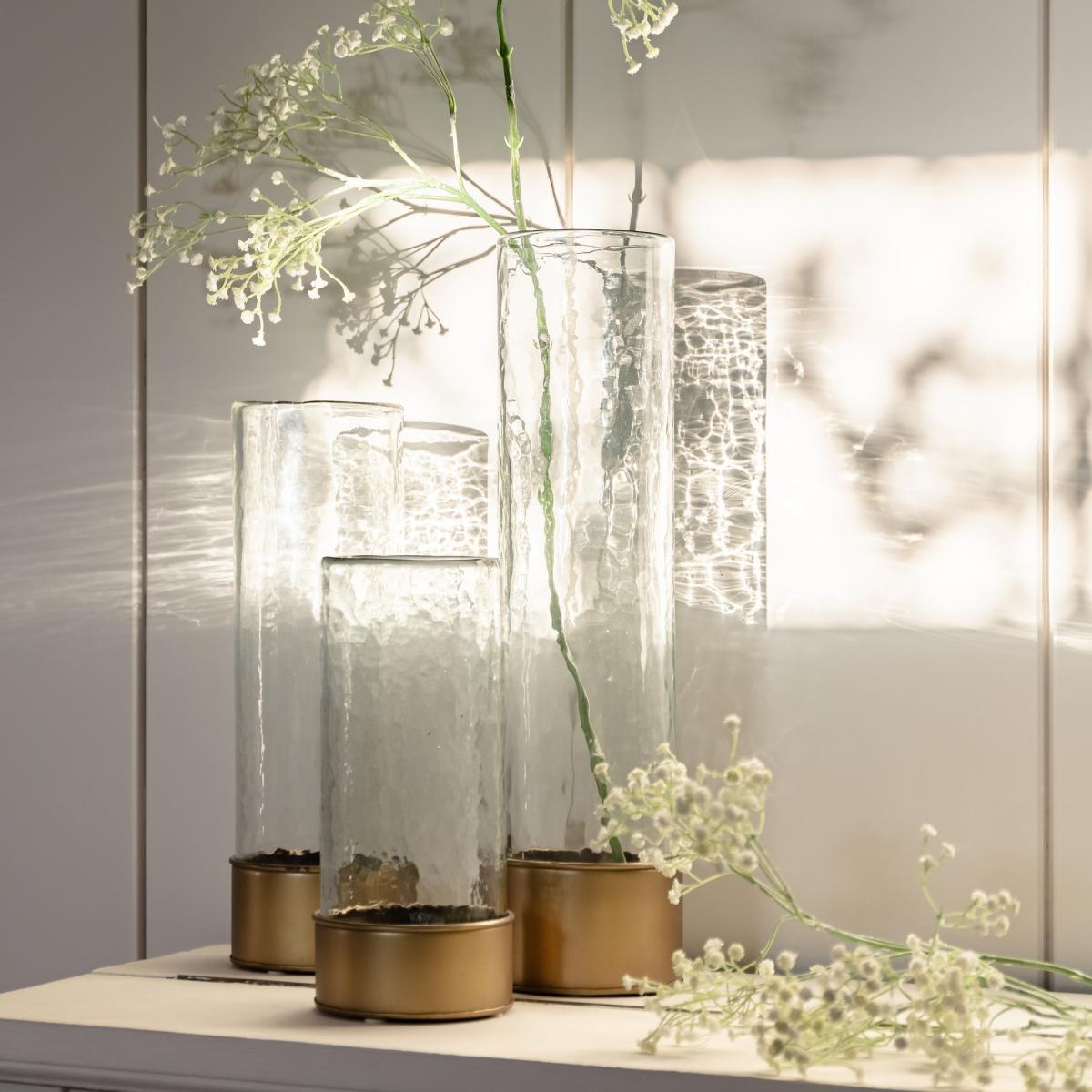 With beautiful handmade dappled glass designed to catch the light, this vase has a simple uncomplicated shape and bronze base. Available in 2 further sizes that look great grouped together as a trio.