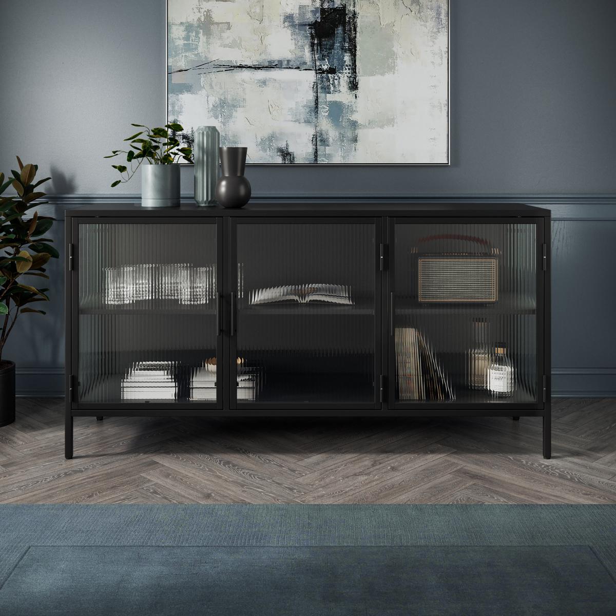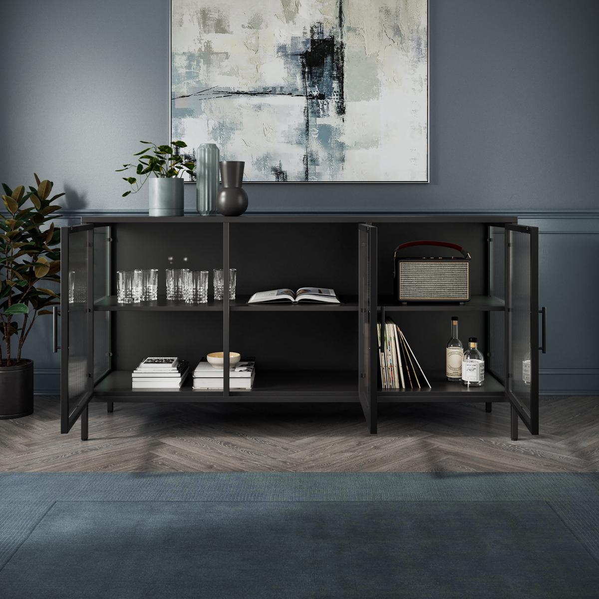 I love this sideboard for its sleek, contemporary aesthetic, which pairs effortlessly with both modern and industrial interiors. The ribbed glass adds texture and visual interest without overwhelming a space, making it particularly versatile in living rooms, dining areas, or even home offices. Practical styling tips include accessorising with minimalist tableware or decorative books on top, while keeping inside organised with baskets or boxes to maximise storage. It works particularly well in rooms with a monochrome or muted colour palette, where it can serve as a statement piece that blends function with style.