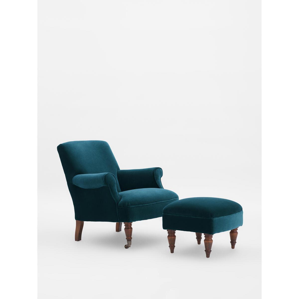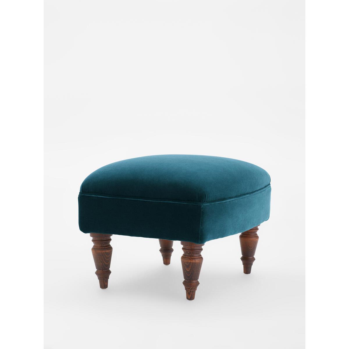 Our Stanton velvet ottoman is inspired by a vintage chair ownedby Nick Jones, and made up of 100% recycled materials. The ottomanis complete with turned solid beech legs, and filled with coconuthusk and latex filling for extra comfort. Pair with the Stantonarmchair and position it in a cosy corner to unwind. Velvet ottoman. Jute webbing. Coconut husk and latex padding. Turned solid beech legs. Inspired by Babington House.