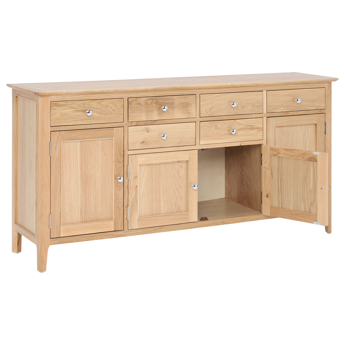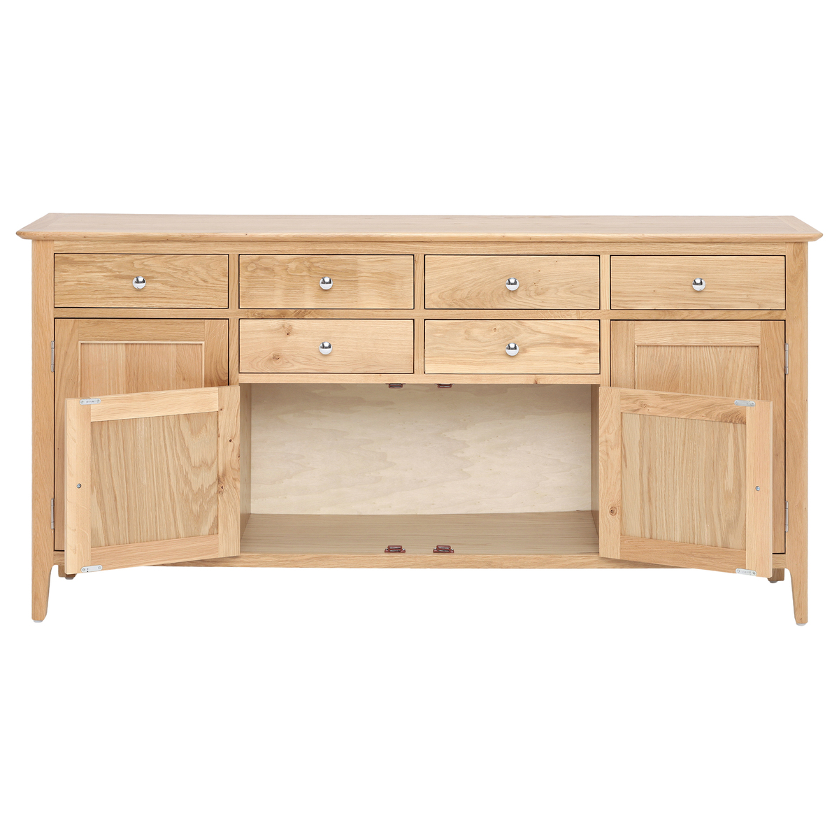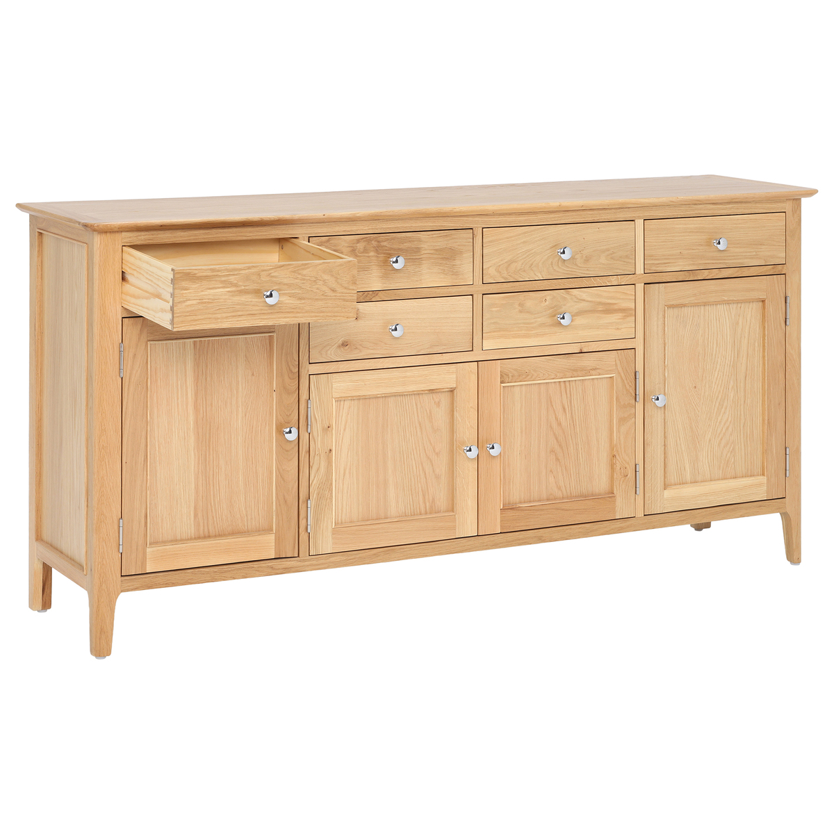 A stylish space to stow away tableware, the Stanwick 4 door sideboard features a modest design that makes it the ideal foundation for decorative accessories. Dressed with vases, plants, candles and a lamp, it will make your dining room a stunning scene, even when the table’s not set. The sideboard’s plentiful array of drawers and cupboards lets you organise things just the way you want, each detailed with either classic wooden or contemporary chrome handles. A light oak finish gives the Stanwick timeless appeal, beautifully defined with natural wood grain and colourings.