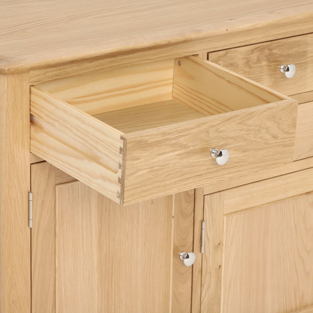 I love this sideboard for its classic yet versatile design, making it a great fit in both traditional and contemporary interiors. The natural wood finish brings warmth and texture, perfect for creating a cosy atmosphere. It works particularly well in dining rooms for storing tableware or as a statement piece in living areas or hallways. Practical styling tips include adding decorative bowls, candles, or artwork on top, while organising smaller items in the drawers. To keep the look streamlined, consider pairing it with similarly toned accessories or contrasting textures like matte ceramics or soft textiles for a layered, inviting look.