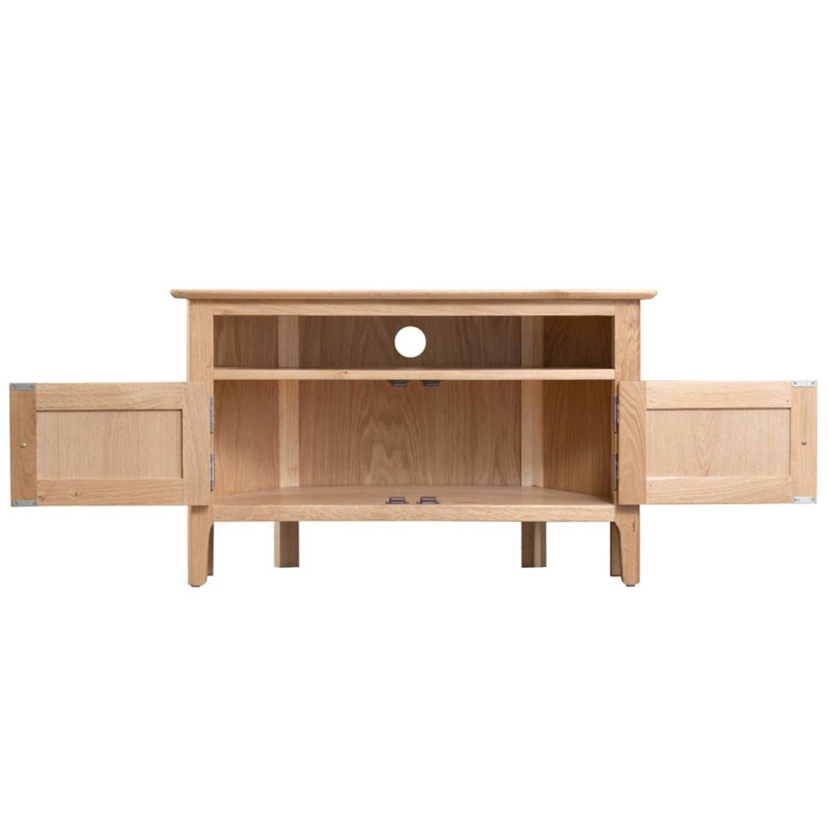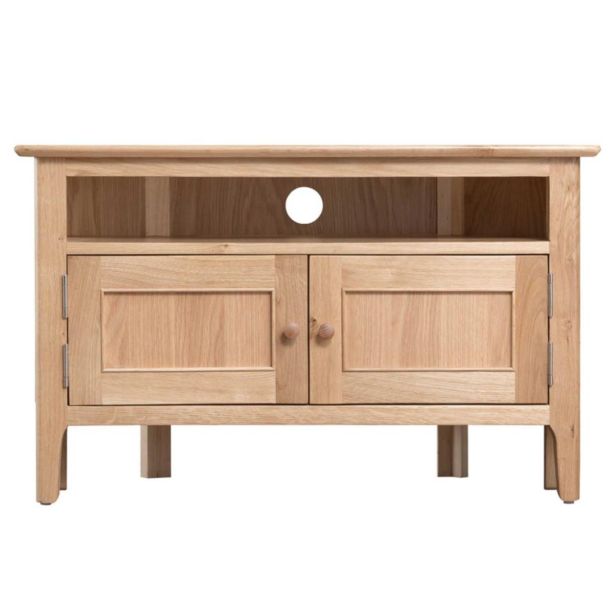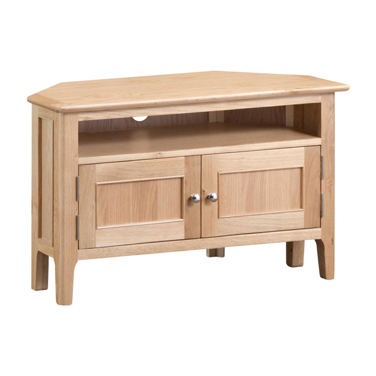 Design. With its convenient combination of open shelving and concealed cupboard space, the Stanwick corner TV unit makes practical use of those awkward areas. Supplied with both chrome and wooden door handles, this oak TV cabinet can be suited to both contemporary and traditional interiors. Shop the full Stanwick furniture range for stylishly coordinated pieces.