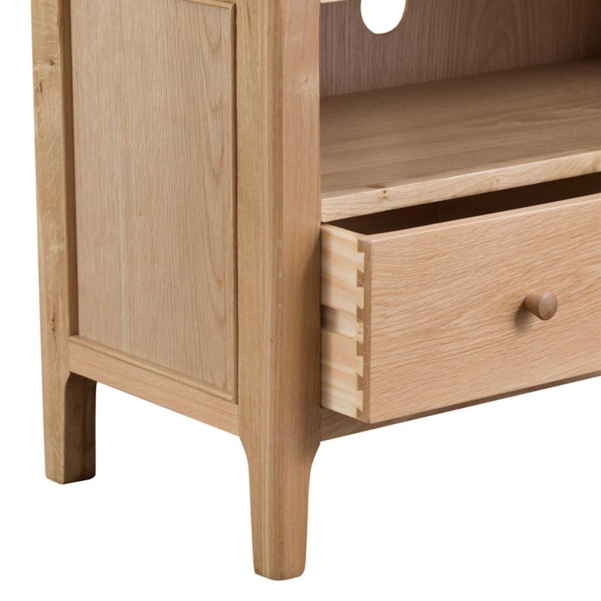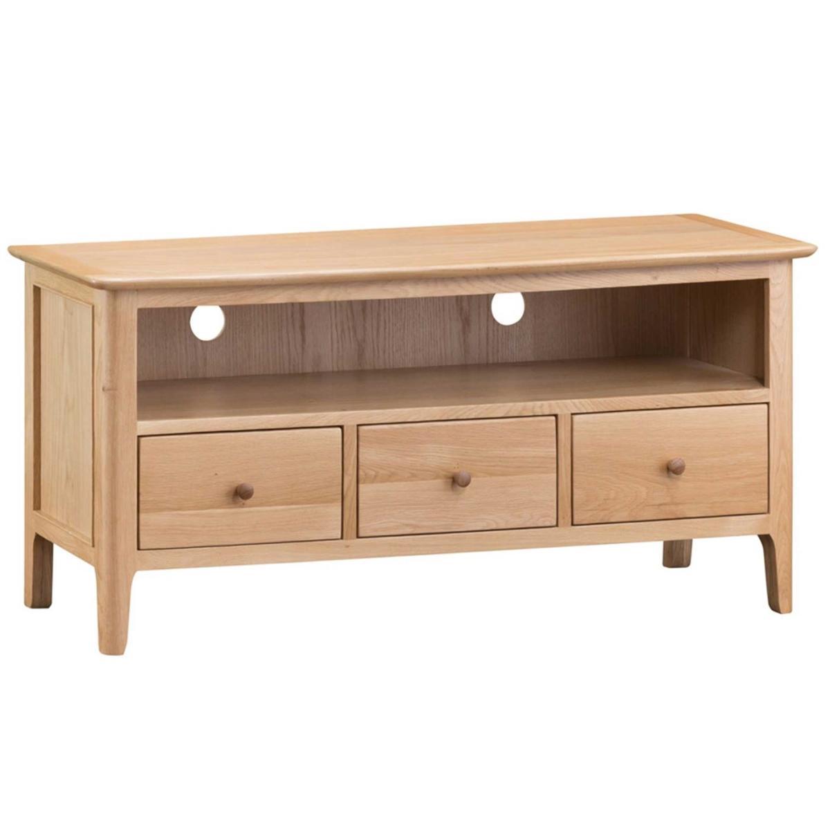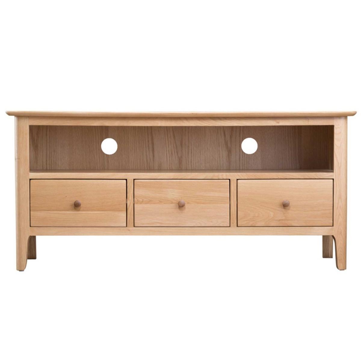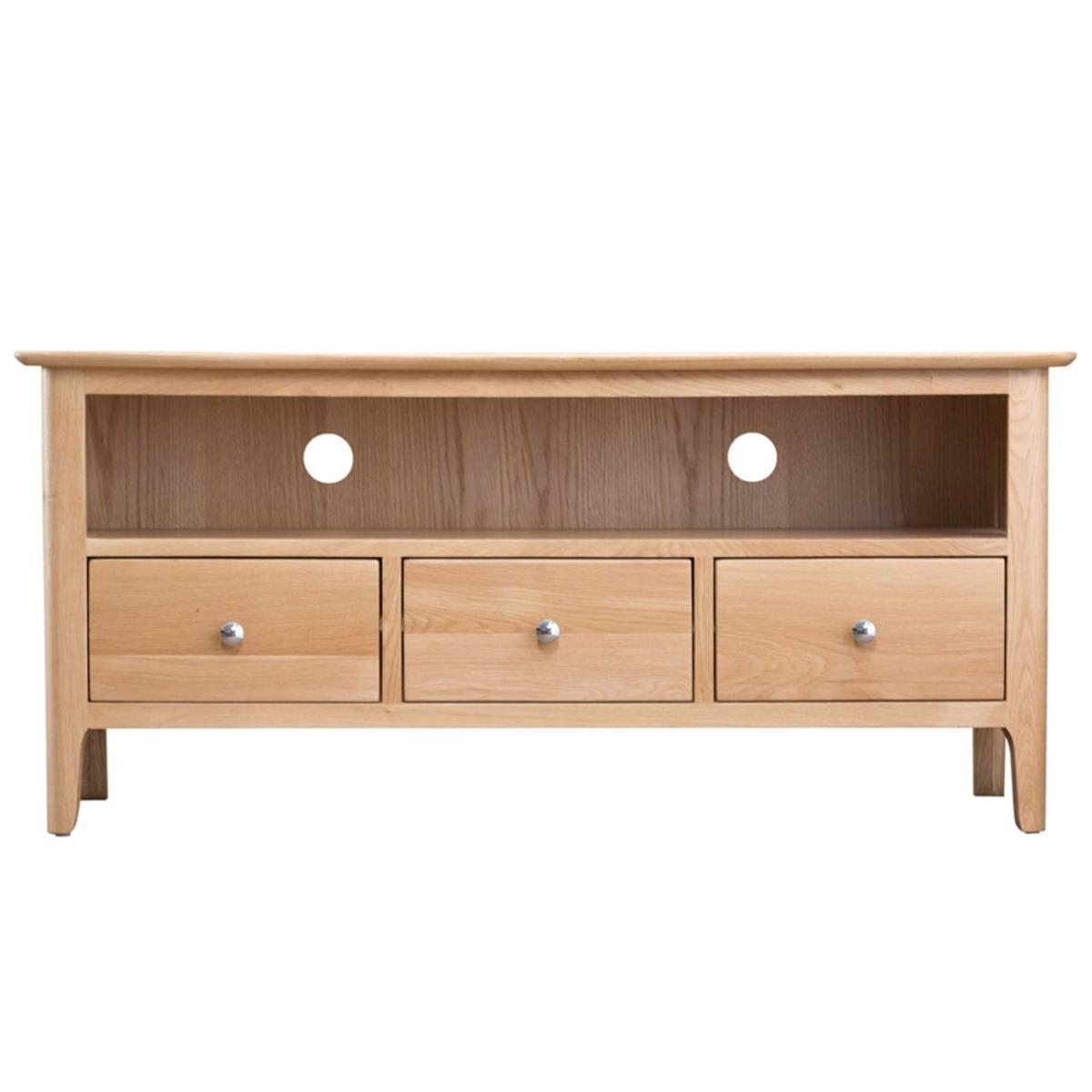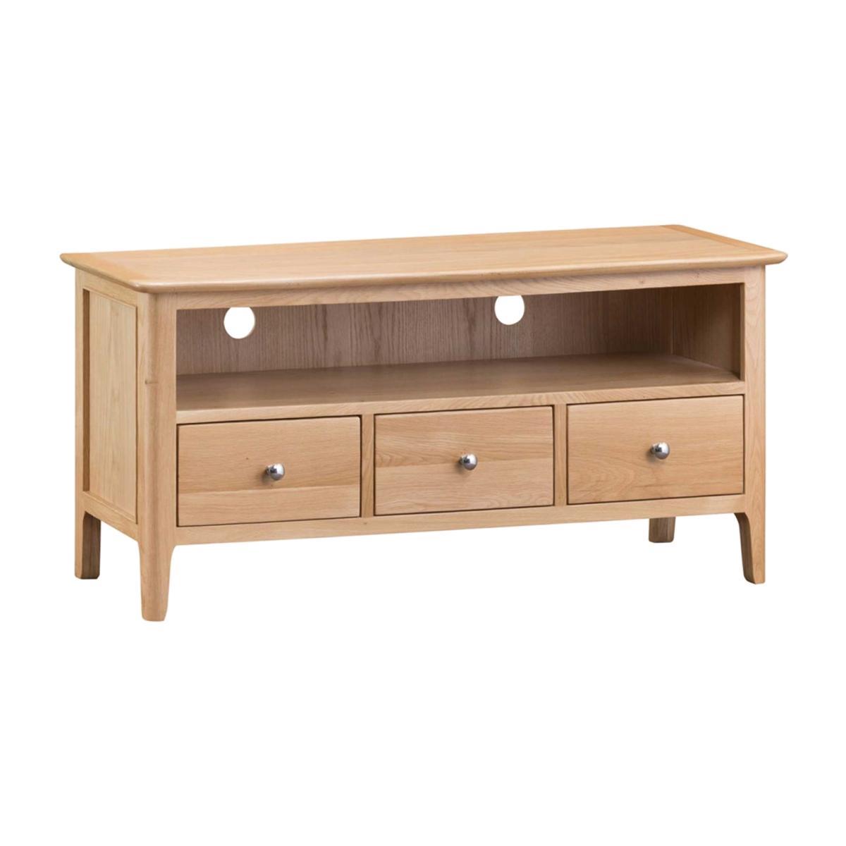 Design. Featuring a spacious surface, large shelf and three handy drawers, the Stanwick oak TV unit is well equipped to look after all of your living room electricals. Finished in a timeless light oak veneer and supplied with both wooden and chrome handles, this large TV unit will complement both traditional and contemporary interiors. The complete Stanwick furniture range features plenty of matching items for reinventing your home.