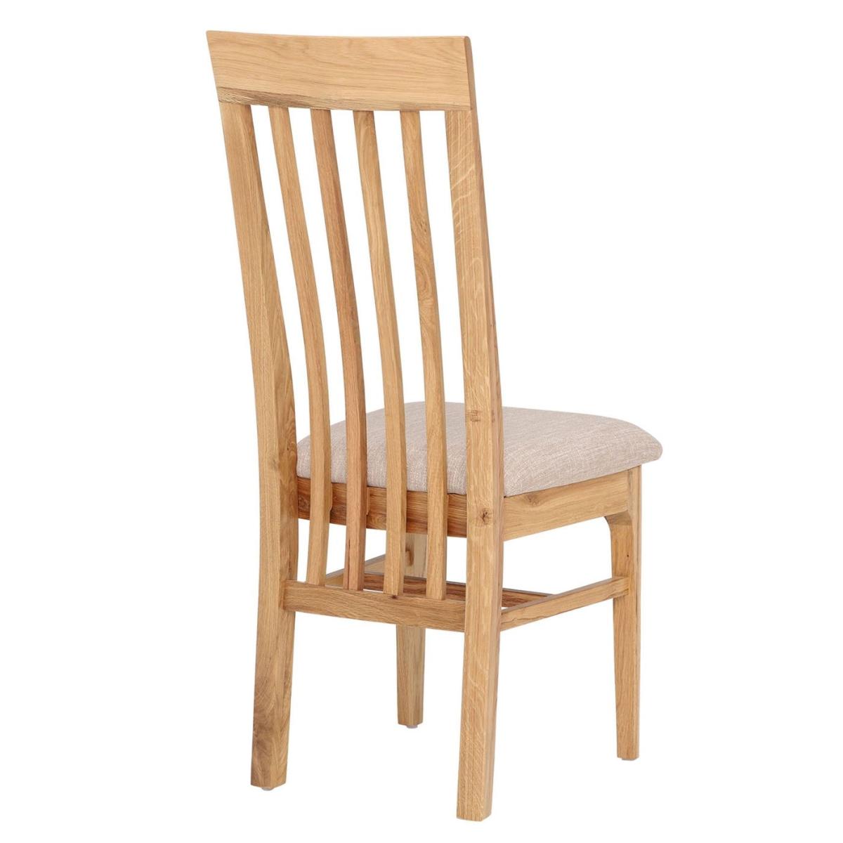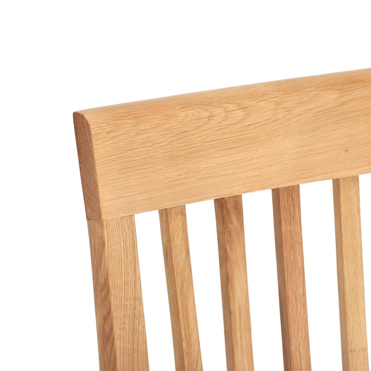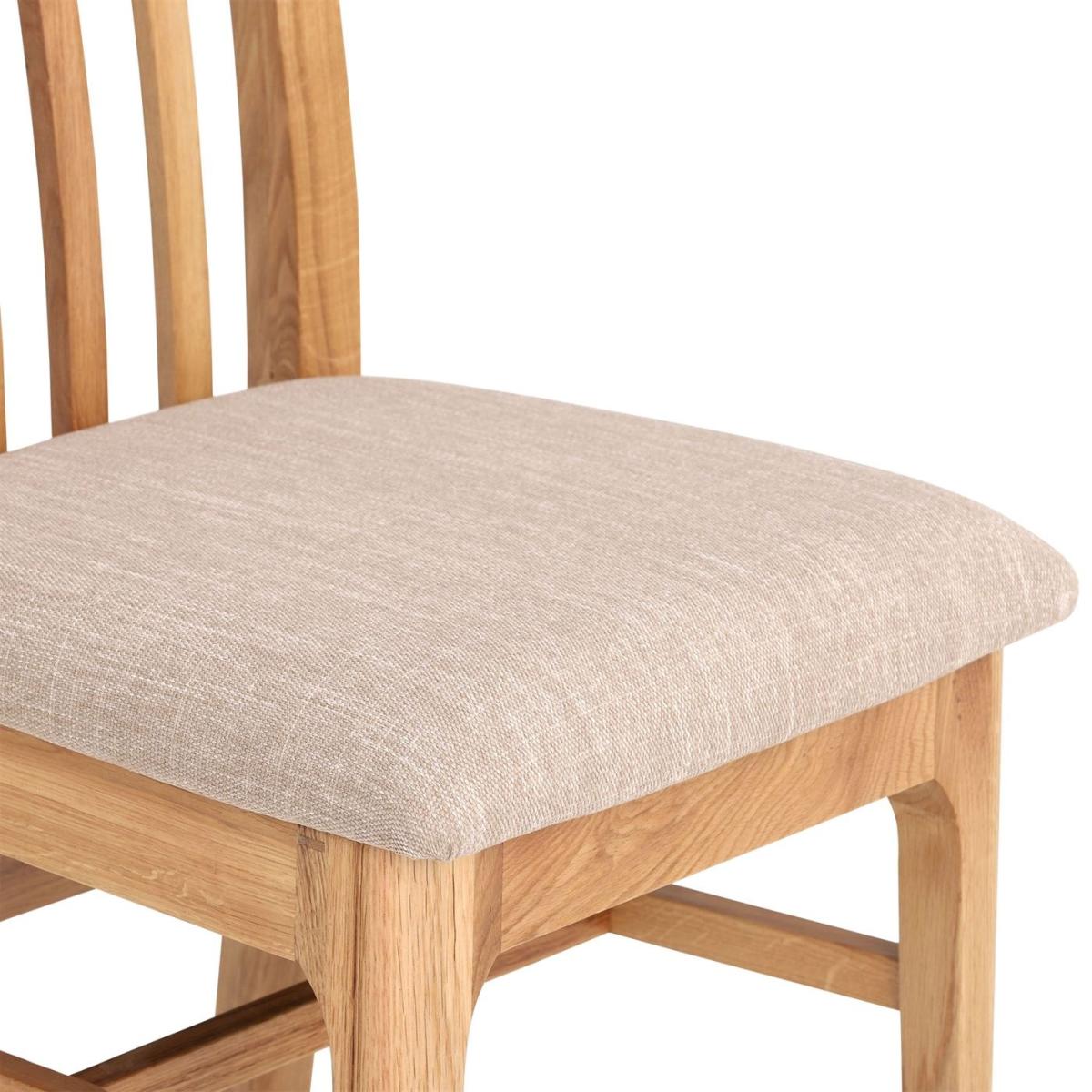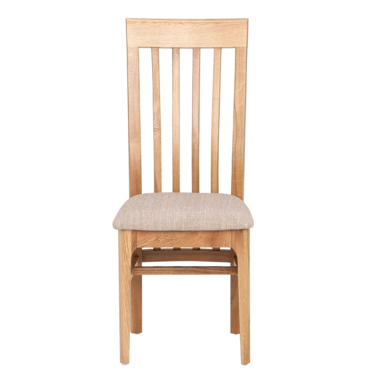 Design. Comfort meets contemporary elegance in the Stanwick slat back dining chair. Built from solid and engineered wood in a light oak finish, it complements a wide variety of interior schemes. Natural grains and knots give the chair a timeless look that will never go out of style, whilst the foam cushioned seat is upholstered in a warm neutral fabric for versatility. The high backrest offers plenty of support during mealtimes and activities, with a modern, open design that creates a welcome sense of space. Matching table and sideboard available.