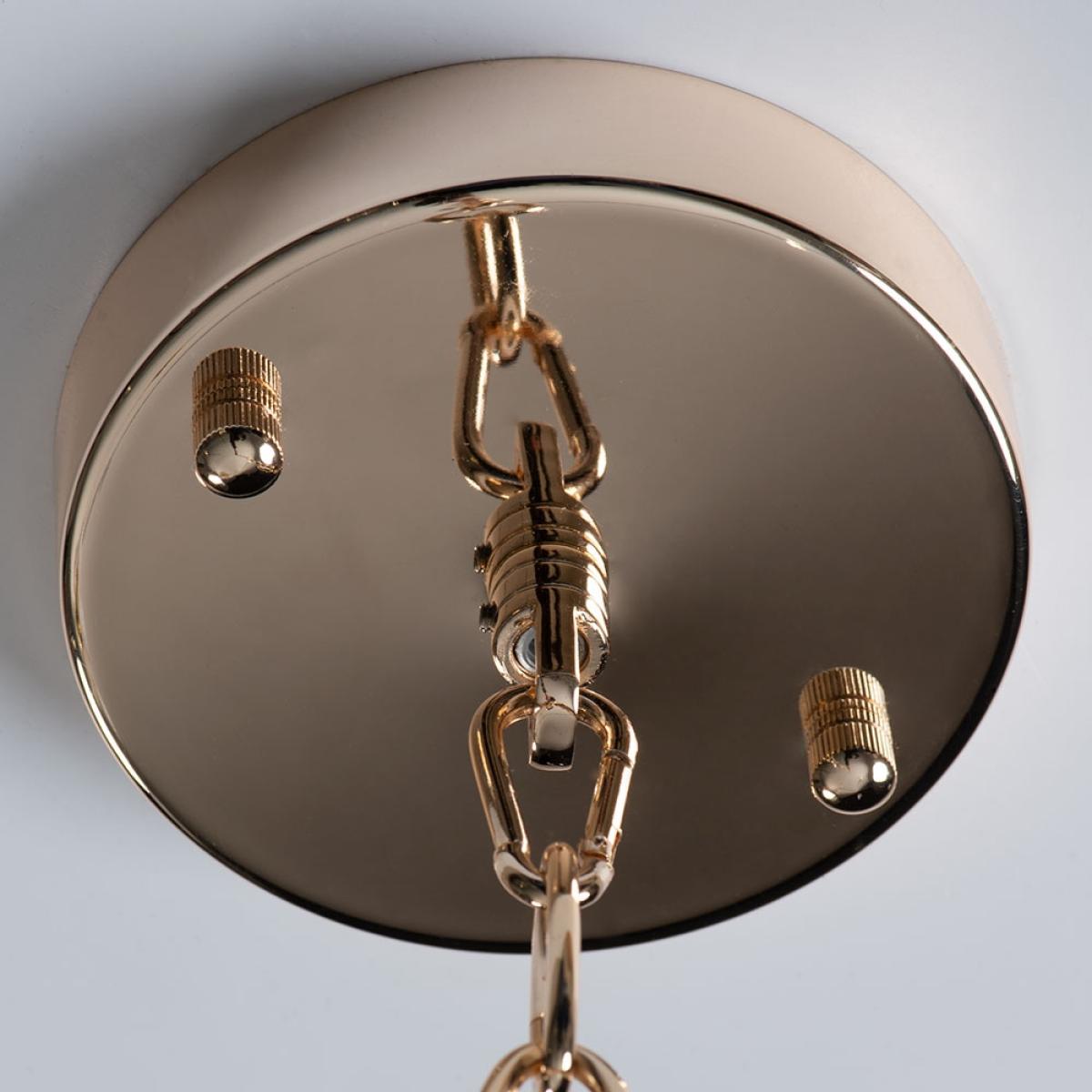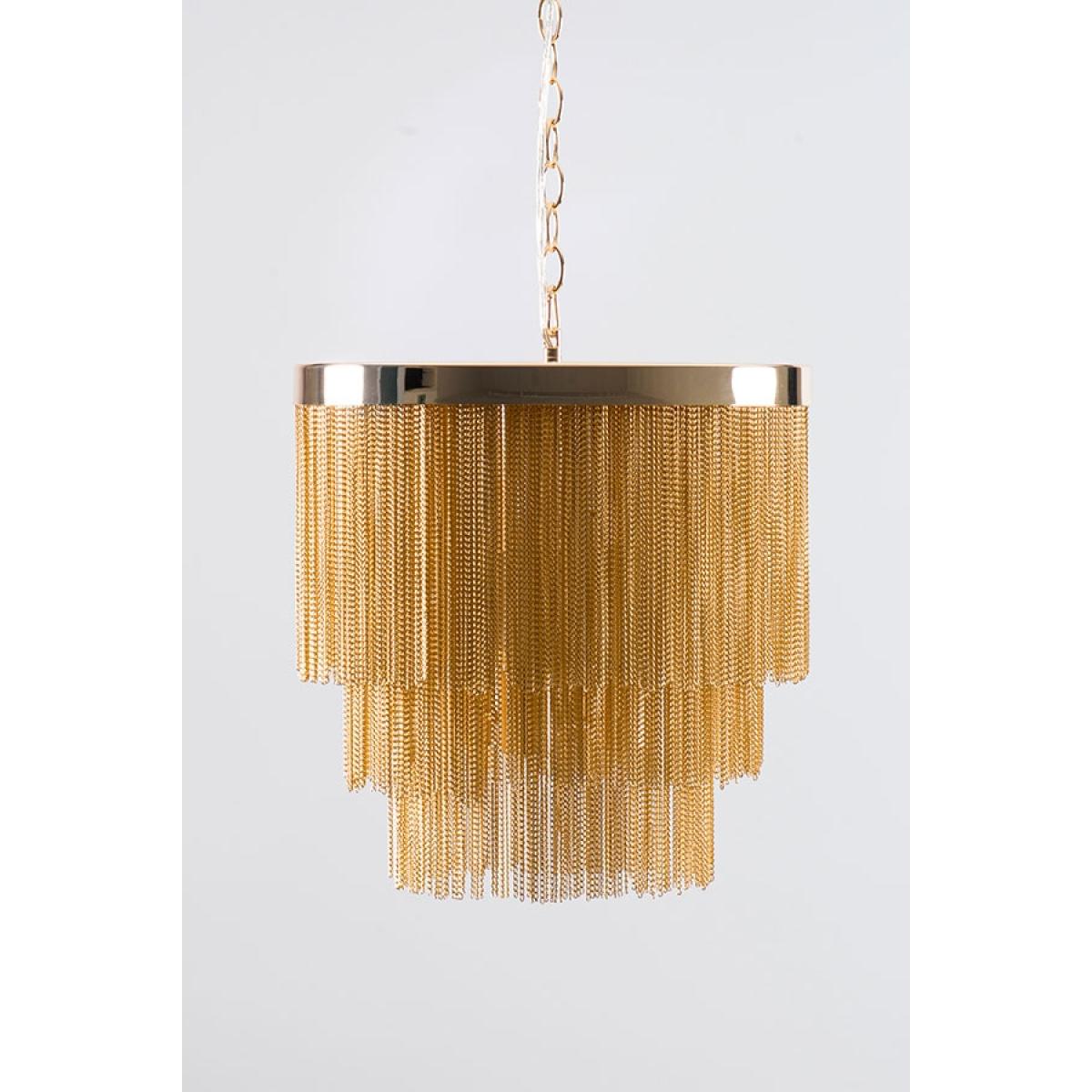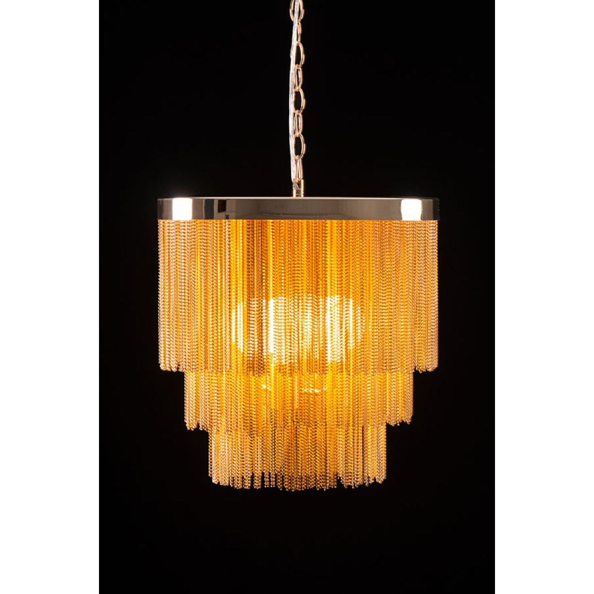 Elegant pendant light inspired by American Art Deco interiors. Featuring three tiers of fine metal chain which gently shimmer and diffuse the light. Steel and aluminium with brass finish. Height adjustable prior to installation. Supplied complete with 3 x E27 frosted globe bulbs.