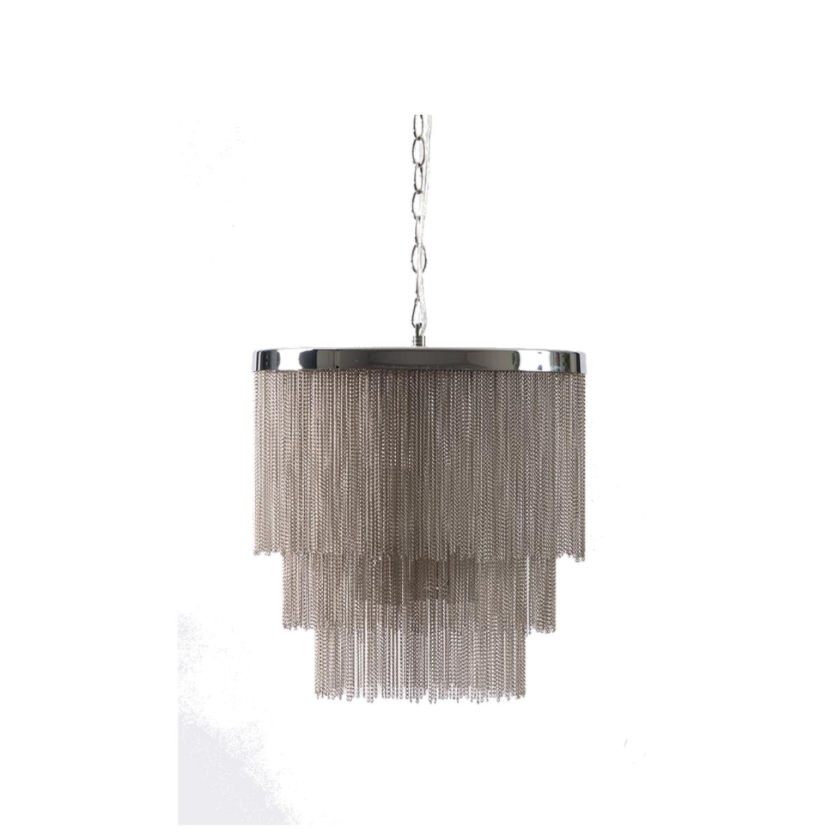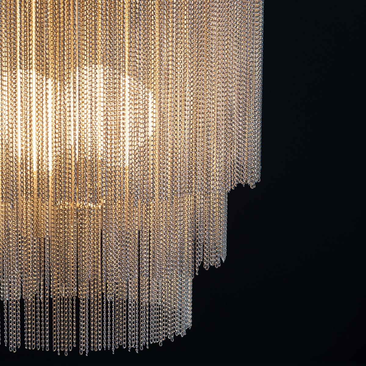 Elegant pendant light inspired by American Art Deco interiors. Featuring three tiers of fine metal chain which gently shimmer and diffuse the light. Steel and aluminium construction. Height adjustable prior to installation. Supplied complete with 3 x E27 frosted globe bulbs.