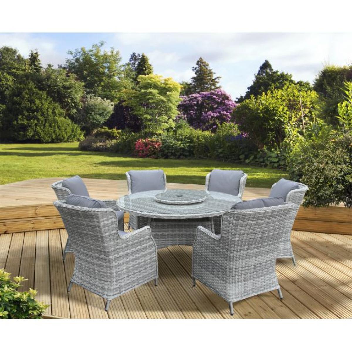 The Stapleford 6-Seater Set comes with 6 armchairs, a Lazy Susan and a round table with a 5mm tempered glass top. This brand-new deluxe range from Oldrids & Downtown is manufactured using durable and long-lasting materials. An eye-catching blend of grey shades on the cushions and the wide 'U' shaped wicker coupled with a full-round décor weave on the borders of the table and chairs result in a prestigious, robust, and stylish collection of garden furniture. The seat and back cushions on the spacious chairs are highly comfortable. The Stapleford range is constructed with strong yet light aluminium frames boasting strength, sturdiness and added corrosion resistance. Chair Dimensions: Width 62cm x Depth 84cm x Height 94cm Table Dimensions: Diameter 150cm x Height 74cm Lazy Susan Diameter: 60cm Some assembly of the table is required A parasol base is available to purchase separately All screens vary in colour reproduction and whilst every effort has been made to display the colour as accurately as possible it is for guidance only.