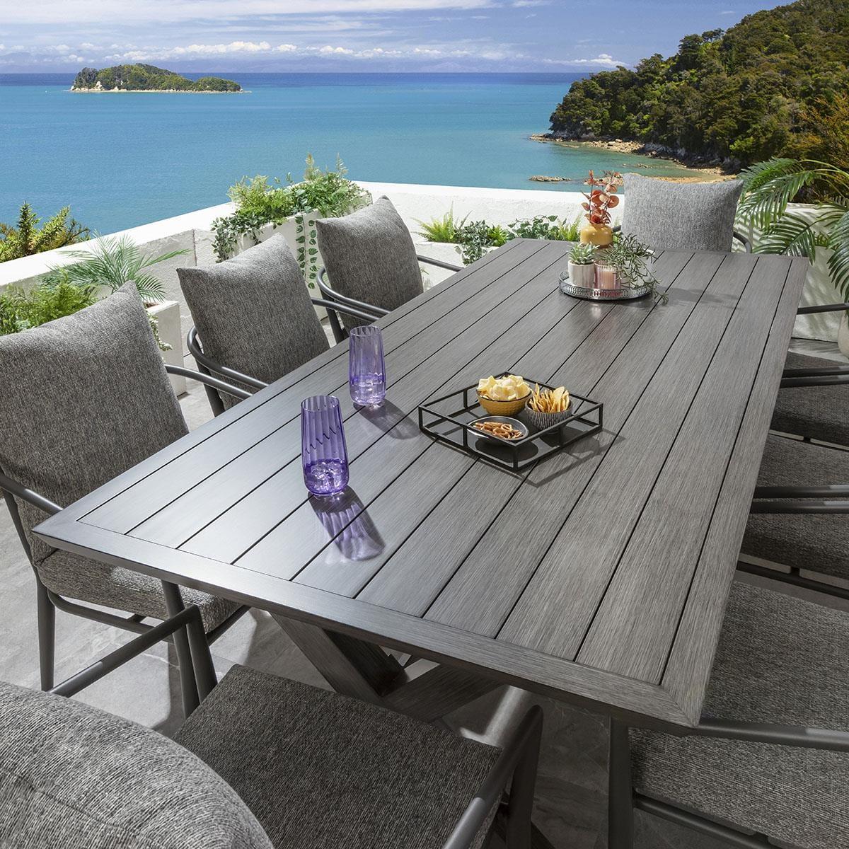 The Star 220cm modern garden dining table boasts a farmhouse-inspired design, featuring a grey smoked wood effect finish, and distinctive Cross X-leg design. Crafted from full aluminium, this weatherproof 8-seater outdoor table is designed to withstand the elements, allowing you to leave it uncovered year-round. The table's design seamlessly blends modern aesthetics with farmhouse charm, making it a versatile choice for various outdoor settings. The sleek smoked wood effect finish adds a touch of sophistication, creating an inviting atmosphere for al fresco dining. The Cross X-leg design not only enhances the table's visual appeal but also provides stability, ensuring a durable and long-lasting addition to your outdoor space. The use of aluminium not only contributes to the outdoor table's modern aesthetic but also ensures its weatherproof durability. This feature makes the table resistant to rust and corrosion, allowing you to enjoy worry-free outdoor dining for years to come. The lightweight nature of aluminium also makes it easy to move and rearrange your outdoor space as needed. Measuring 220cm in length, this garden dining table is the perfect size for hosting gatherings of up to 8 people. Whether you're enjoying a family dinner or entertaining guests, this 8-seater dining table provides ample space for a comfortable dining experience. W220cm D93cm H76cm Full Aluminium 8 Seater Dining Table
