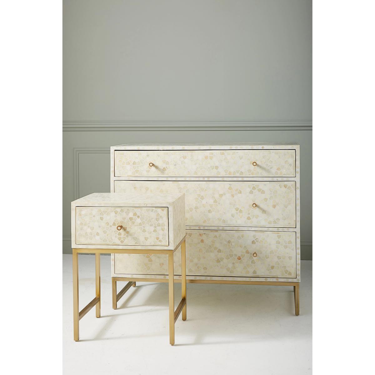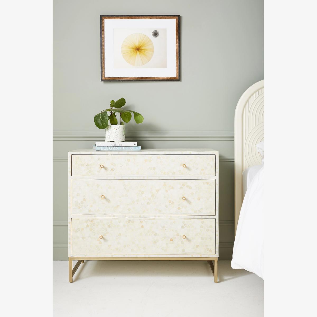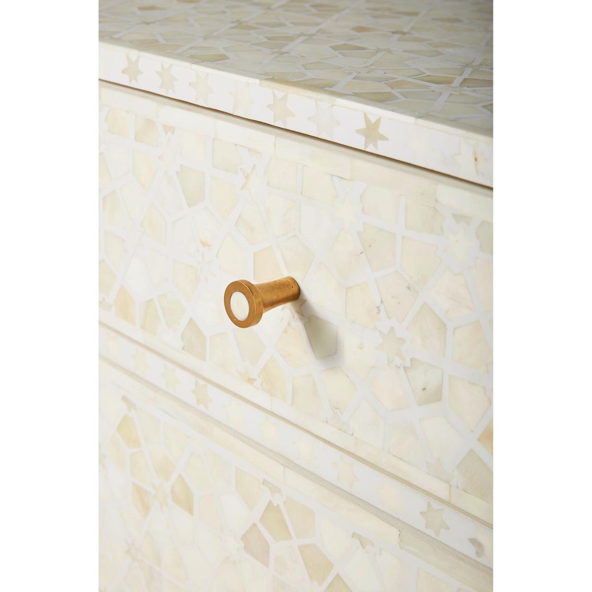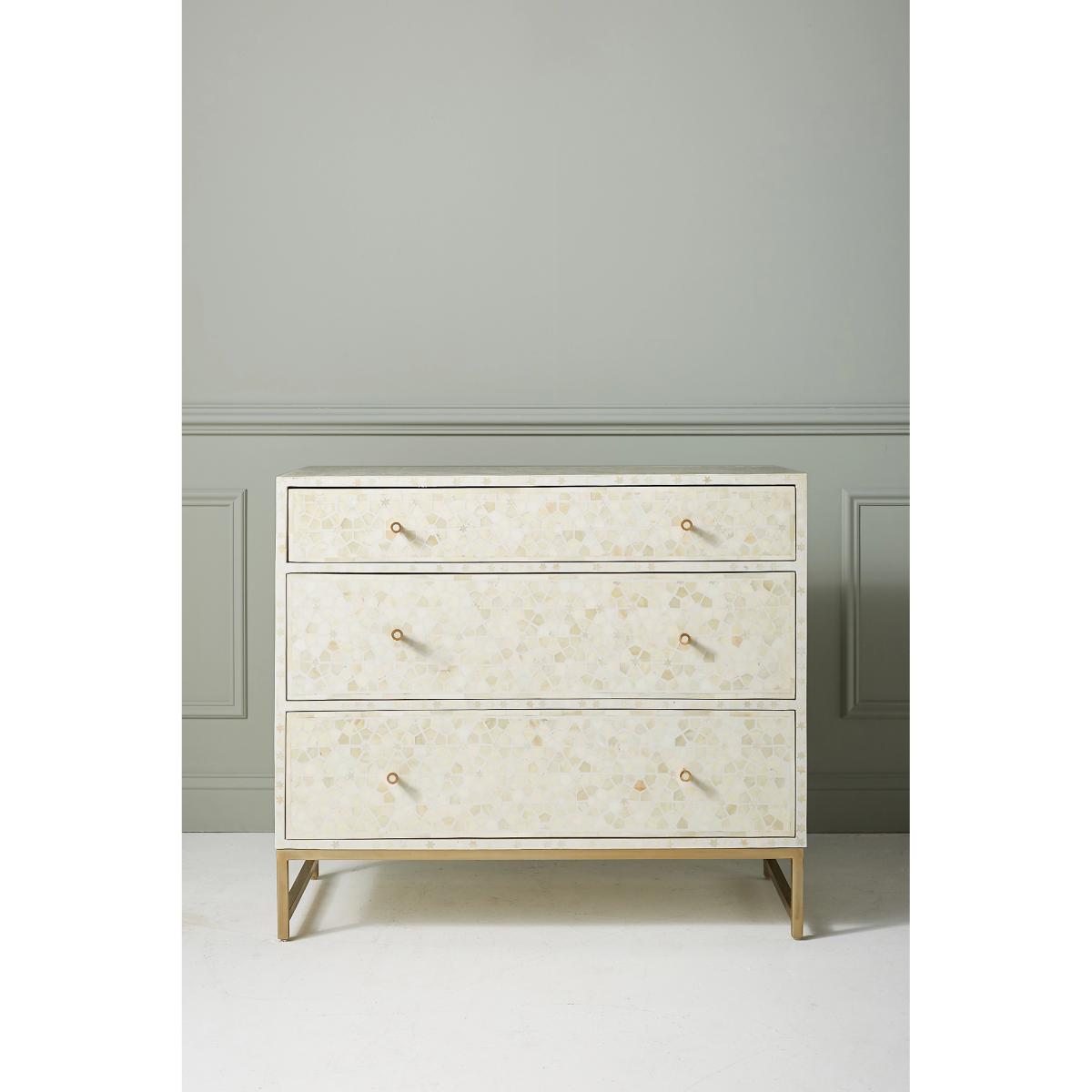 We love finding new ways for you to update your home, and this three-drawer dresser is one of the most luxurious ways of doing so. It's beautifully crafted by hand from engineered mango wood that's noted for it's durability and is polished with white resin, shiny brass hardware and bone inlay. * Exclusive to Anthropologie * Online only * Furniture pieces weighing over 30kg include delivery to your room of choice and packaging removal * Handcrafted bone inlay and resin three-drawer dresser with polished brass base and hardware * Due to the handcrafted nature of this item, expect slight variation in the appearance of each unique piece * Dusting is best done with a soft, lint-free cloth. * Wipe gently with a warm, damp cloth. * Dry immediately after cleaning. * If a liquid spill occurs, prompt cleaning is advised. * Do not use harsh solvents or chemicals. * Do not place hot items directly on surface. * Avoid sliding objects on furniture's surface; always lift and place objects. * Do not place over heat or air conditioning vents * This piece is intended for indoor use * No assembly required * Imported