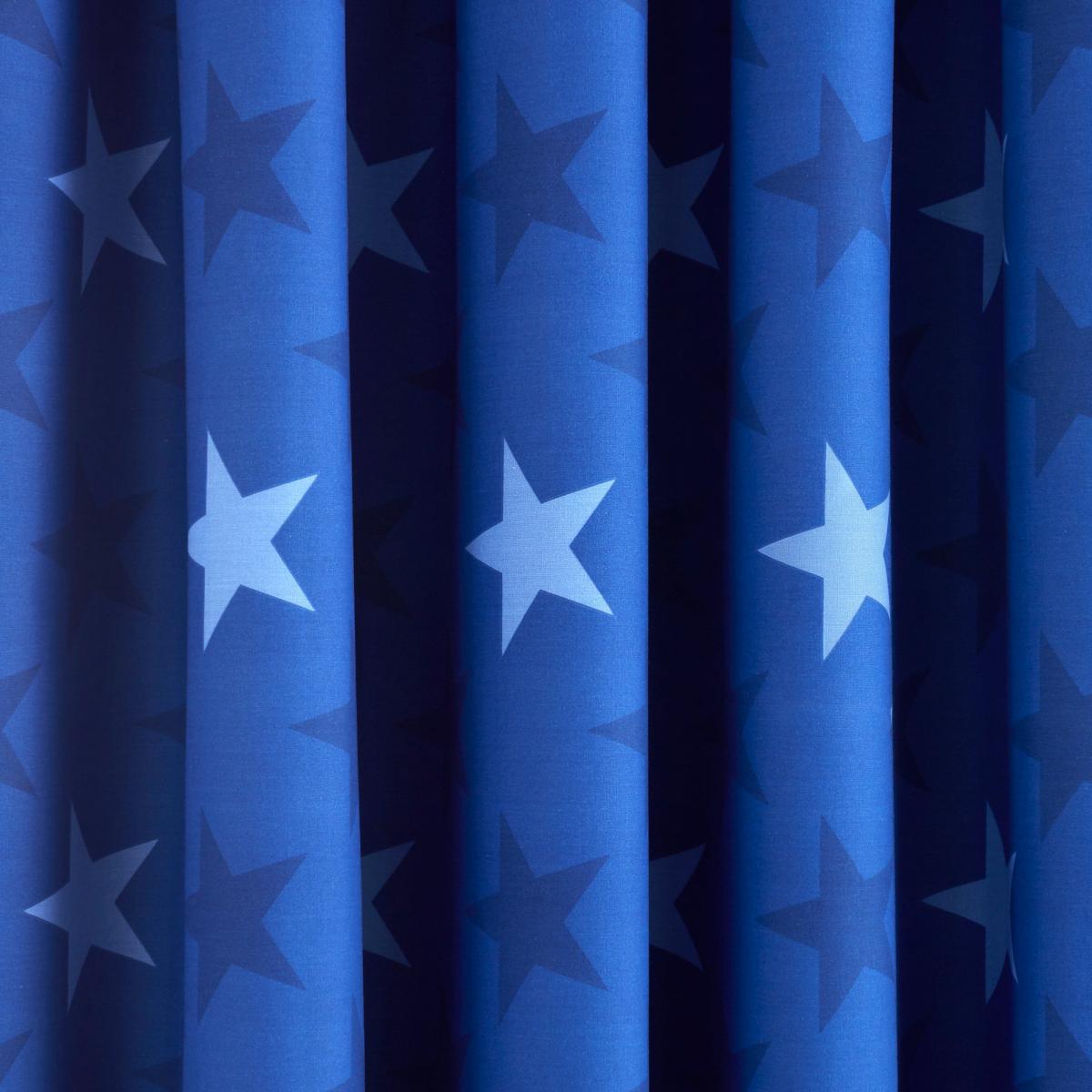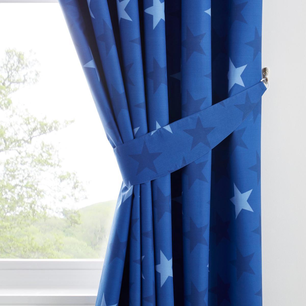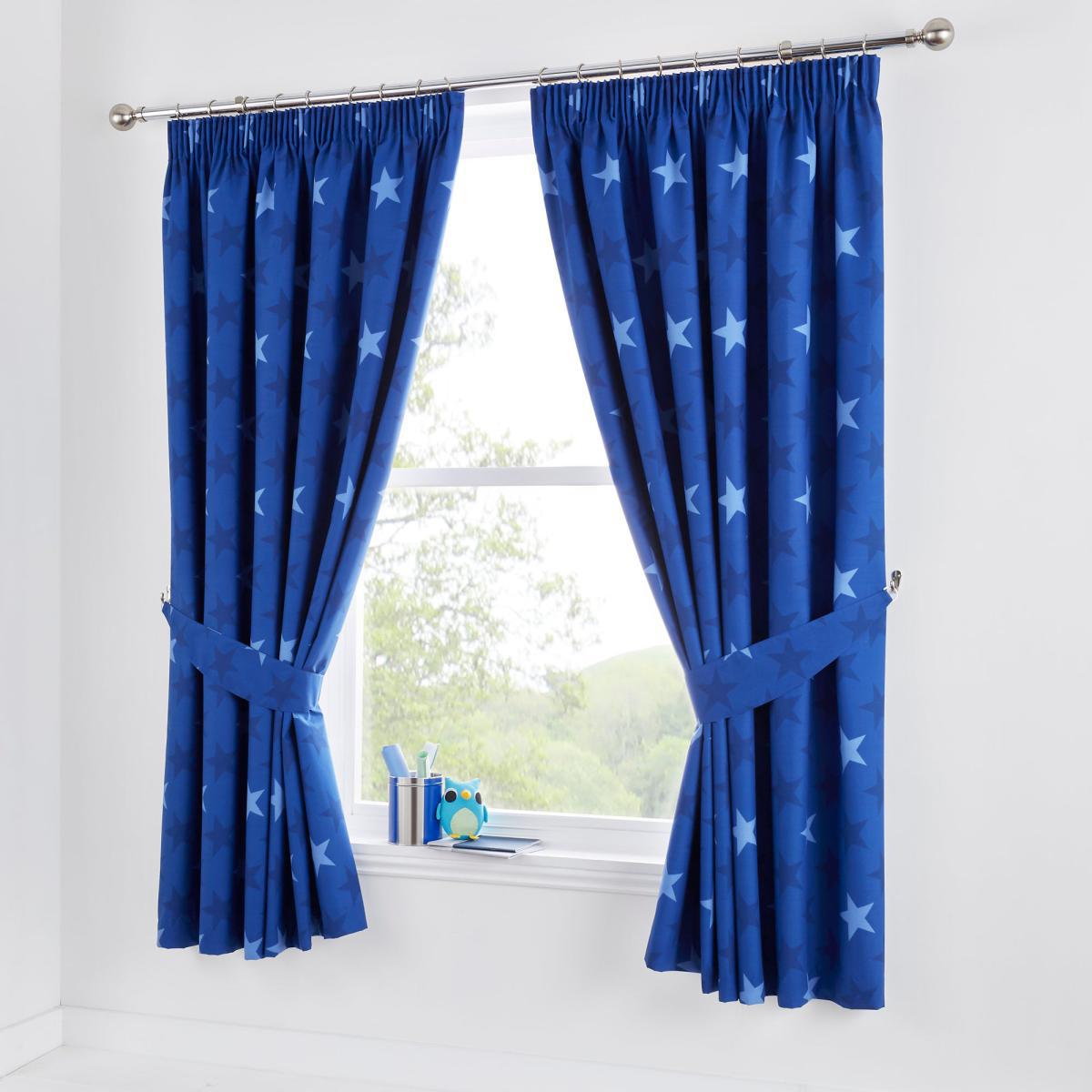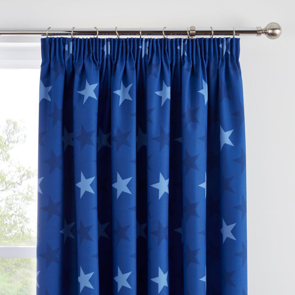 Finished with a pencil pleat header, this pair of navy curtains feature a star print pattern and are blackout lined to eliminate external light. With tiebacks included, this pair of curtains come in a selection of sizes and can be ironed for a crease free finish.