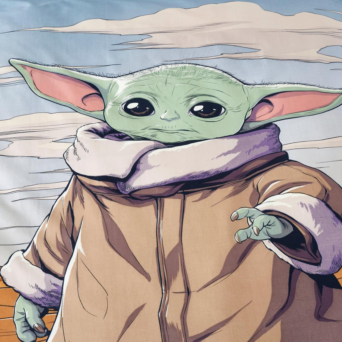 Add a touch of adventure to your child's bedroom with this Star Wars Baby Yoda Duvet Cover and Pillowcase Set. With a reversible design, you can choose between two cute baby Yoda designs. Made from 100% cotton this bedding set is soft, durable and machine washable. This Collection is verified by OEKO-TEX® and independently tested for harmful substances. It stands for customer confidence and high product safety.