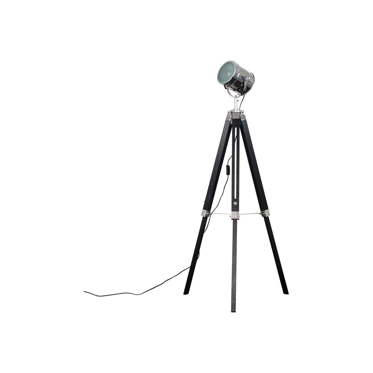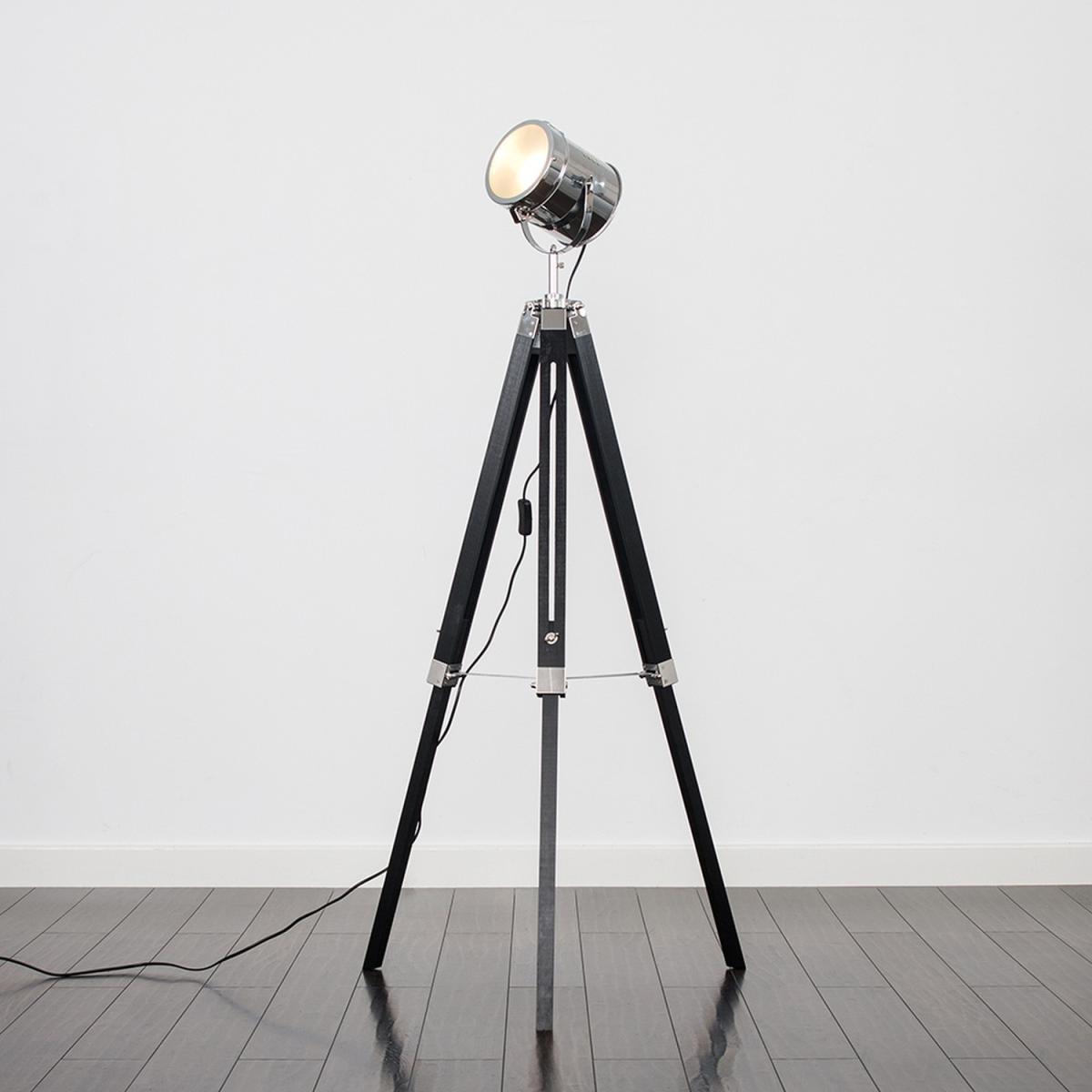 This stylish tripod floor lamp comes in a matt black wood chrome metal finish and features a polished chrome photography film set style spotlight head. The quirky industrial design of this lamp is guaranteed to make a statement in any room of your home. Features a fully adjustable lamp head which gives you full control of the light direction. It has an in line onoff switch for ease of use. Ideal for lounges, dining rooms, bedrooms and more!