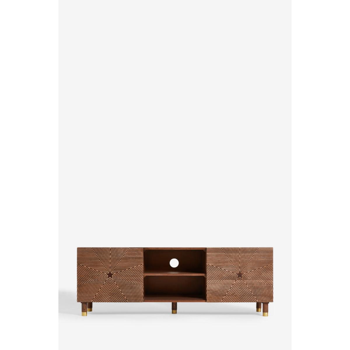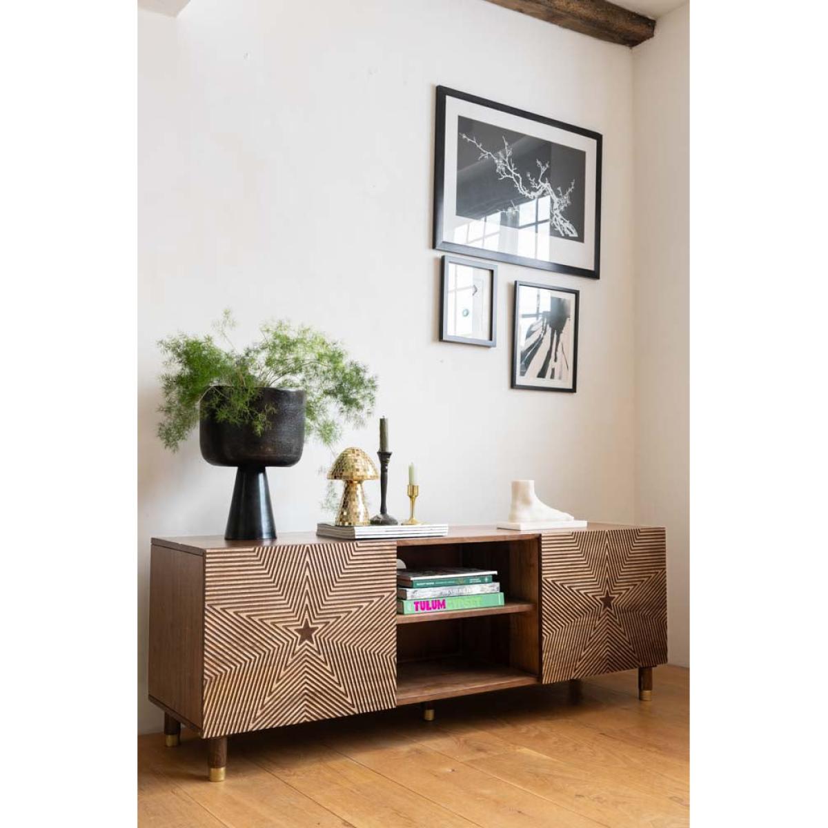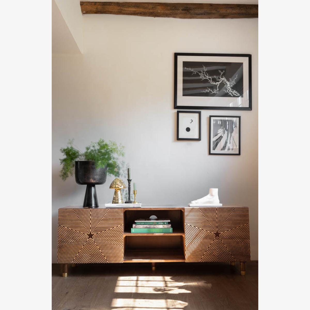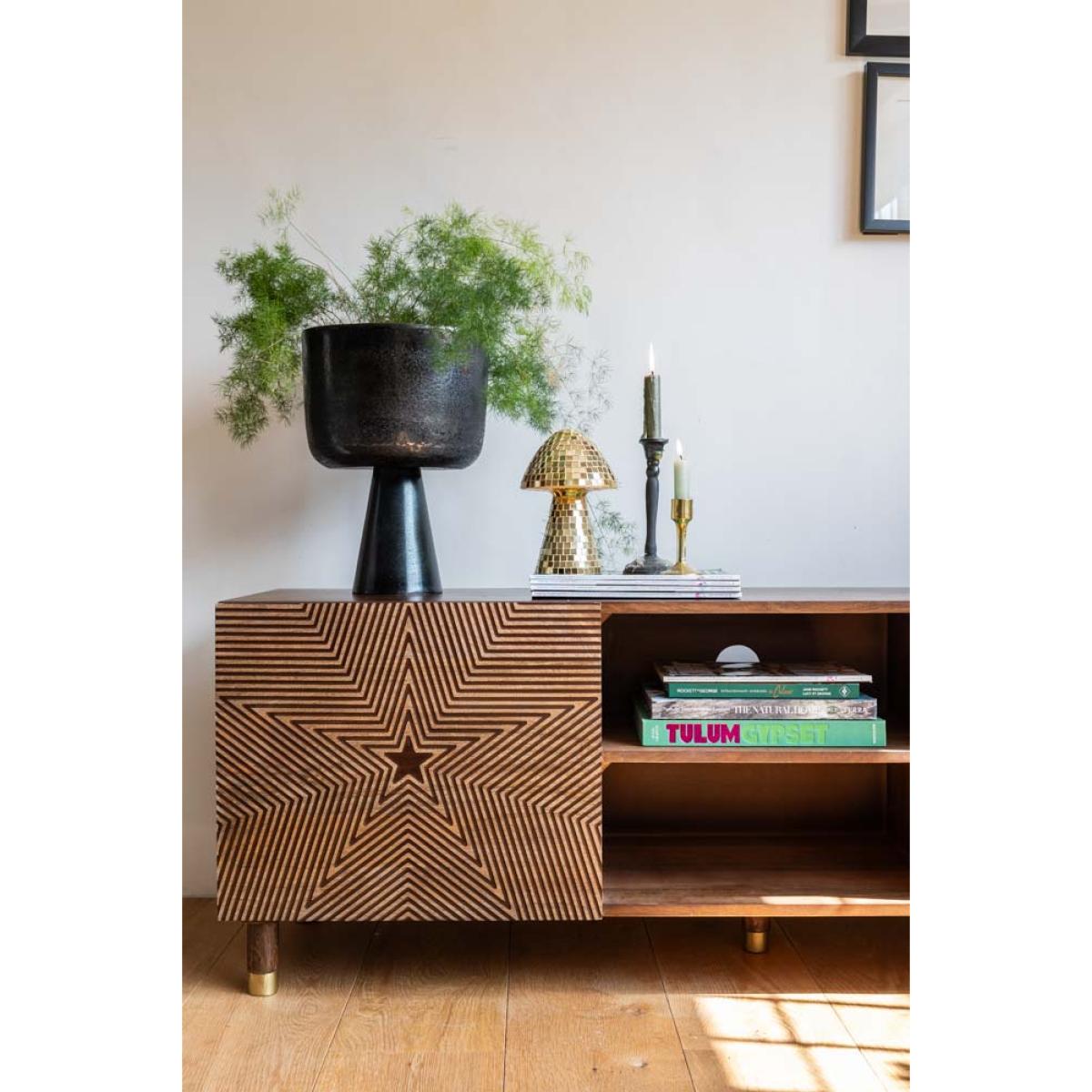 There’s a psychedelic quality to the design of this TV unit that we could gaze at all day, whether the TV’s on or not! It’s a mesmerising piece of work that’s classic Rockett St George, marrying quality with incredible creativity, and, of course, practicality. This is a sturdy but slimline unit that fits any space perfectly, and it's designed to house all your TV tech so everything is to hand without being on show. Made from mango wood, two roomy cupboards provide ample space for remote controls or gaming consoles, while the two shelves in the middle are perfect for your entertainment hub. The starburst detailing on the cupboard doors makes this piece pop, and contrasts beautifully with the smooth contours of the top of the unit. The legs are classic mid-century, and finished with a splash of gold that complements the starbursts beautifully. An elegant piece that elevates the everyday into something truly special. - Starburst TV Unit- Material: Mango wood, MDF - Measures: W150cm x H52cm x D40cm