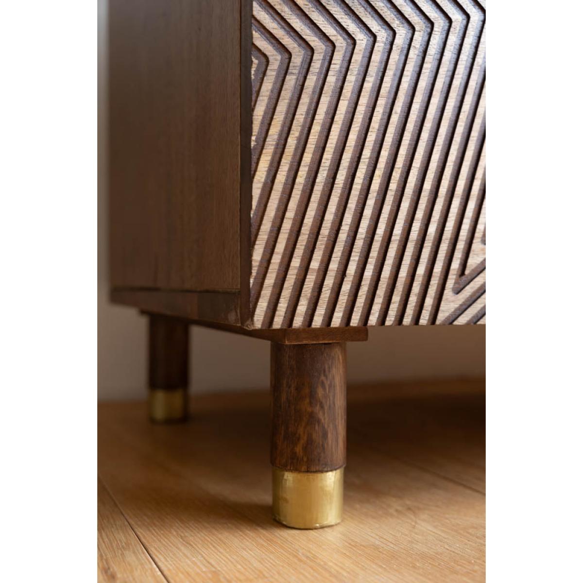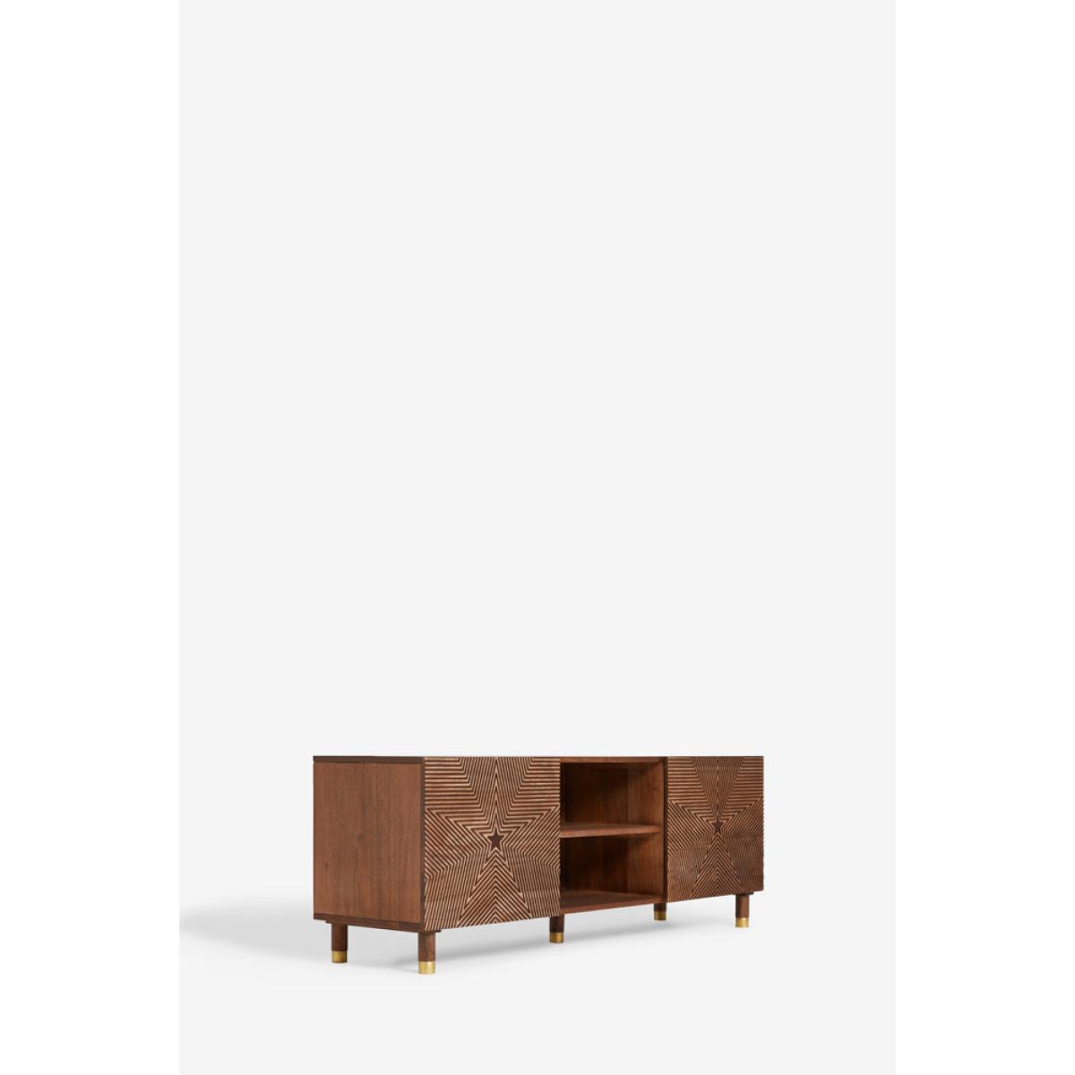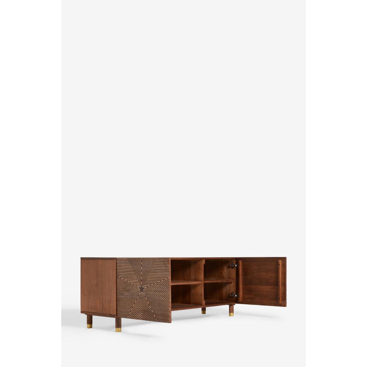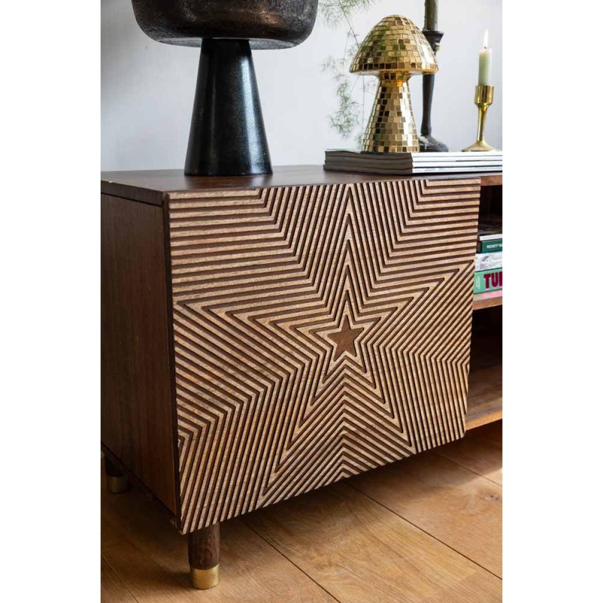 There’s a psychedelic quality to the design of this TV unit that we could gaze at all day, whether the TV’s on or not! It’s a mesmerising piece of work that’s classic Rockett St George, marrying quality with incredible creativity, and, of course, practicality. This is a sturdy but slimline unit that fits any space perfectly, and it's designed to house all your TV tech so everything is to hand without being on show. Made from mango wood, two roomy cupboards provide ample space for remote controls or gaming consoles, while the two shelves in the middle are perfect for your entertainment hub. The starburst detailing on the cupboard doors makes this piece pop, and contrasts beautifully with the smooth contours of the top of the unit. The legs are classic mid-century, and finished with a splash of gold that complements the starbursts beautifully. An elegant piece that elevates the everyday into something truly special. - Starburst TV Unit- Material: Mango wood, MDF - Measures: W150cm x H52cm x D40cm