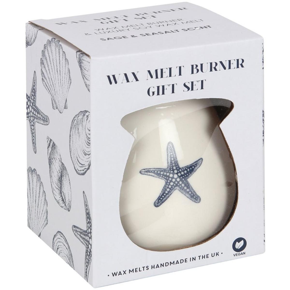 This wax melt burner gift set includes a simple starfish burner and a matching starfish-shaped wax melt in a Sea Salt and Sage fragrance. Beautifully presented in a lovely gift box and makes a lovely gift for those who love the seaside. The wax melts are hand poured in the UK from high-quality soy wax and premium fragrance.