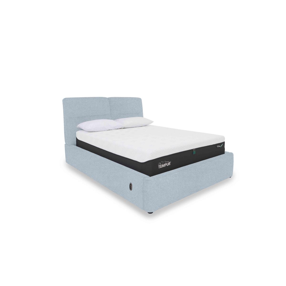 Well-crafted and thoughtfully designed, our Stark range makes it easy to transform your bedroom in more ways than one. This collection of contemporary ottoman bed frames and blanket boxes showcases beautifully cushioned curves and, at the same, significantly increases your bedroom’s storage capacity ensuring that it stays stylishly clutter-free and is always the haven of calm relaxation that you want it to be. Ottoman bed frames are available with your choice of electric or manual lifting mechanism and in both 100% leather and beautiful fabric. The Stark range is exclusively available at Furniture Village. Transform your bedroom with this fabulous ottoman storage bed frame and banish clutter forever. The electric mechanism makes life so easy. High-quality craftsmanship in a wide choice of fabrics. Why you'll love it Inviting contemporary bedroom style – with storage. The ultimate cushioned headboard and an all-round curvaceous profile. Electric mechanism makes opening and closing this ottoman frame bed quick and easy. Touch-button control panel includes a safety locking feature and even a USB port. Upholstered in high-quality fabric. Exceptionally wide choice of fashionable colours. Robust construction with a sturdy slatted wood base for optimal mattress support. Storage compartment is the same footprint as the bed frame for maximum capacity. It’s the perfect storage place for lightweight items like duvets, pillows and clothing. Also offered with 100% leather upholstery. Available in king and super king bed sizes. A Furniture Village exclusive. This fabric electric ottoman bed frame is part of our Stark range. What you need to know Mattress sold separately. Maximum mattress weight is 80 kg for both king and super king bed frames. Please keep hands clear of the mechanism when opening and closing the ottoman. Do not sit on the foot end of this ottoman bed frame when opening. Clean regularly using a soft brush or vacuum with the curtain attachment. Deal with any spills promptly. Professional cleaning advised for oil- and grease-based stains. Some fabrics can show wear on areas of more use or in direct sunlight.