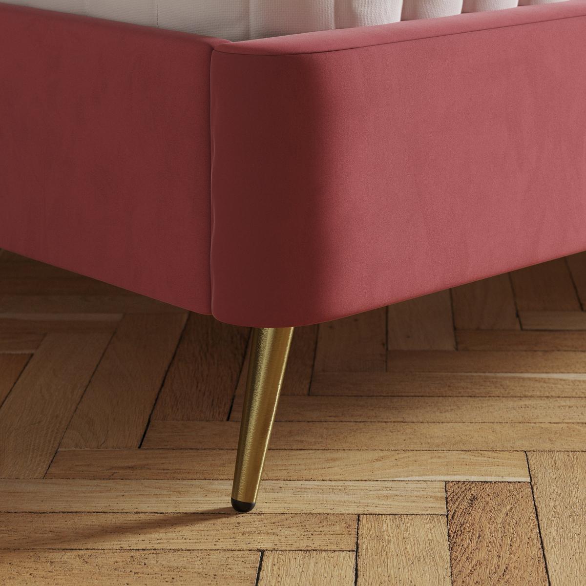 * Soft Velvet upholstered headboard* Sprung slatted base* Metal legs Upholstered in an opulently soft velvet fabric, this bed brings a touch of elegance and sophistication to your space. The curved headboard, adorned with subtle pleats, adds an element of texture and style, creating a serene focal point in your bedroom. Its sleek, solid wood legs provide a sturdy foundation while complementing the overall look with their natural finish. Designed for both comfort and convenience, the bed features a sprung slatted base that offers enhanced support and flexibility, ensuring a restful night’s sleep.