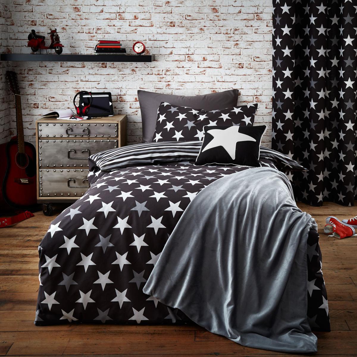 Featuring a white and grey star pattern on one side and a striped pattern on the other, this black duvet set is available in a choice of sizes and is crafted from soft, long-lasting polycotton.