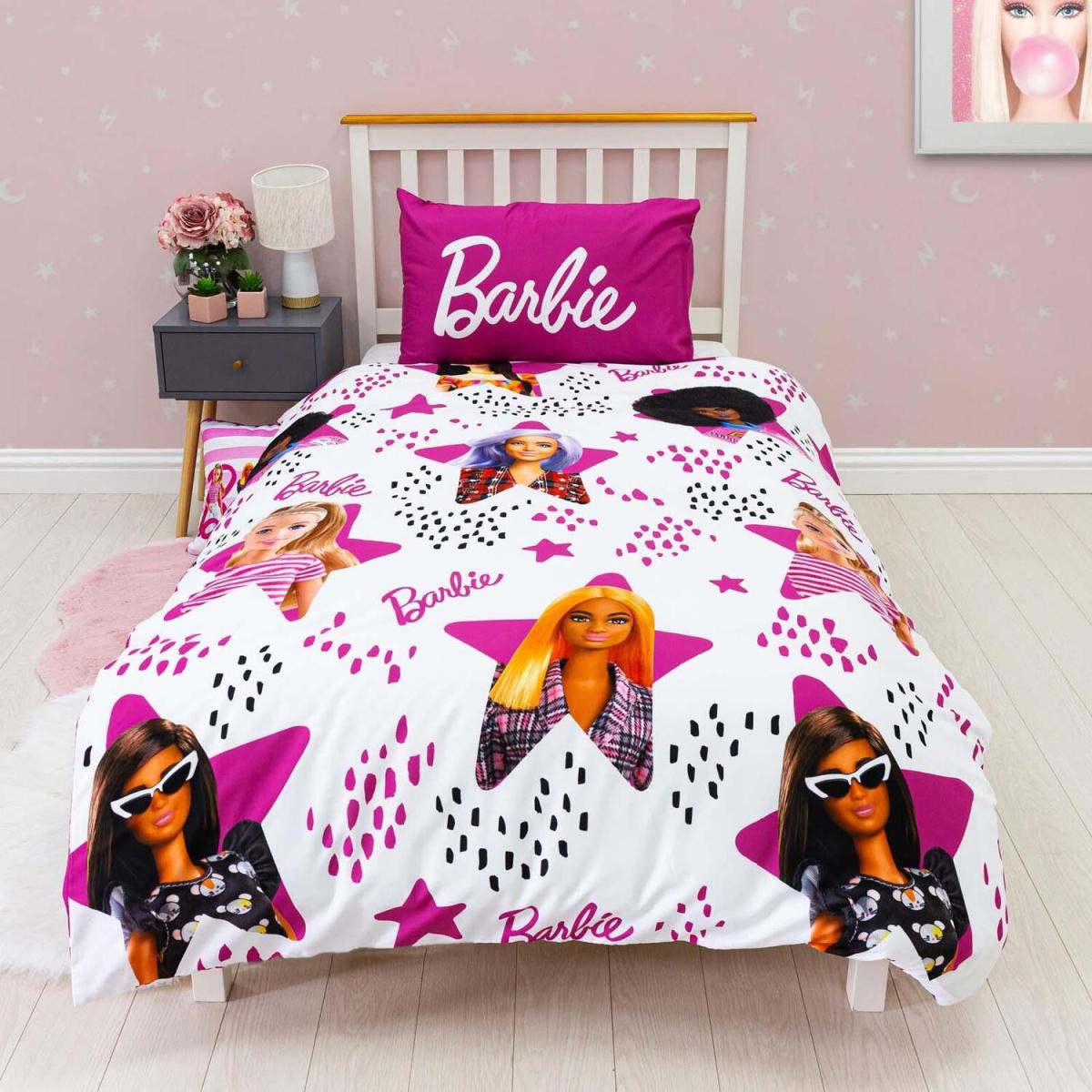 I love the Stars duvet cover set because it adds a fun, youthful touch to a child's bedroom with its vibrant pink colour and playful Barbie theme. It works particularly well in contemporary or playful interiors that embrace bright colours and themed decor. For practical styling, pair it with solid-coloured accessories in shades like white, grey, or pink to keep the look fresh and balanced. Adding plush pillows or a coordinating throw can enhance comfort and visual appeal, making it an inviting space for little ones who love the Barbie universe. This bedding set is perfect for creating a cheerful, lively bedroom environment that's both stylish and fun.