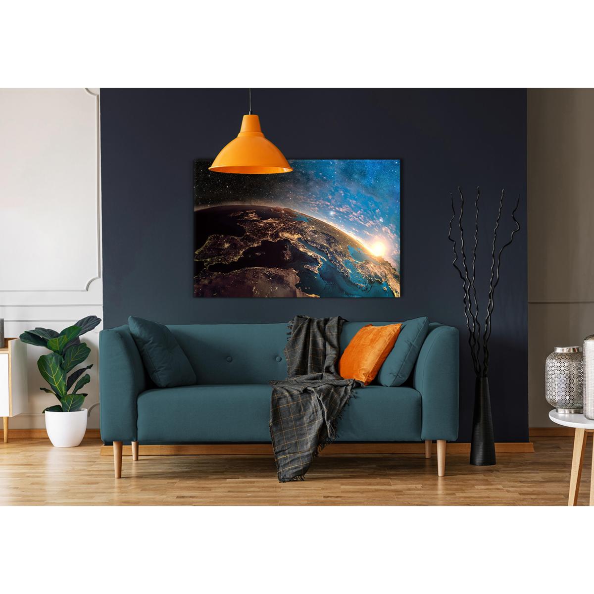 This striking glass art is truly out of this world, with vivid colours and a luminous, glossy finish. Gaze down on the Earth from the comfort of your own home. Why you'll love it. Escape to the stars with this fabulous wall art. The printing technology used ensures an extraordinary depth of colour. Printed on silver foil attached to 4 mm toughened glass. Smart hanging mounts allow this wall art to be hung completely flat. This piece of glass art is part of the Furniture Village wall art collection. What you need to know. Hanging fittings are included. Dust with a soft, clean, lint-free cloth. Dimensions. Width: 120 cm (48 inches). Height: 80 cm (32 inches).