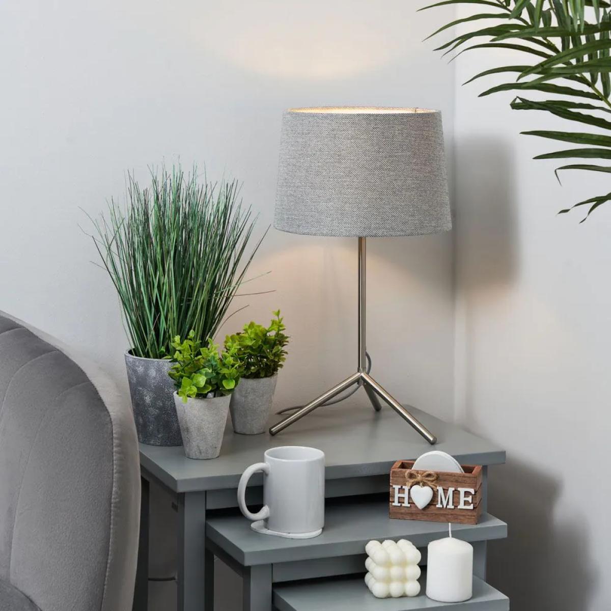 Add a touch of modernity to your table settings with the Stassy Tripod Feet Table Lamp in Satin Nickel and Grey. The sleek satin nickel finish pairs beautifully with the grey shade, creating a harmonious and stylish look. With its tripod design, this lamp becomes a unique and functional addition to your interior.