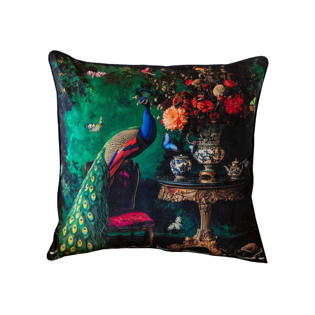 An ultra-soft cushion that features a beautifully detailed peacock design that brings an exotic charm to your bed, sofa or armchair. Why you'll love it Vibrant cushion showing a majestic peacock. Upholstered in beautifully soft French velvet. Reverses to a plain fabric. 100% feather filling for extra comfort. The cushion is part of the Furniture Village home accessories collection. What you need to know Feather filling. For indoor use only. Plump regularly. Some fabrics can show wear on areas of more use or in direct sunlight. Deal with any spills promptly. Professional cleaning advised for oil- and grease-based stains. Please read our upholstery care guide for more advice. Dimensions Height: 55 cm (22 in). Width: 55 cm (22 in). Depth: 10 cm (4 in). Item code: STHMPCUS--001