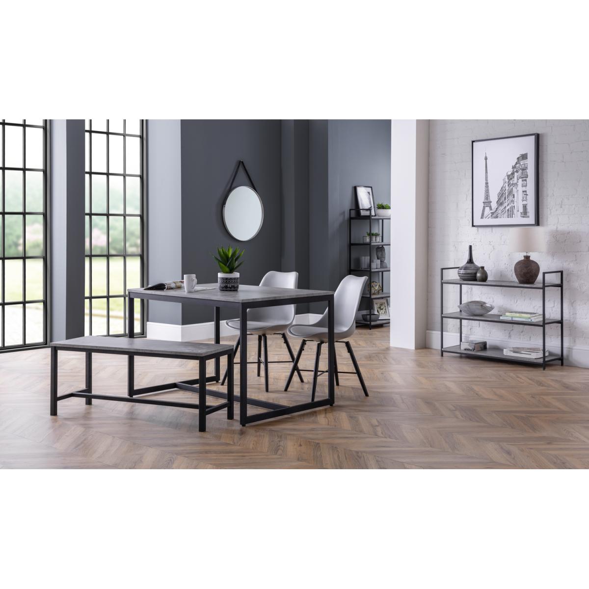 Simplistic in design with a contemporary style, the Staten Bench will add a stunning industrial look to any living and dining area. Constructed from a black coated metal frame, complemented by a striking concrete effect tops, to create a very stylish, modern product. Part of the Julian Bowen Staten Dining and Occasional Collection.