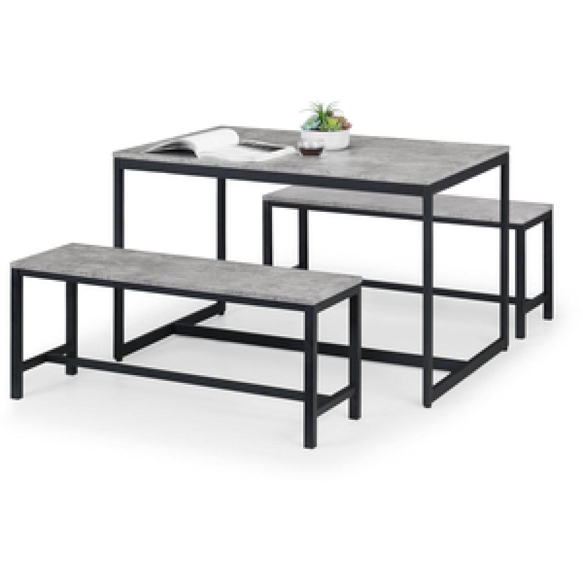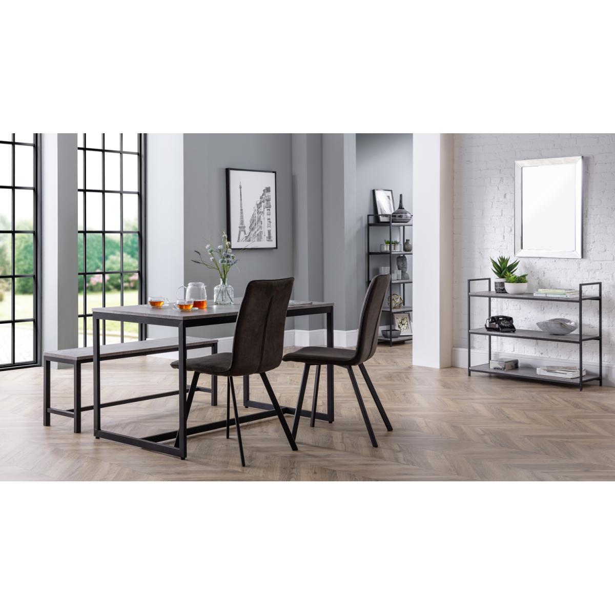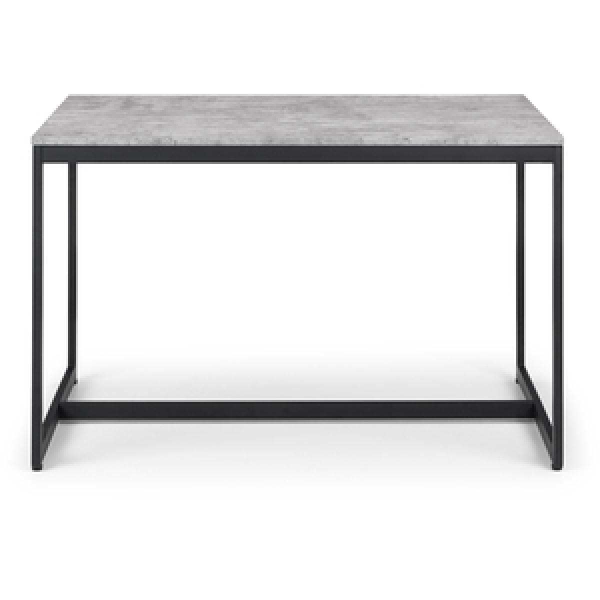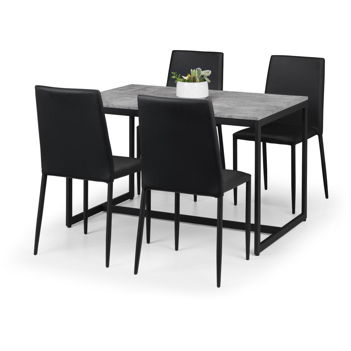 Simplistic in design with a contemporary style, the Staten Dining Table will add a stunning industrial look to any living and dining area. Constructed from a black coated metal frame, complemented by a striking concrete effect tops, to create a very stylish, modern product. Part of the Julian Bowen Staten Dining and Occasional Collection.