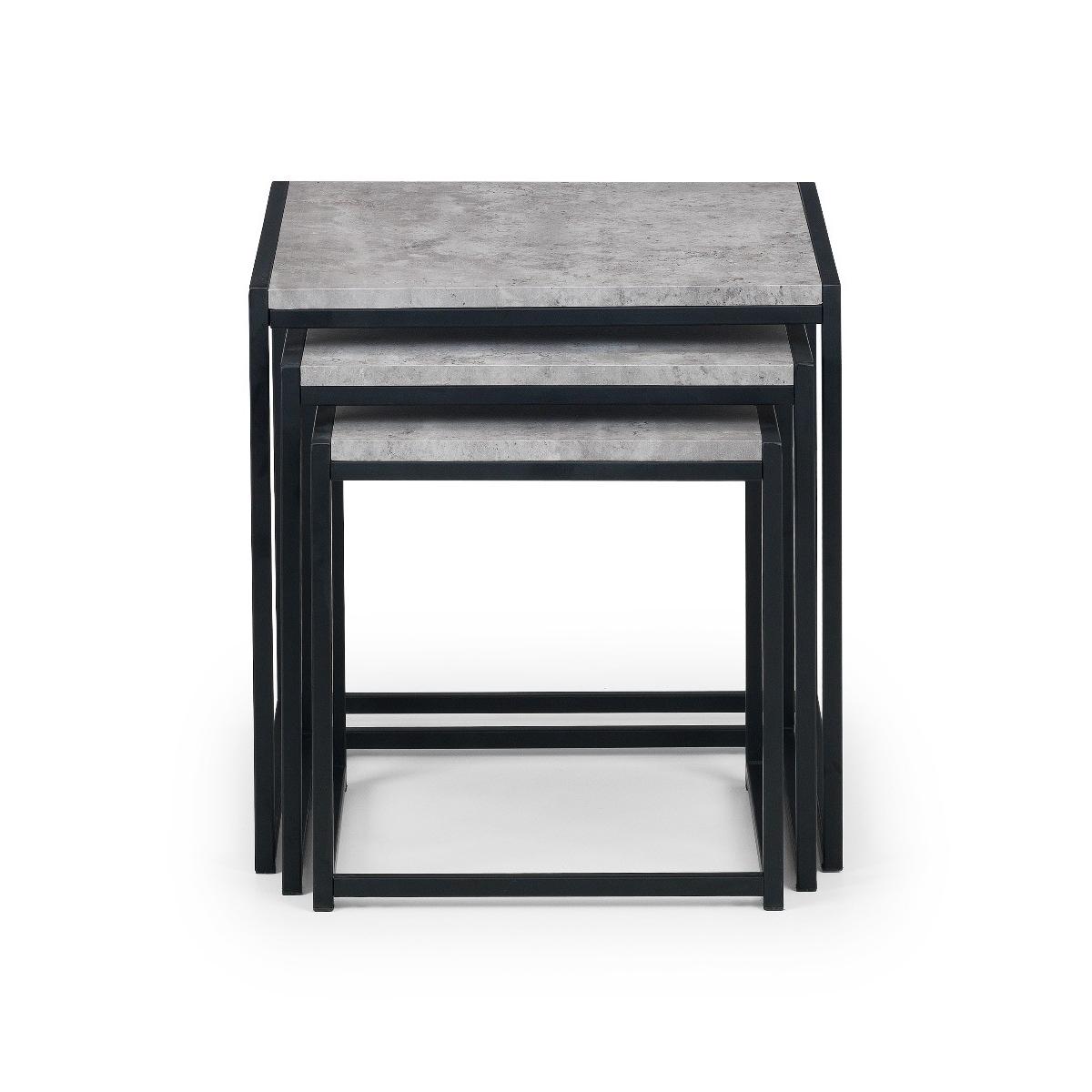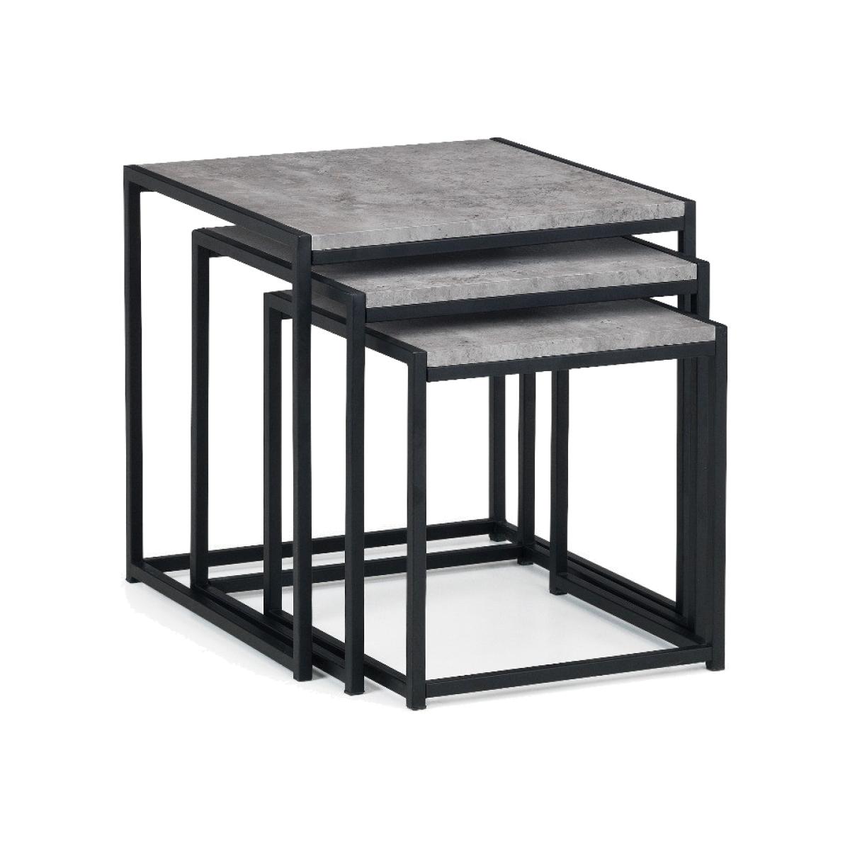 The Staten Concrete Nest of Tables in a contemporary and industrial styled occasional table set, perfect for many modern homes. The simple combination of a sleek black frame and concrete effect tabletops creates a stylish and striking addition to any modern home. Stylish nest of three occasional tables Sturdy black metal frame Concrete effect foil finish wrap to the tabletop Versatile set combines with many modern interiors