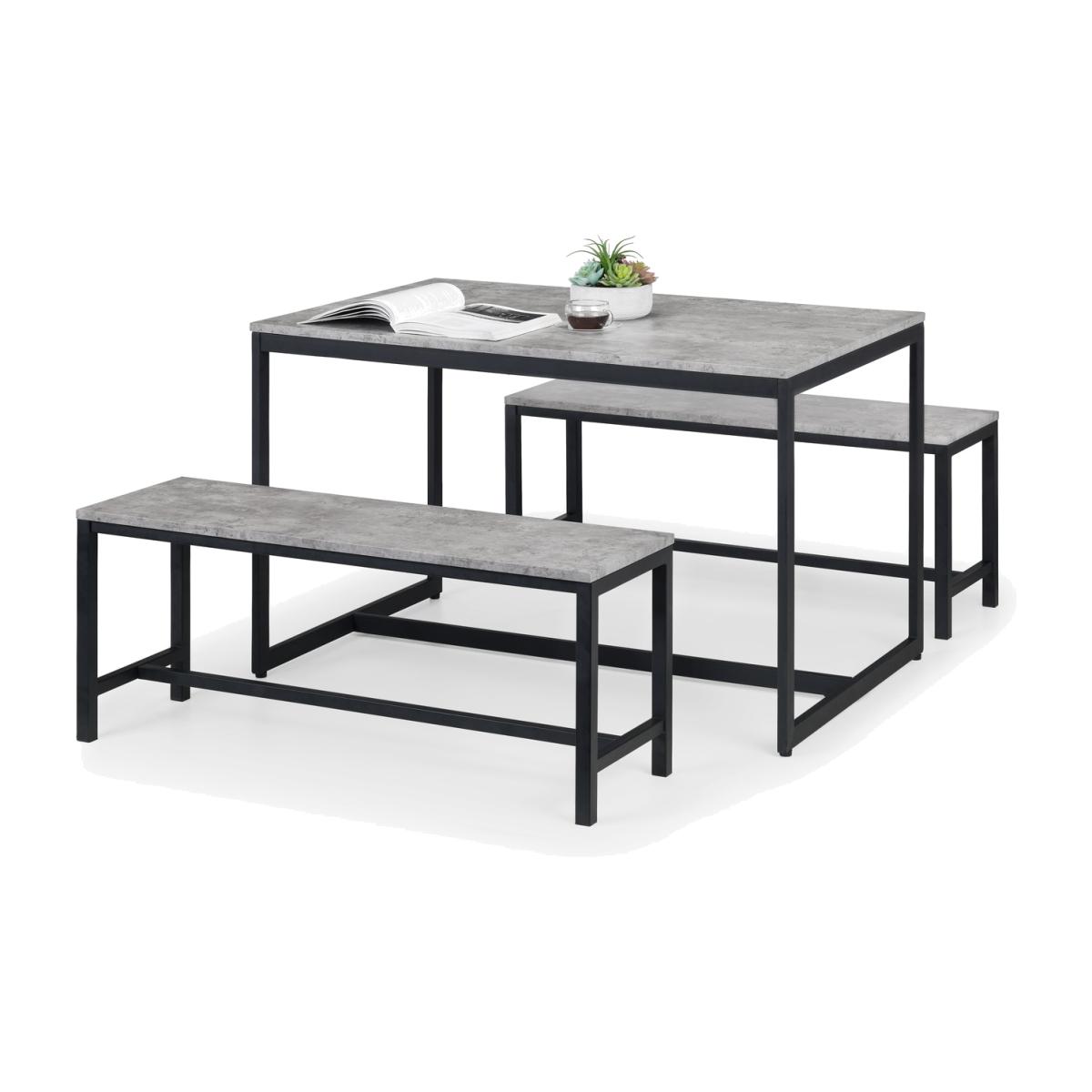 Table Dimensions H75 x W80 x D120cm Bench Dimensions H45cm x W110 x D36cm Simplistic in design with a contemporary style the Staten Dining Set will add a stunning industrial look to any living and dining area. Constructed from a black coated metal frame complemented by a striking concrete effect tops to create a very stylish modern product. Featured with two Staten benches. Features. Black coated metal frame and concrete effect foil. Strong and durable construction Modern design suitable for a range of décor Part of the Julian Bowen Staten dining and Occasional range. Assembly required..