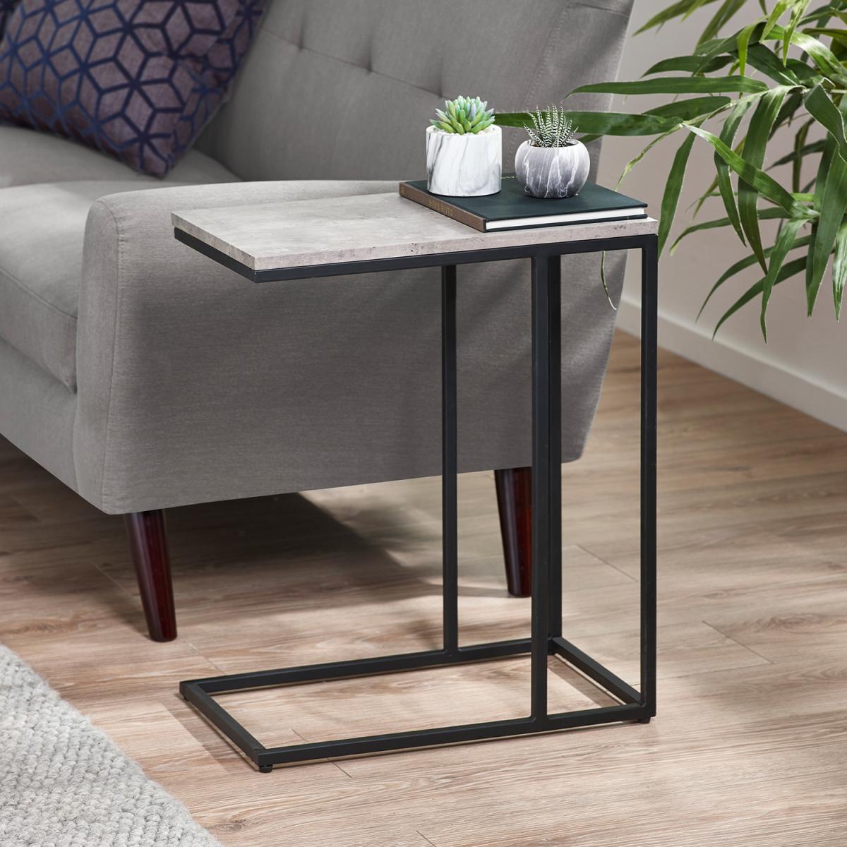 I love this side table because of its versatile concrete effect that adds a touch of industrial modernity without overpowering a space. It works particularly well in contemporary and minimalist interiors, where its sleek black frame offers a subtle contrast. For styling, I recommend pairing it with a mix of ceramic or glass accents, and perhaps a small plant or decorative book to soften the look. Practical tips include keeping the top clear for easy access to essentials or using it as a statement piece next to a sofa or armchair. Its understated design allows it to blend seamlessly into various room schemes, making it a functional yet stylish addition.