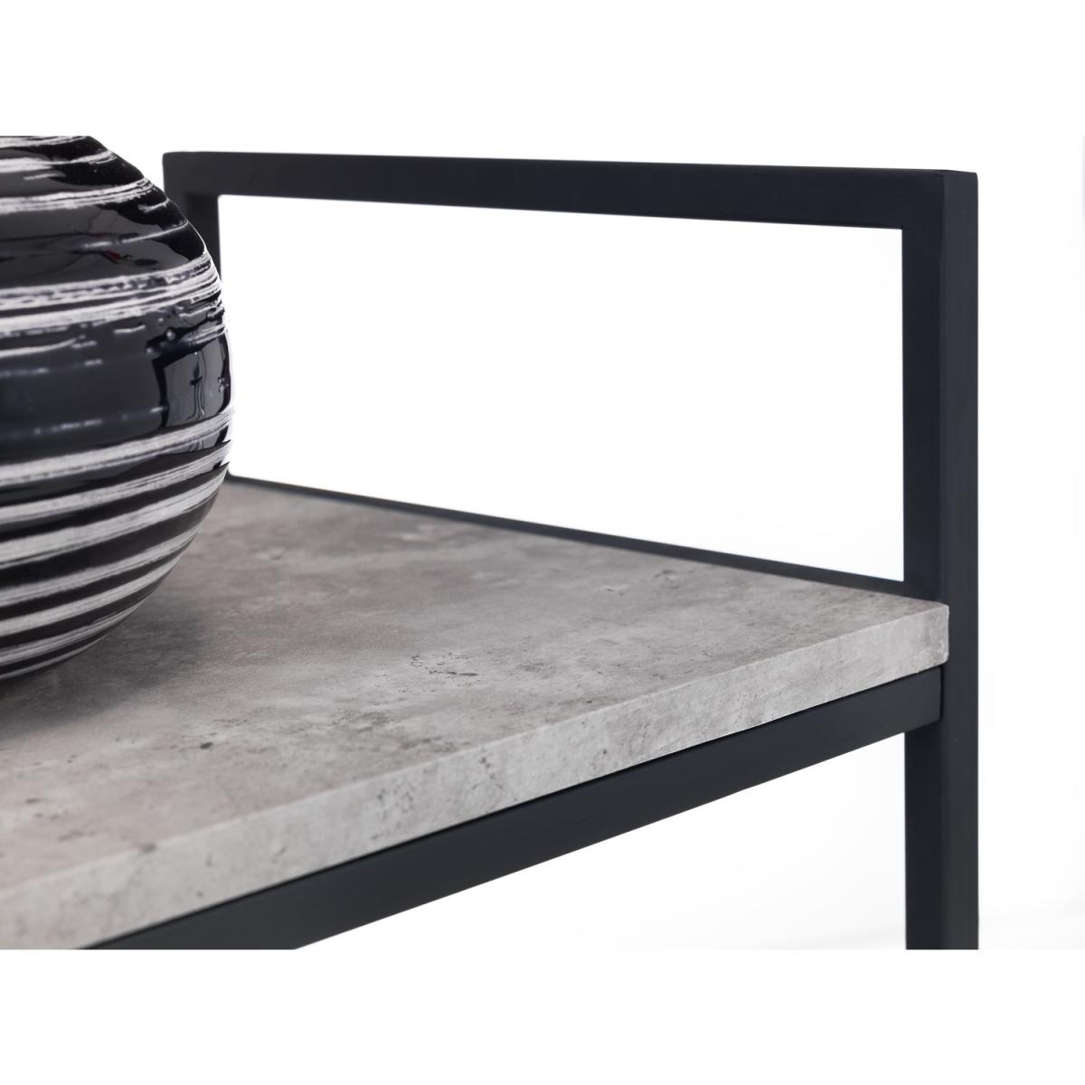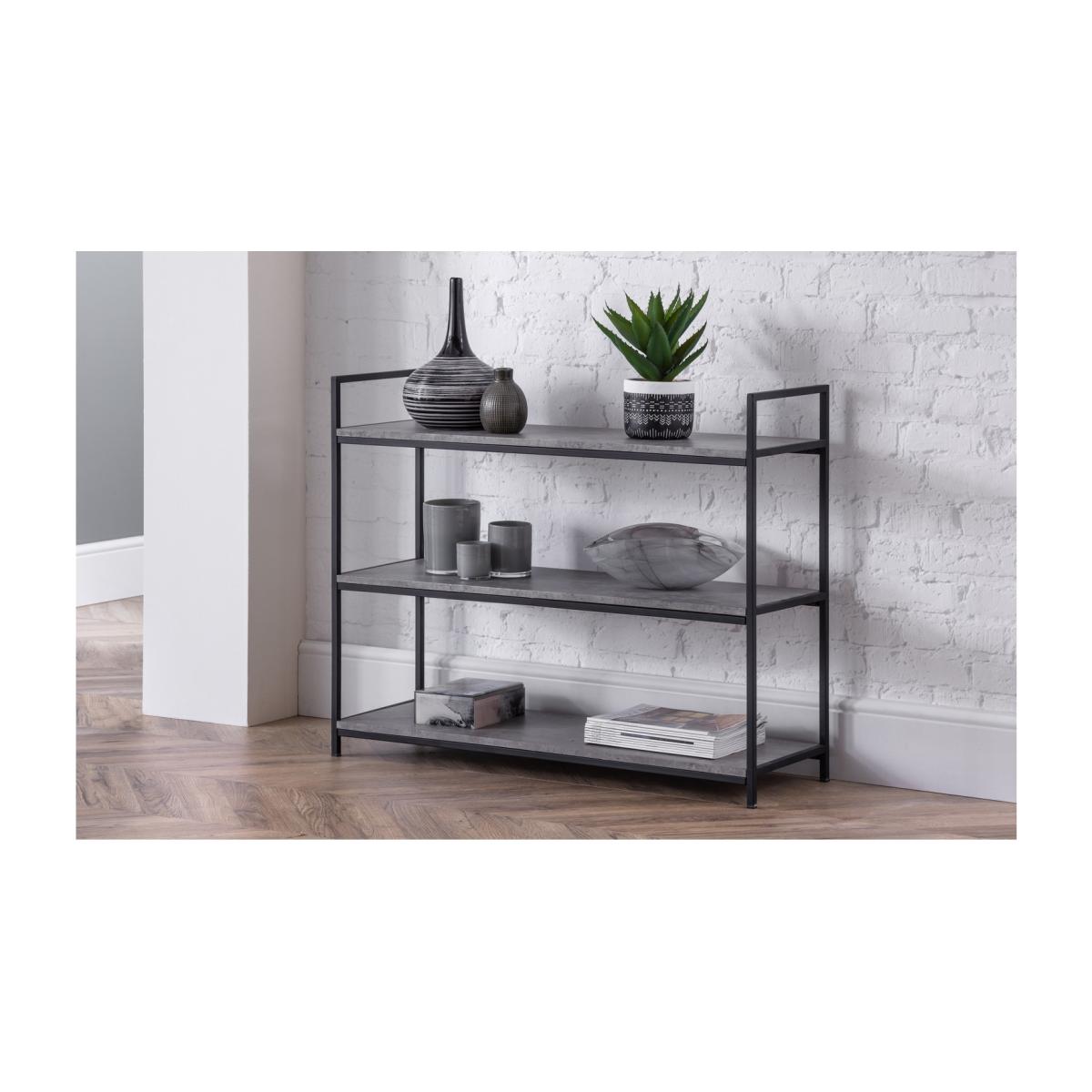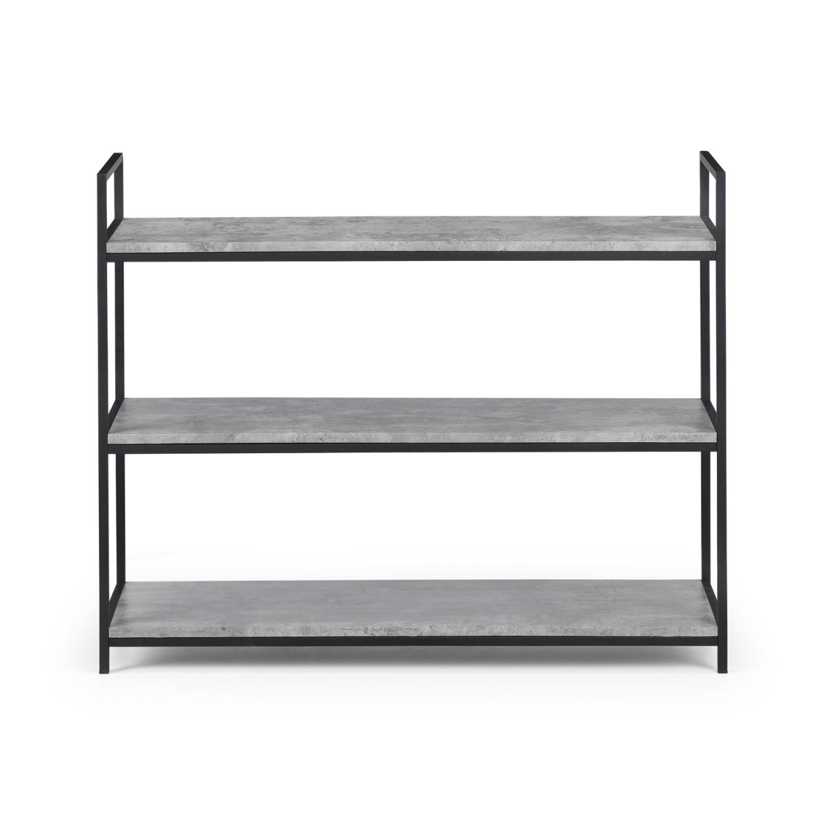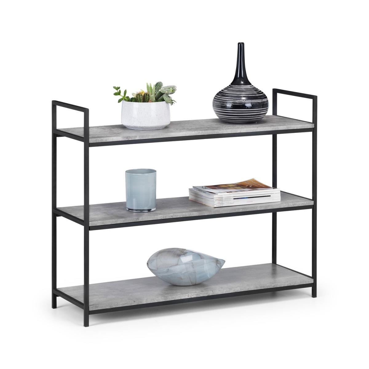 Dimensions W100cm x D32cm x H80cm. Simplistic in design with a contemporary style the Staten Low Bookcase will add a stunning industrial look to any living and dining area. Constructed from a black coated metal frame complemented by a striking concrete effect tops to create a very stylish modern product. Features. Three shelves. Concrete Effect Foil Black coated metal frame. Part of Julian Bowen's Staten contemporary Dining and; Occasional collection Assembly required..