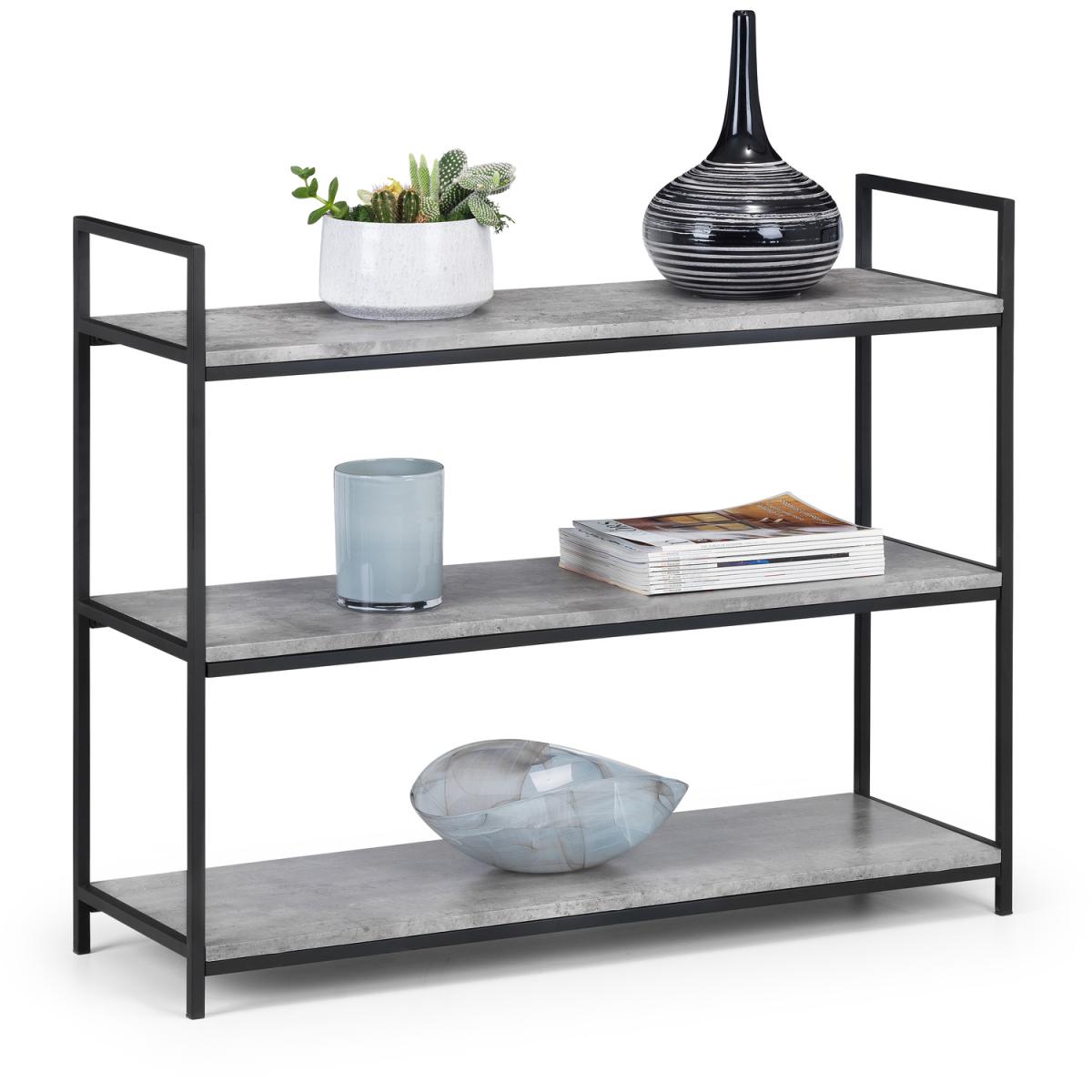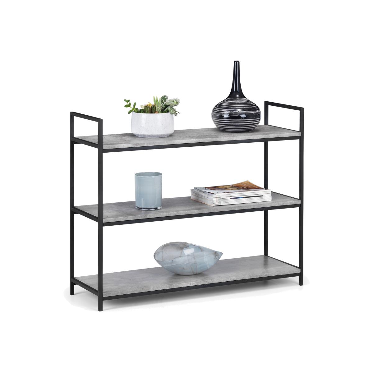 Simplistic in design with a contemporary style, the Staten Low Bookcase will add a stunning industrial look to any living and dining area. Constructed from a black coated metal frame, complemented by a striking concrete effect tops, to create a very stylish, modern product. Part of the Julian Bowen Staten Dining and Occasional Collection.
