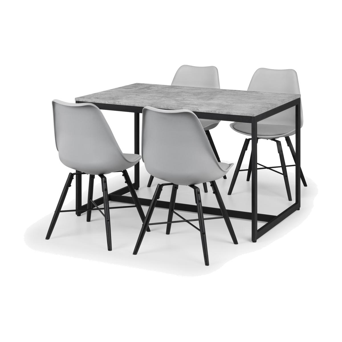 Simplistic in design with a contemporary style, the Staten Dining Table will add a stunning industrial look to any living and dining area. Constructed from a black coated metal frame, complemented by a striking concrete effect tops, to create a very stylish, modern product. Part of the Julian Bowen Staten Dining and Occasional Collection. Complemented by Kari chairs.